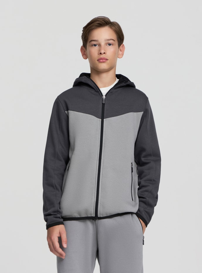 Kinder-Technischer Hoodie mit Kapuze und Reißverschluss, ideal für einen sportlichen und lässigen Look. Ausgestattet mit Reißverschlusstaschen, bietet er Praktikabilität und Sicherheit zum Verstauen kleiner Gegenstände. Das Blockfarben-Design verleiht ihm einen modernen und dynamischen Akzent. Perfekt für Outdoor-Aktivitäten oder Freizeit, lässt sich leicht mit Sporthosen oder Jeans kombinieren für ein bequemes und vielseitiges Outfit.