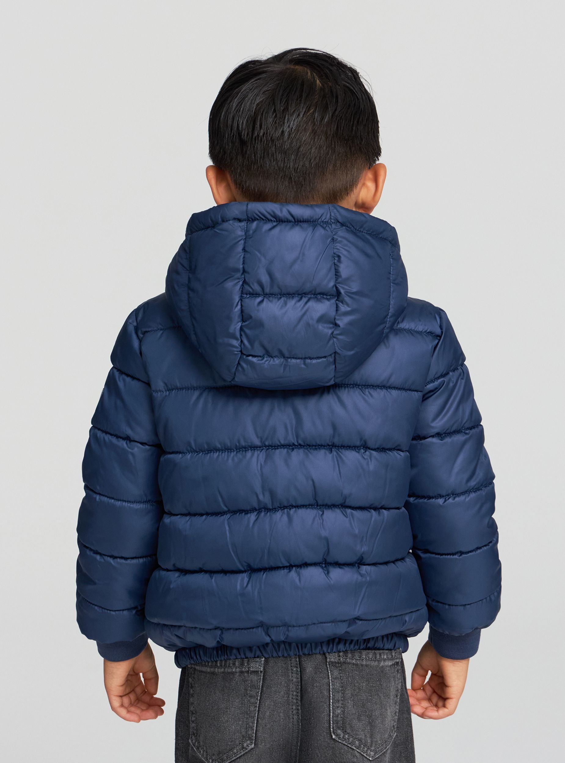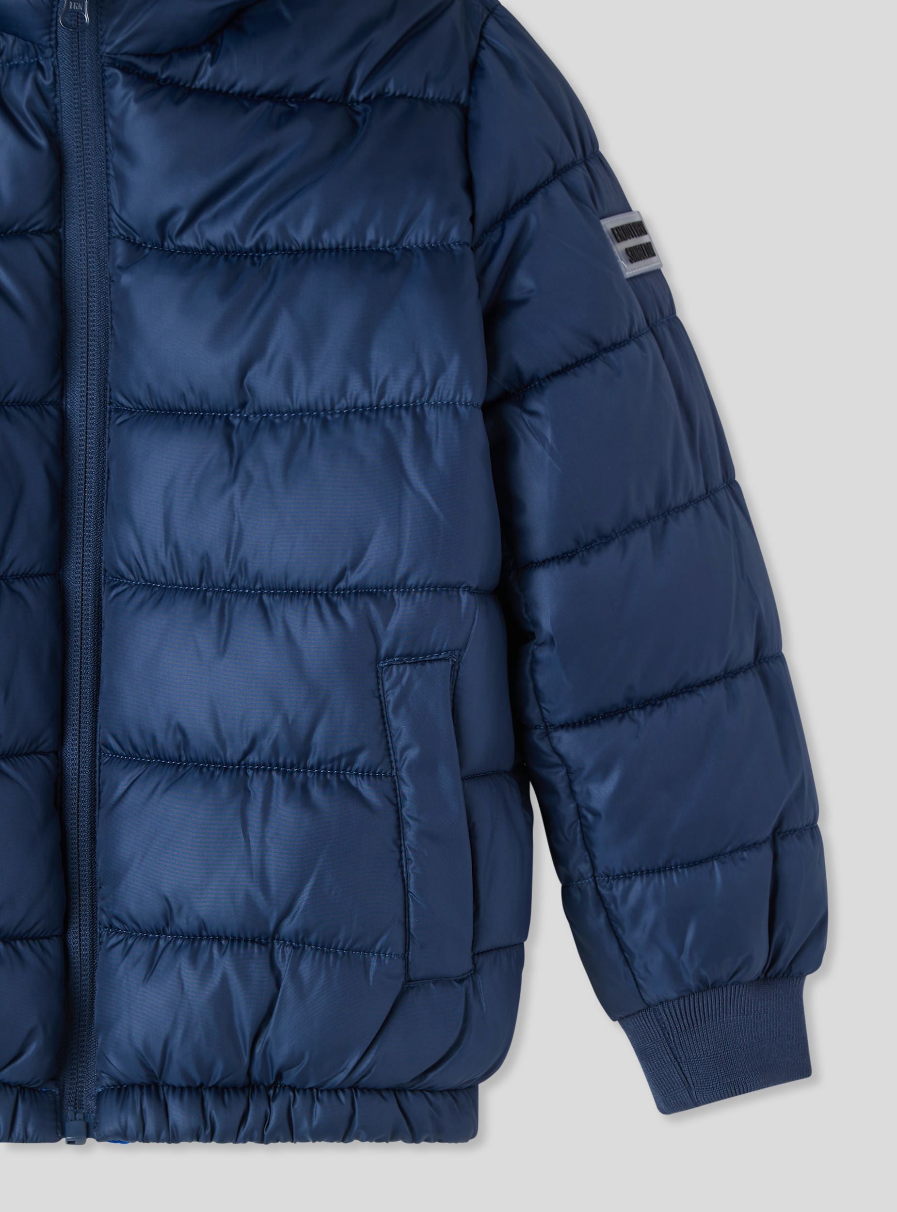 100-gram children's jacket, reversible, ideal for mid-season, perfect for school and leisure. Equipped with a hood and zip closure, it offers a regular fit and long sleeves with elasticated cuffs. One side features a college pattern with prints and writing, while the other is solid colour. Practical side pockets complete the versatile and functional design.Details