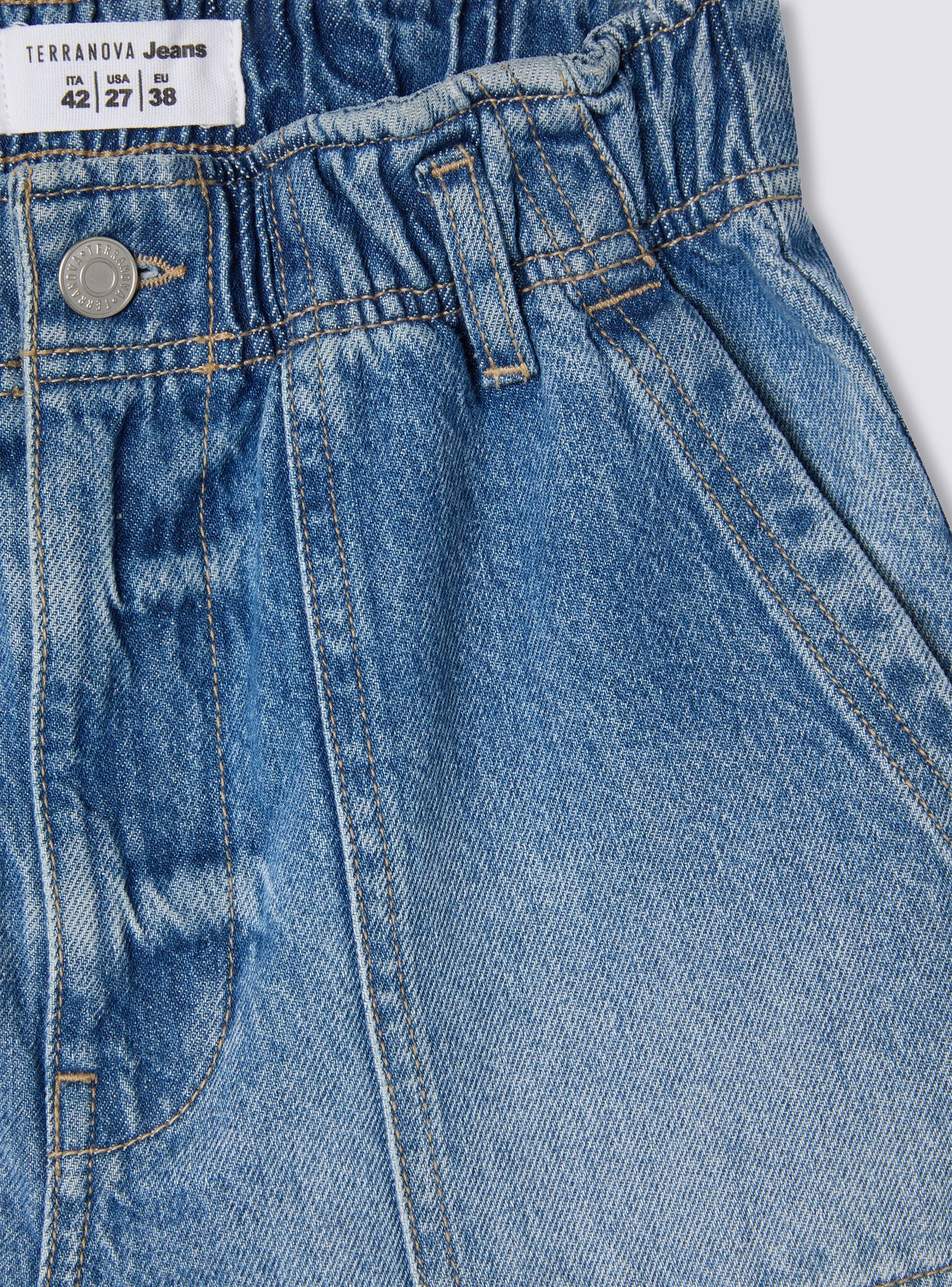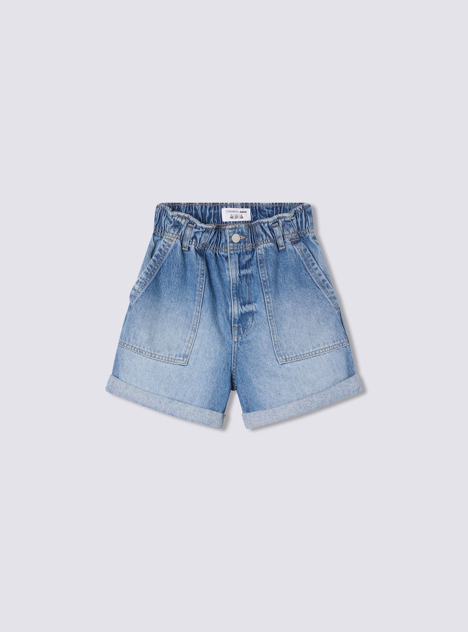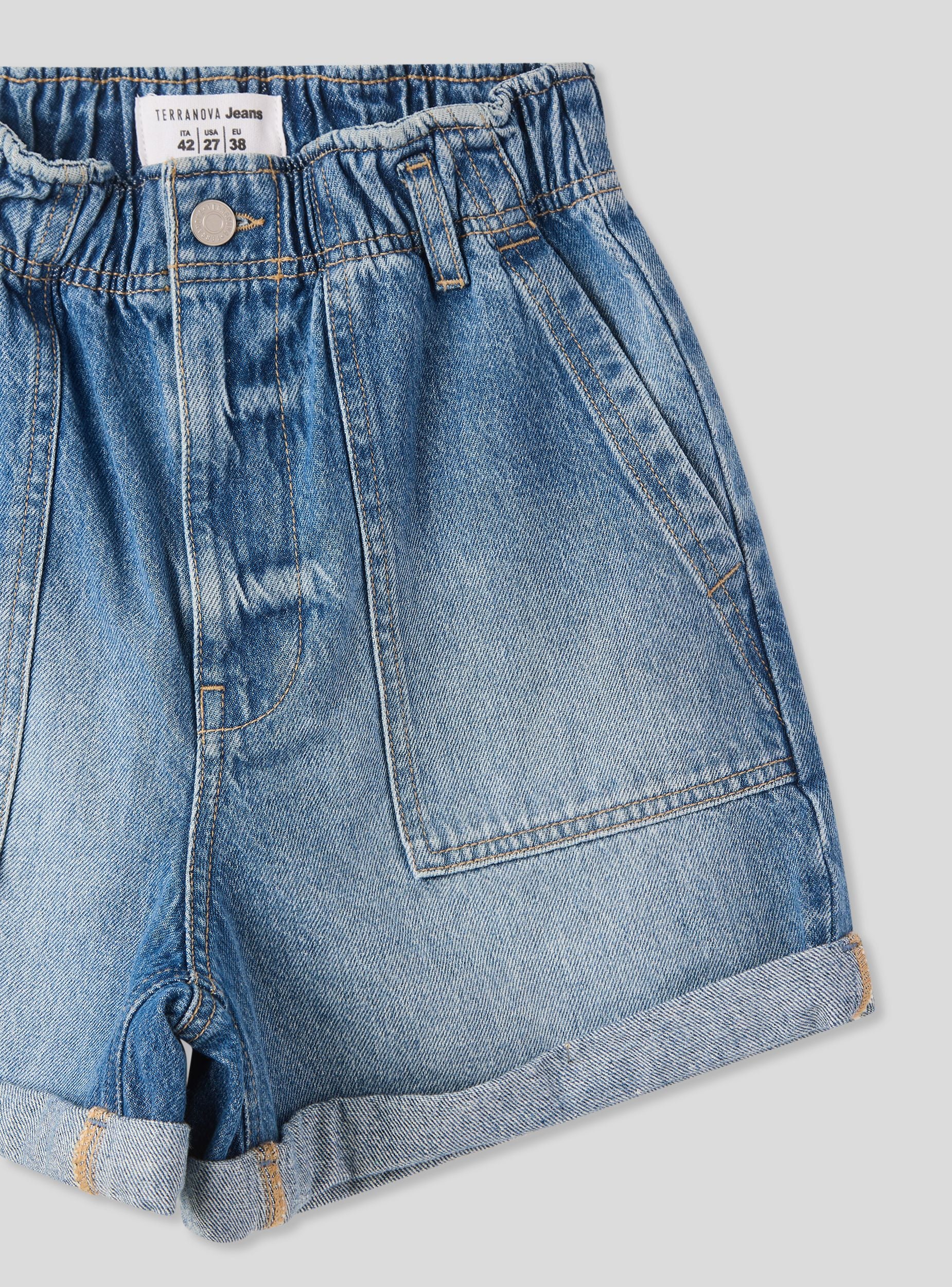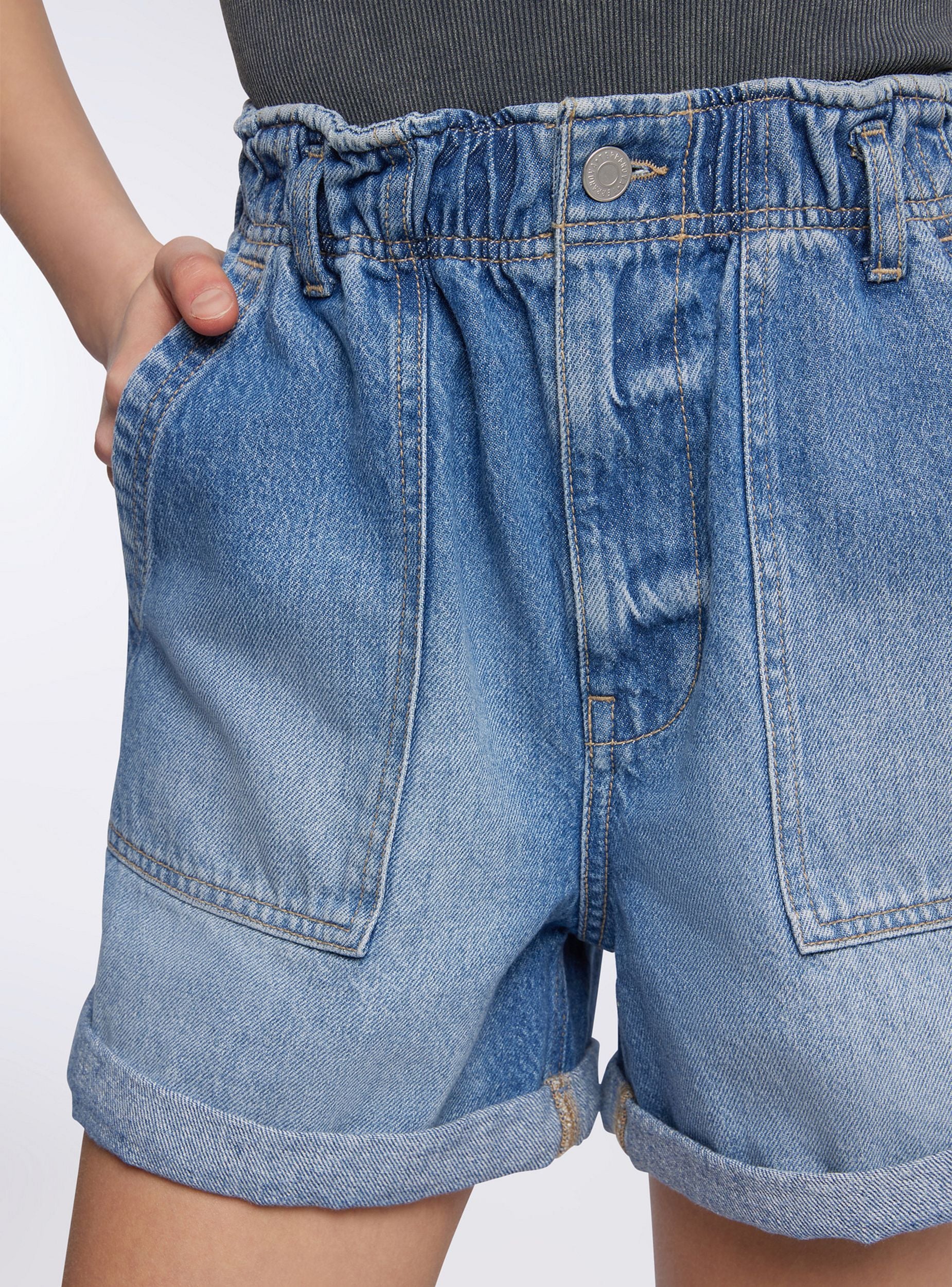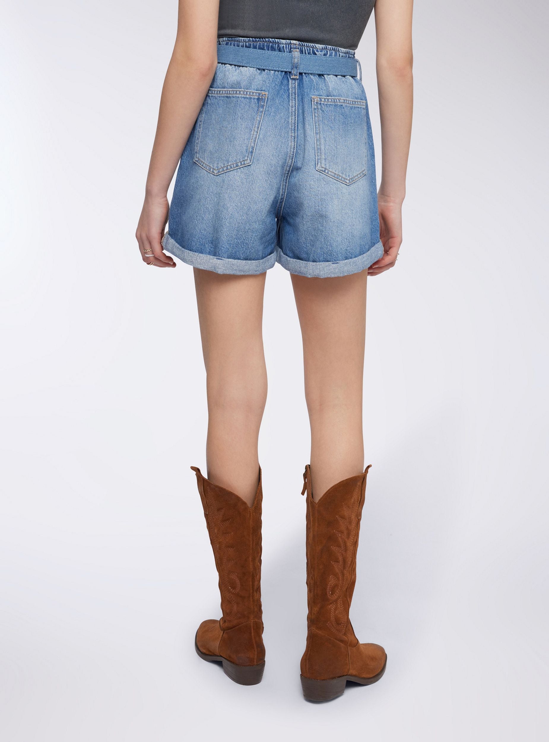 Women's denim shorts with acid wash and paperbag waist, perfect for a trendy and casual look. Zip and button closure. The front and back pockets add practicality. The belt loops allow them to be paired with belts for a personalised touch. Ideal for the warmer season, they pair perfectly with cowboy boots and a fitted tank top for a boho-inspired outfit, or with a t-shirt and sneakers for a more sporty and everyday look.Details