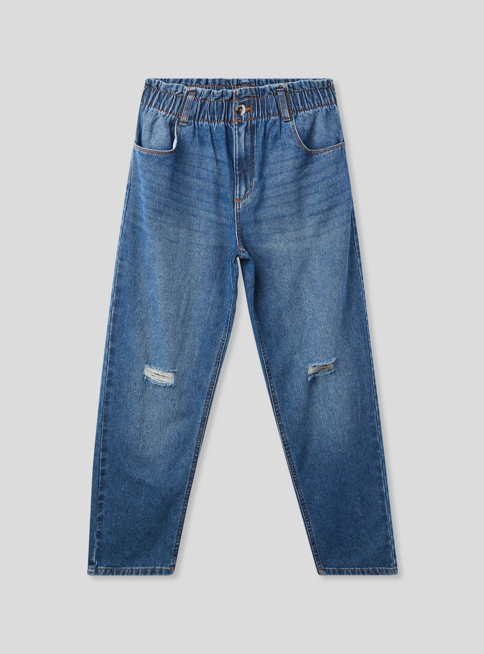 Balloon-cut girls' jeans with a paperbag waist, perfect for a comfortable and trendy look. Featuring rips that add an edgy touch, they have belt loops, a zip and button closure, and an internal elastic for an optimal fit. Ideal for pairing with sweatshirts and trainers for leisure time or with jumpers and ankle boots for a more polished outfit. Suitable for informal occasions and dynamic days.Details