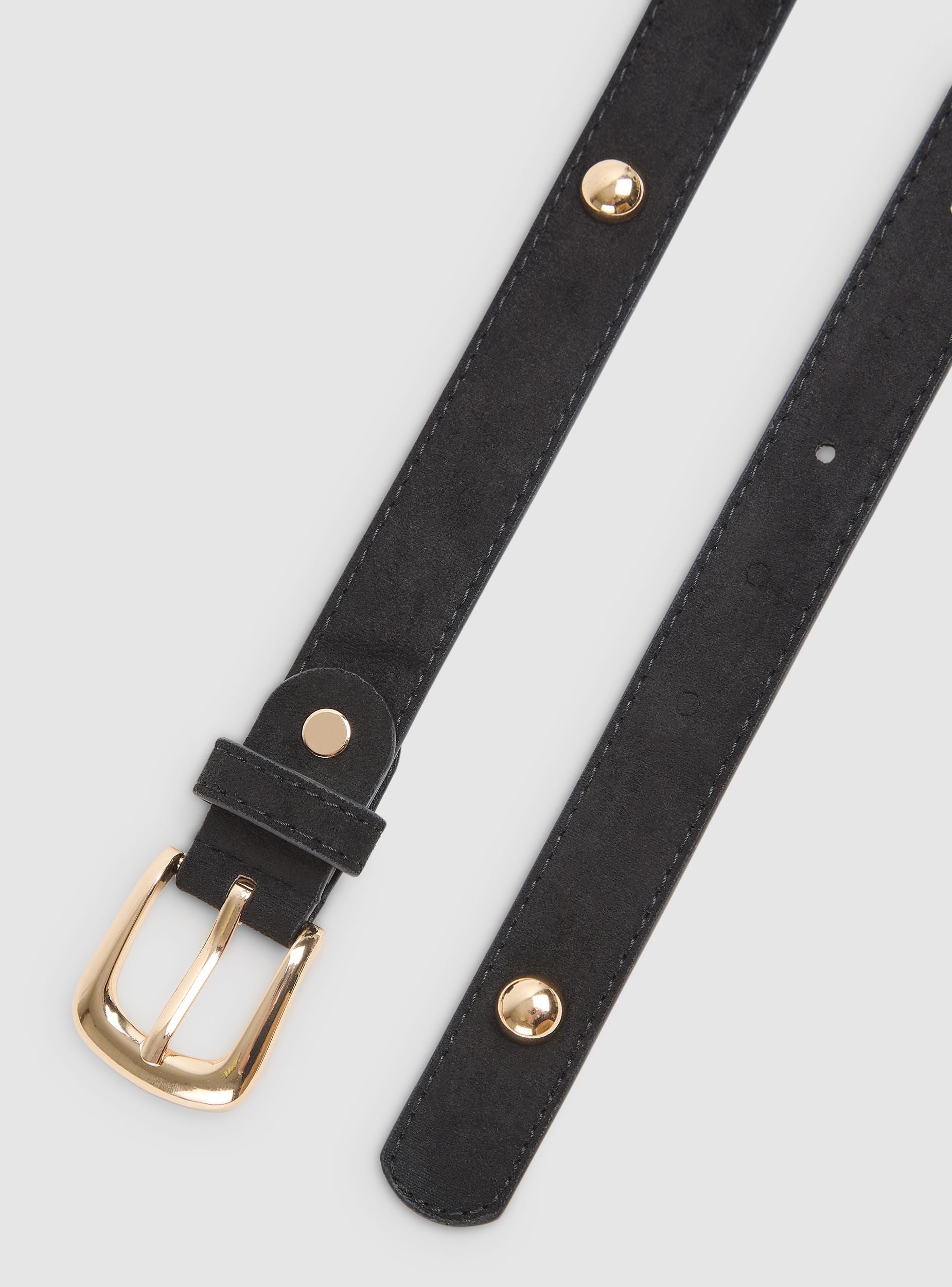 Slim women's belt embellished with golden metal studs distributed along the entire length of the strap. The rectangular buckle with a rounded profile in a golden tone adds an elegant touch, while the numerous adjustment holes ensure a customised fit. In a solid colour, it easily pairs with jeans, trousers, and dresses, adding a rock-chic detail to any look. Perfect for casual and everyday urban outfits.Details