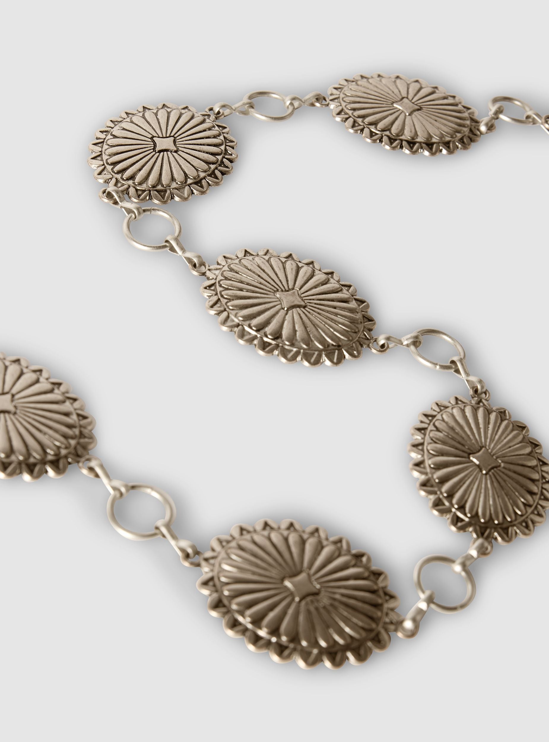 Women's belt with decorative medallions, ideal for adding a western touch to your outfits. Perfect for enhancing dresses, skirts, or trousers, it stands out for its adjustable chain closure that allows for easy adaptation to the silhouette. The design with embossed medallions makes it a versatile accessory, suitable for both casual looks and special occasions.