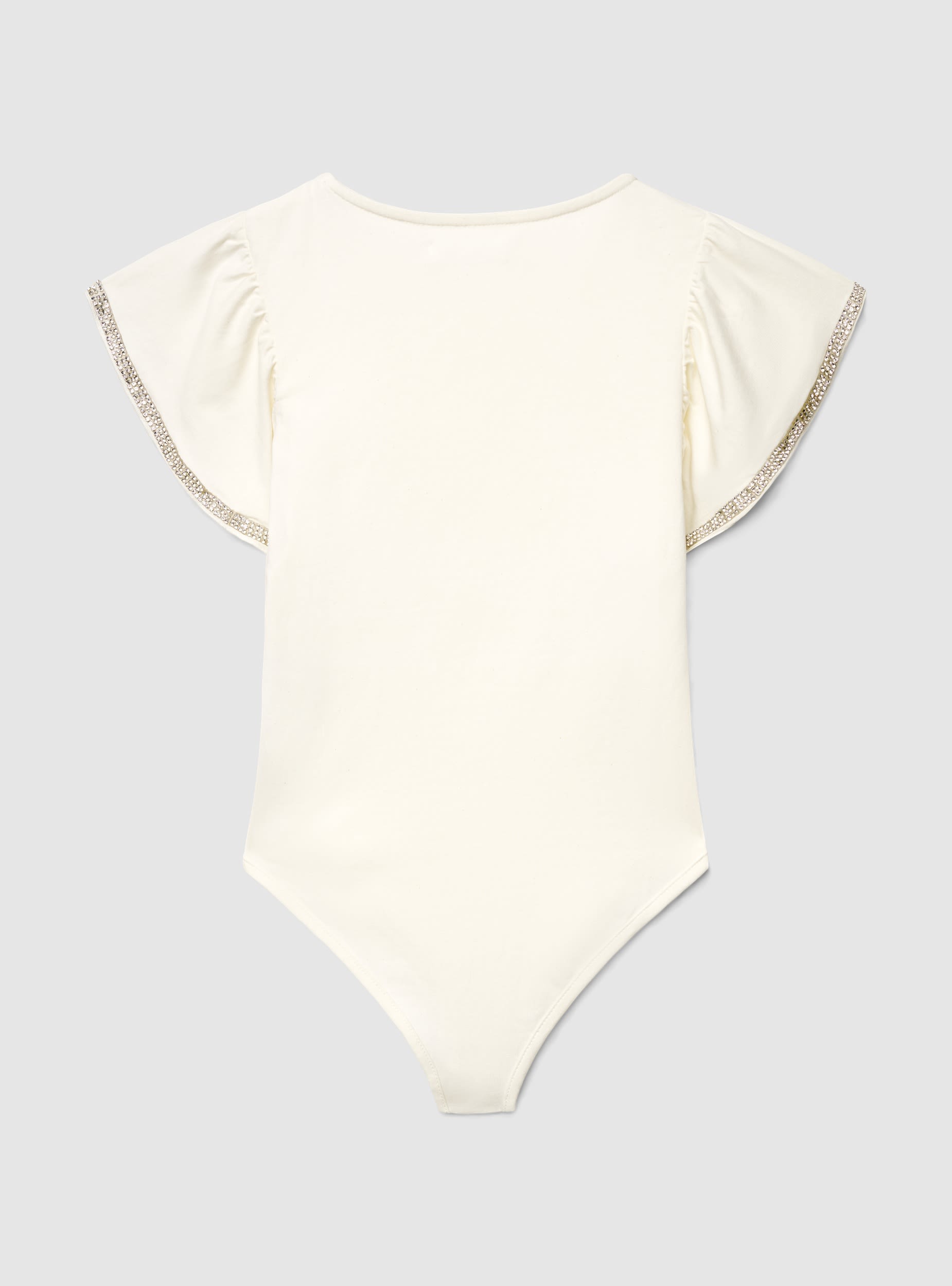 Solid-colour baby girl bodysuit with a round neckline and short ruffled sleeves finished with a shimmering trim. Snap button closure at the crotch for practical wear. Perfect for everyday looks with jeans, skirts, or shorts, it adds a sparkling touch to school and leisure outfits while keeping the top neatly tucked in.Details