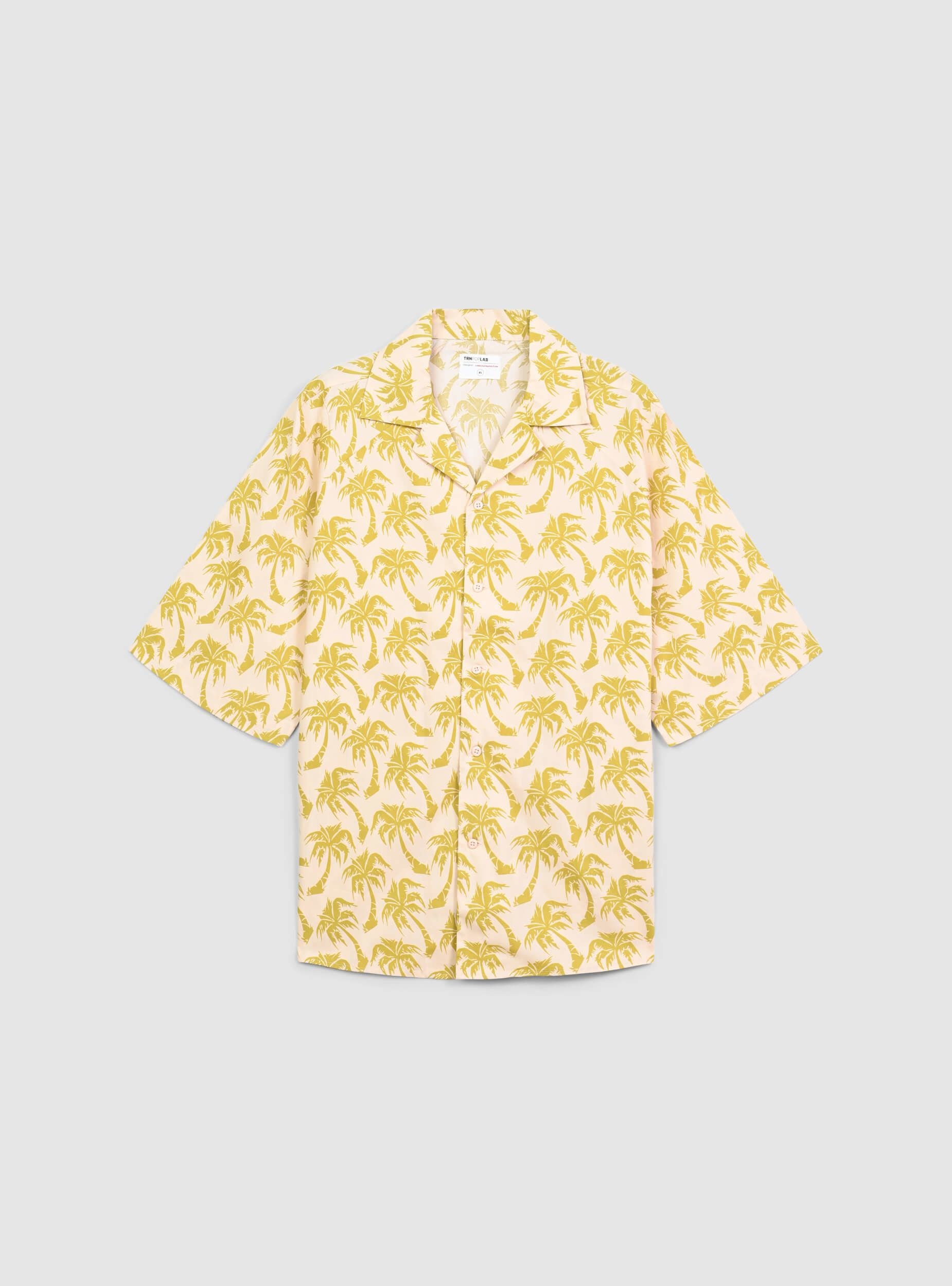 Men's bowling-style shirt with an oversized fit, ideal for a relaxed and contemporary look. The short sleeves and button closure make it practical and comfortable, perfect for warmer days. The all-over palm print adds an exotic and distinctive touch, perfect for those who love vibrant and original outfits. Pair it with shorts or lightweight trousers for a casual and trendy effect. This item is part of the TRNPOPLAB project born from the collaboration with NABA Milan. Fashion design students have created collections inspired by the coolest trends of the moment. And now they will see their creations come to life and reach your hands directly!Details