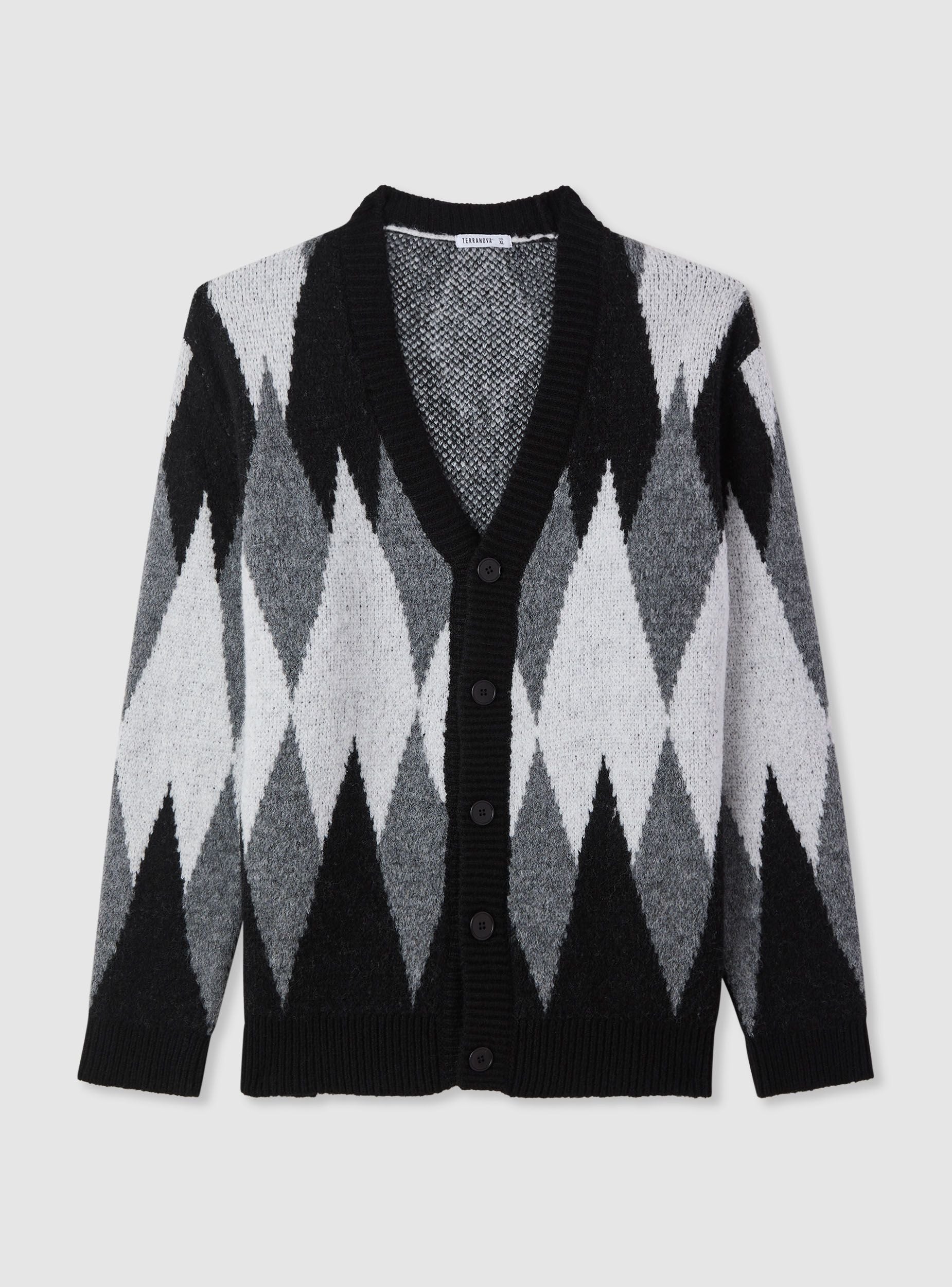 Men's long-sleeve cardigan-style jumper with a diamond pattern. Features a V-neck, front button closure, and ribbed edges on the cuffs and hem. Boxy fit ideal for casual or urban looks, perfect worn over a shirt or T-shirt and paired with jeans or trousers.Details