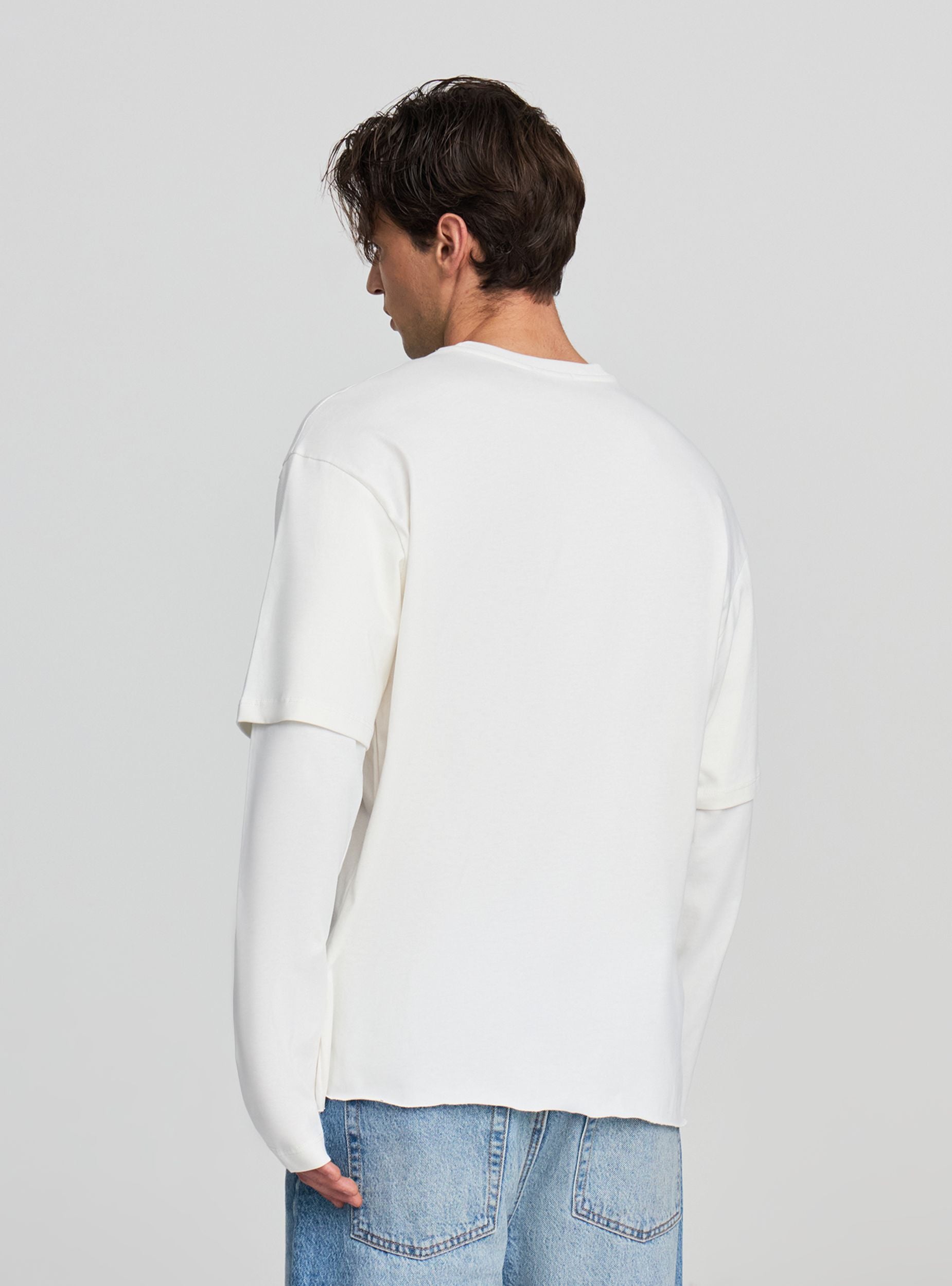 Men's long-sleeve plain t-shirt, perfect for everyday casual looks or for layering under shirts and sweatshirts. It features a clean crew neck and a double-layer effect design on the sleeves that adds character to the garment. The regular fit ensures comfort, while the simple style pairs easily with jeans, chinos, and sneakers.Details