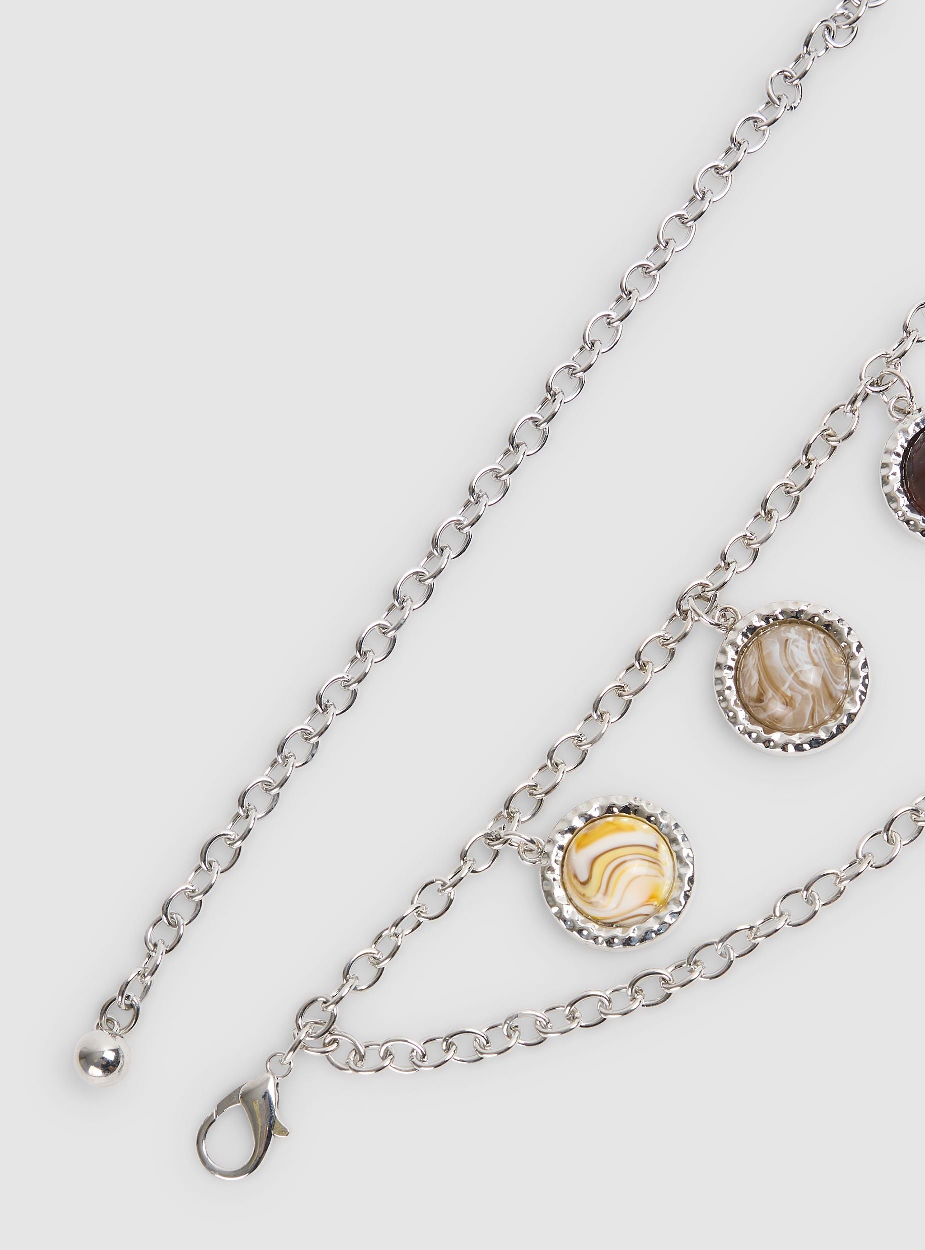Women's double metal chain belt, embellished with circular charms featuring stones in earthy shades, in a solid colour. Equipped with a lobster clasp and adjustable extension to easily fit different sizes. An accessory with a bohemian flair that enhances dresses, jeans, and skirts, perfect for a casual chic daytime look or to add a jewellery touch to evening outfits. Versatile and feminine, it pairs naturally with numerous styles.Details
