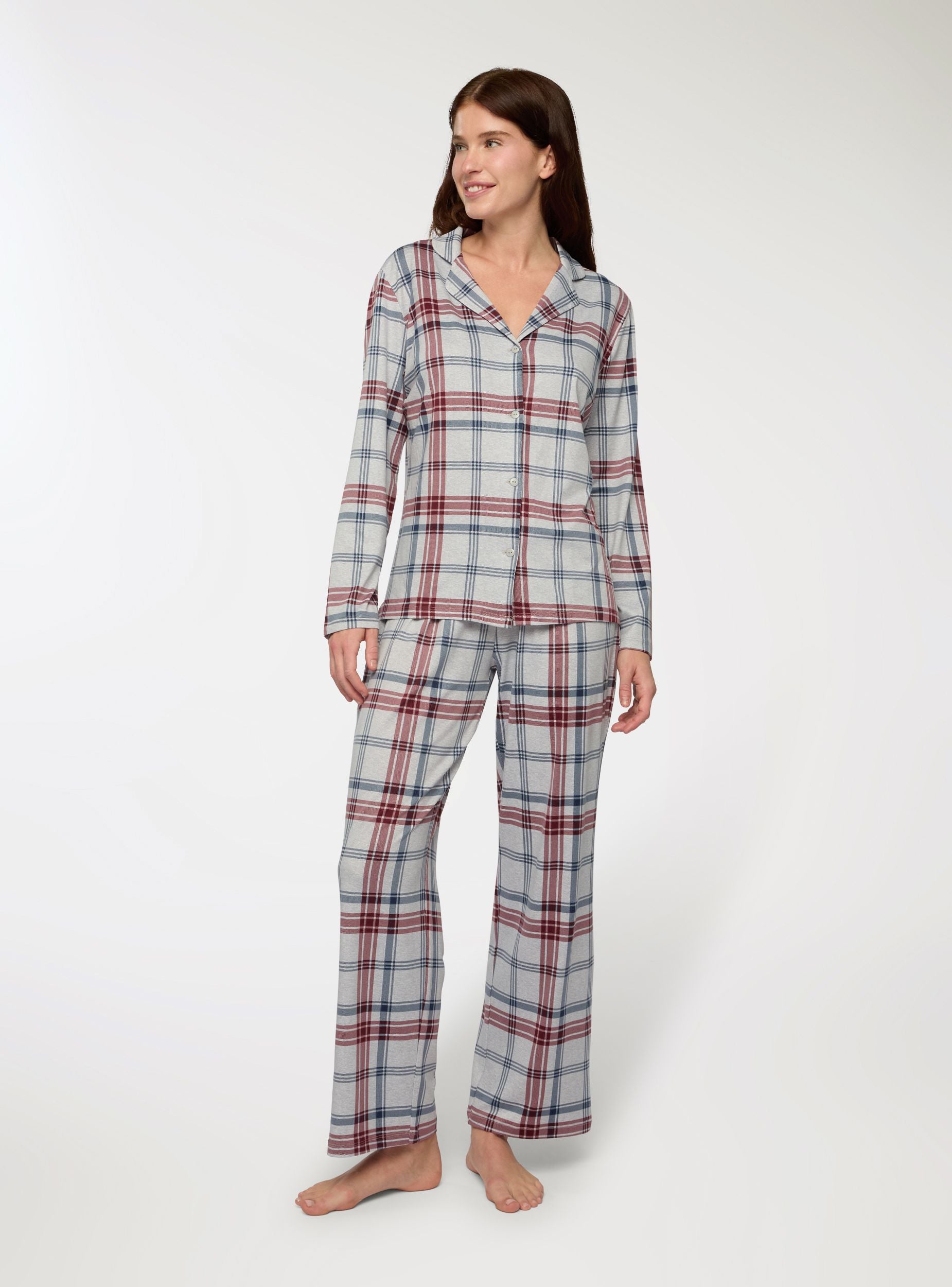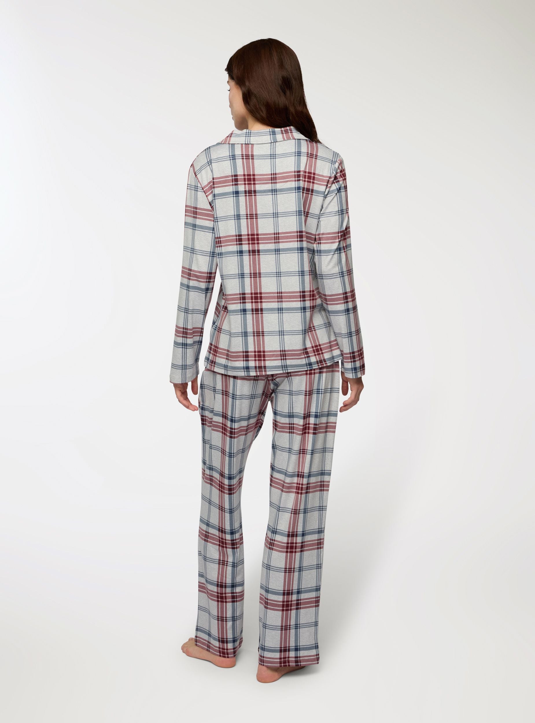 Women's pyjamas consisting of a long-sleeved shirt and long trousers. The shirt features a notched collar and button closure, while the trousers have an elasticated waistband for maximum comfort. The checkered pattern design adds a touch of style, making it ideal for relaxing moments at home. Perfect for those seeking practicality and versatility without sacrificing elegance.Details