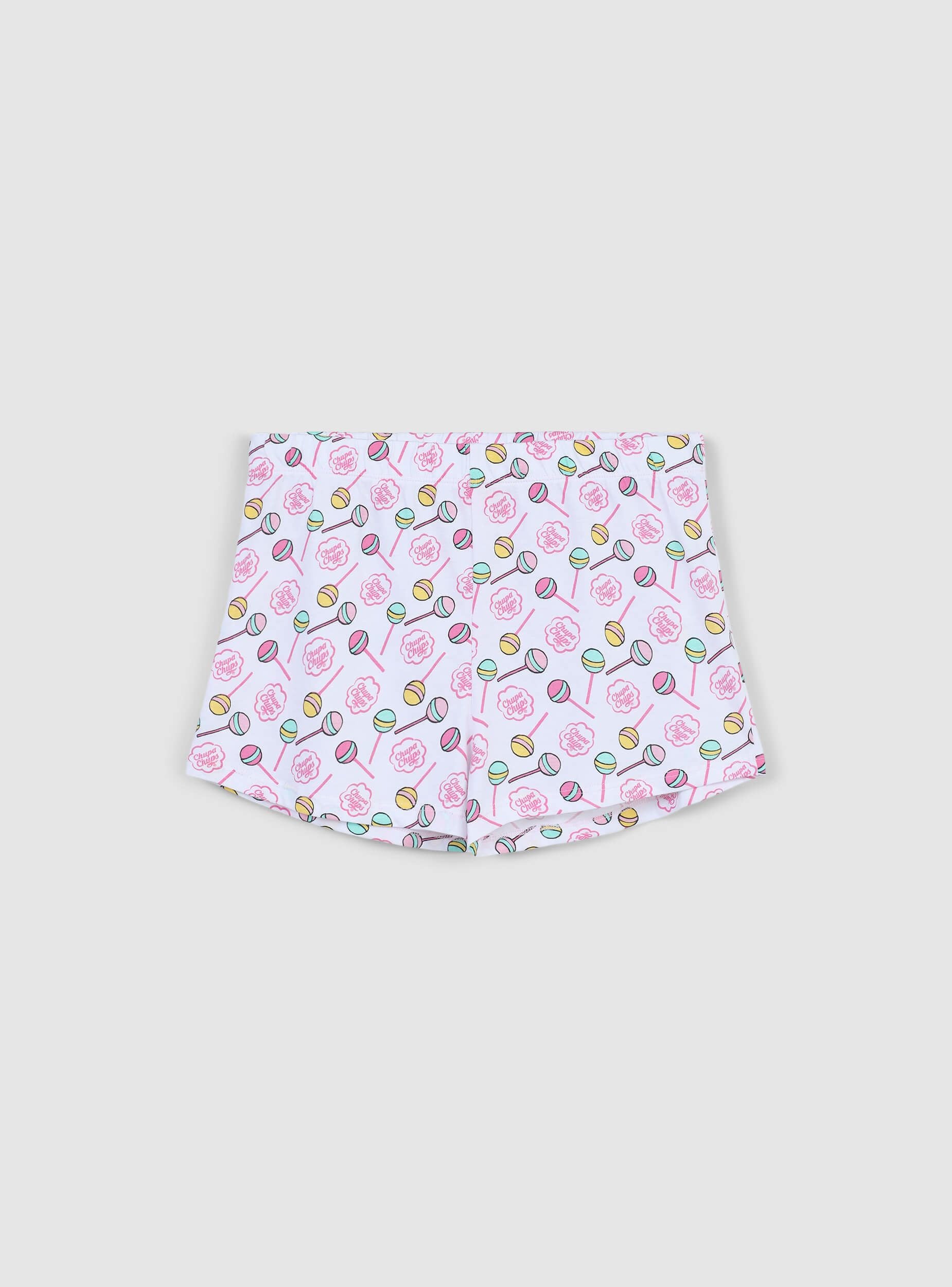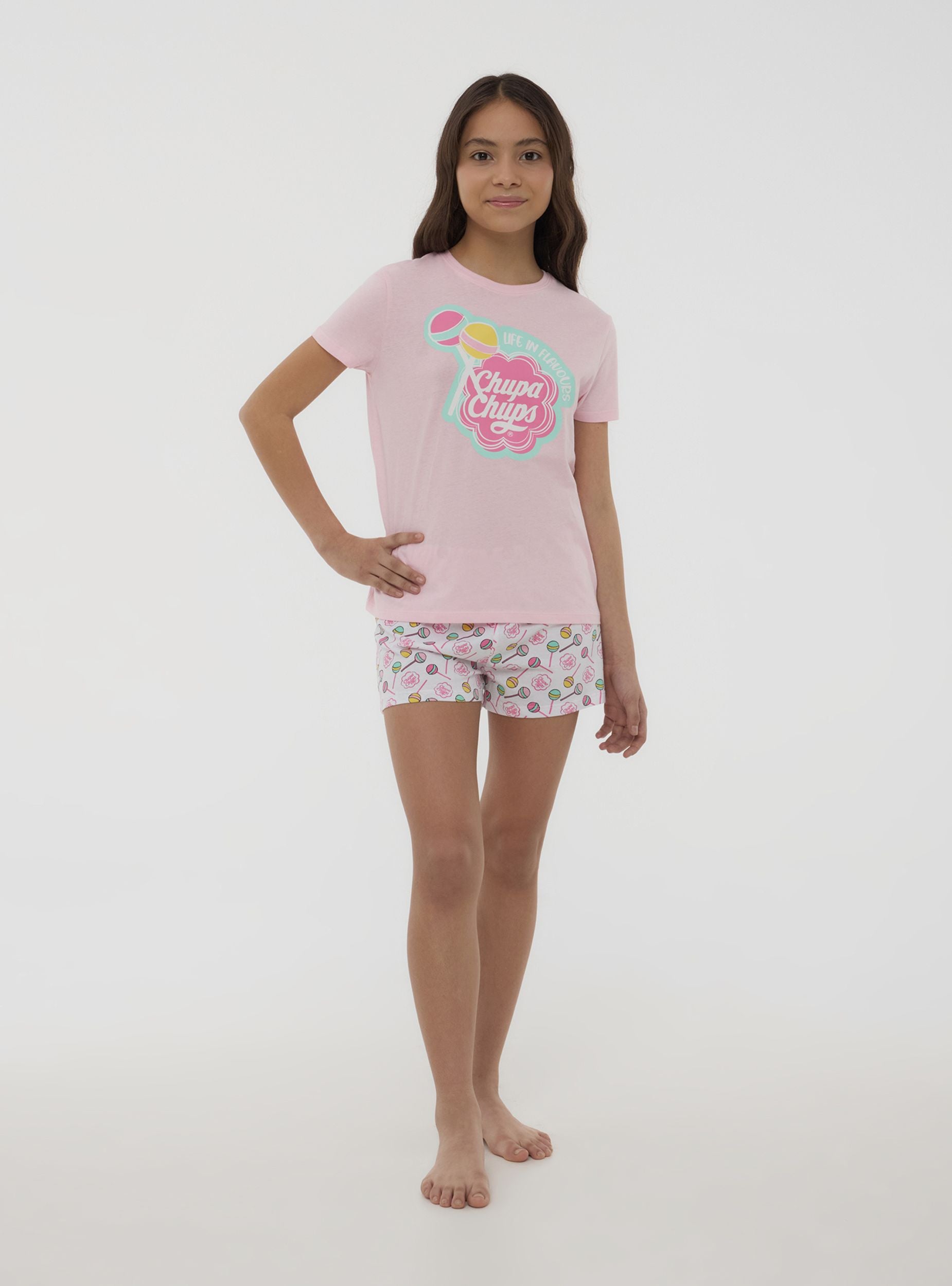 Ideal girls' pyjamas for relaxation and rest, perfect for home or leisure time. Comprising a short-sleeved t-shirt with a Chupa Chups® print and matching shorts, it offers a comfortable and practical fit. A versatile and cheerful set to accompany moments of relaxation in style.Details