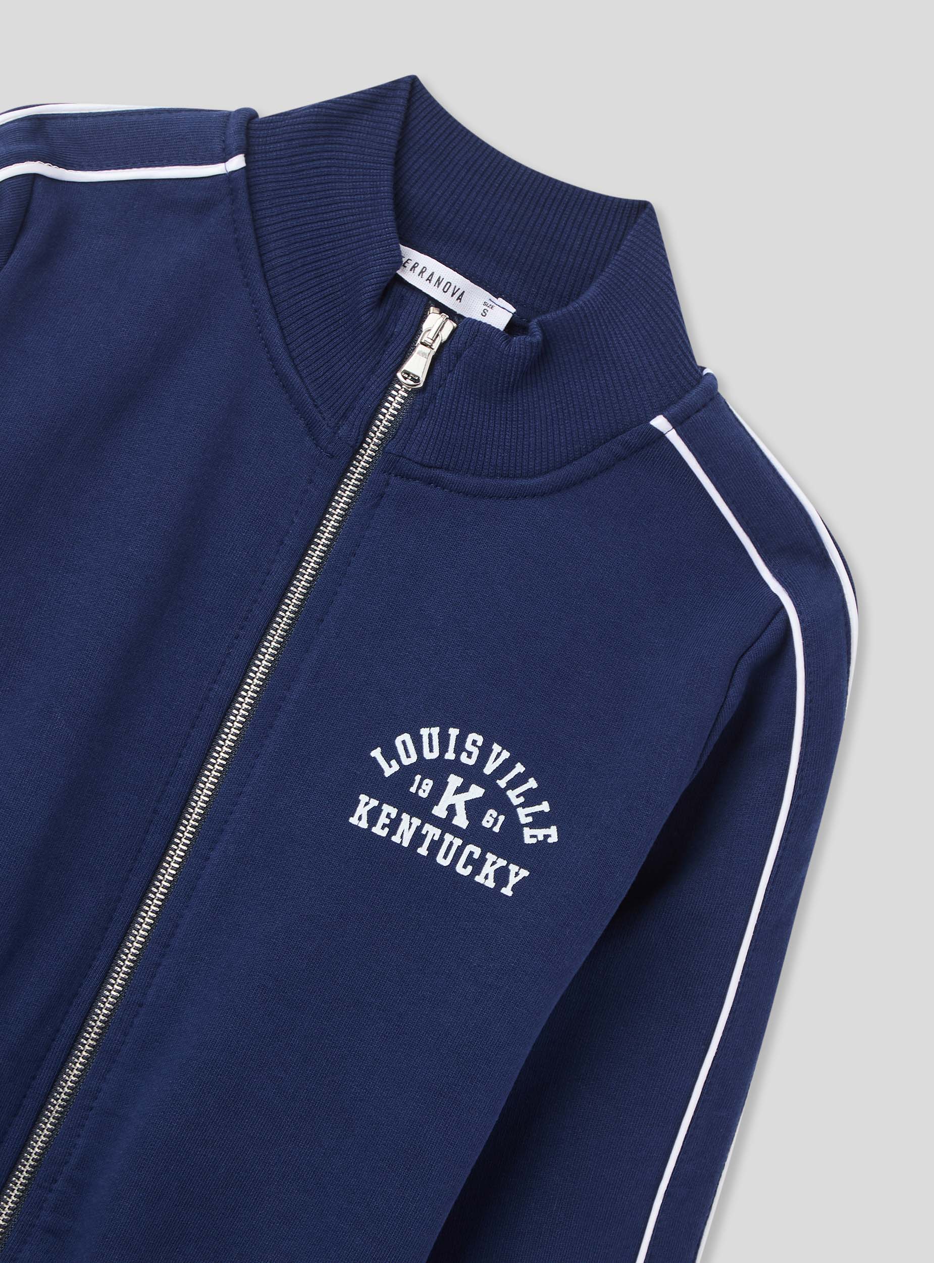 Women's zip-up sweatshirt with a high collar, without a hood, featuring a sporty college style. The contrasting piping detail along the sleeves and the college-style front print evoke a vintage American aesthetic. Perfect to wear with joggers or jeans for a casual retro look, it is ideal for leisure time, city strolls, or relaxed days. The ribbed hem and cuffs ensure a comfortable fit.Details