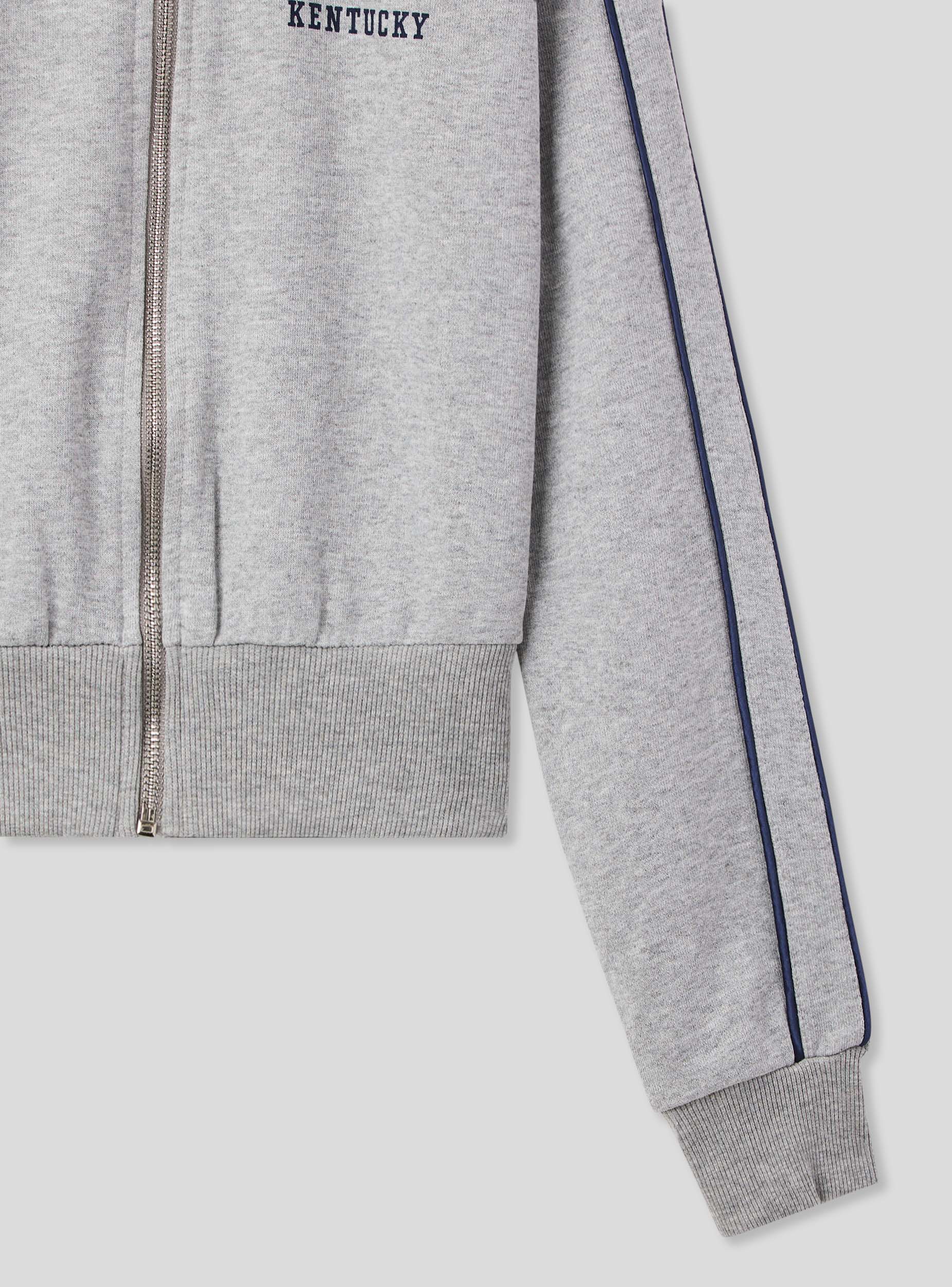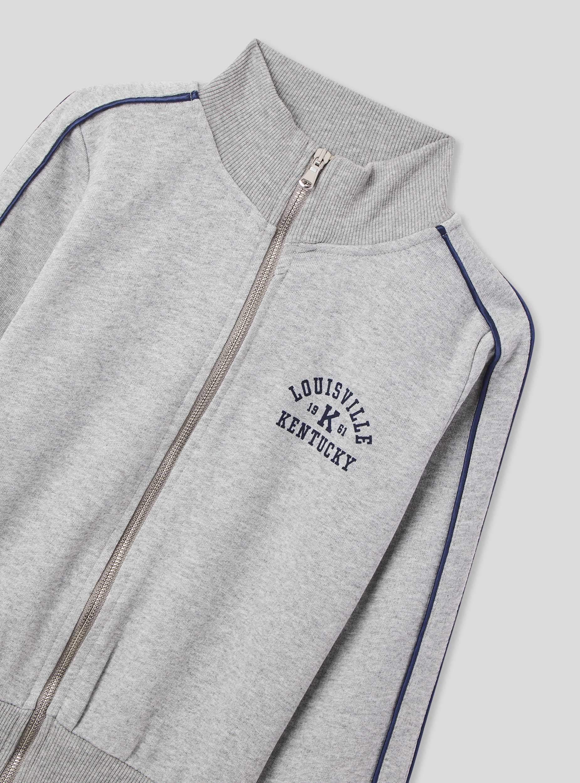 Women's zip-up sweatshirt with a high collar, without a hood, featuring a sporty college style. The contrasting piping detail along the sleeves and the college-style front print evoke a vintage American aesthetic. Perfect to wear with joggers or jeans for a casual retro look, it is ideal for leisure time, city walks, or relaxed days. The ribbed hem and cuffs ensure a comfortable fit.Details