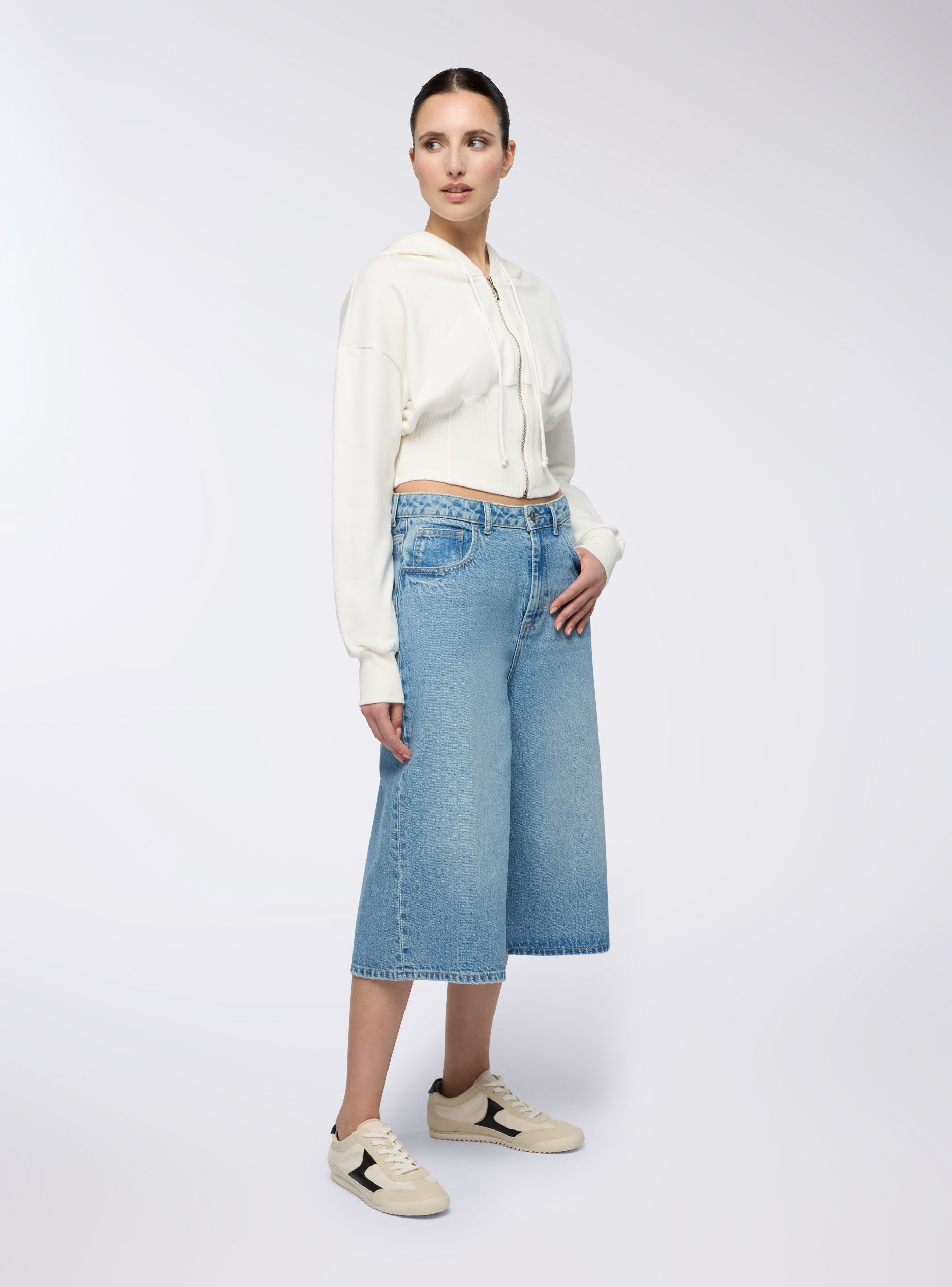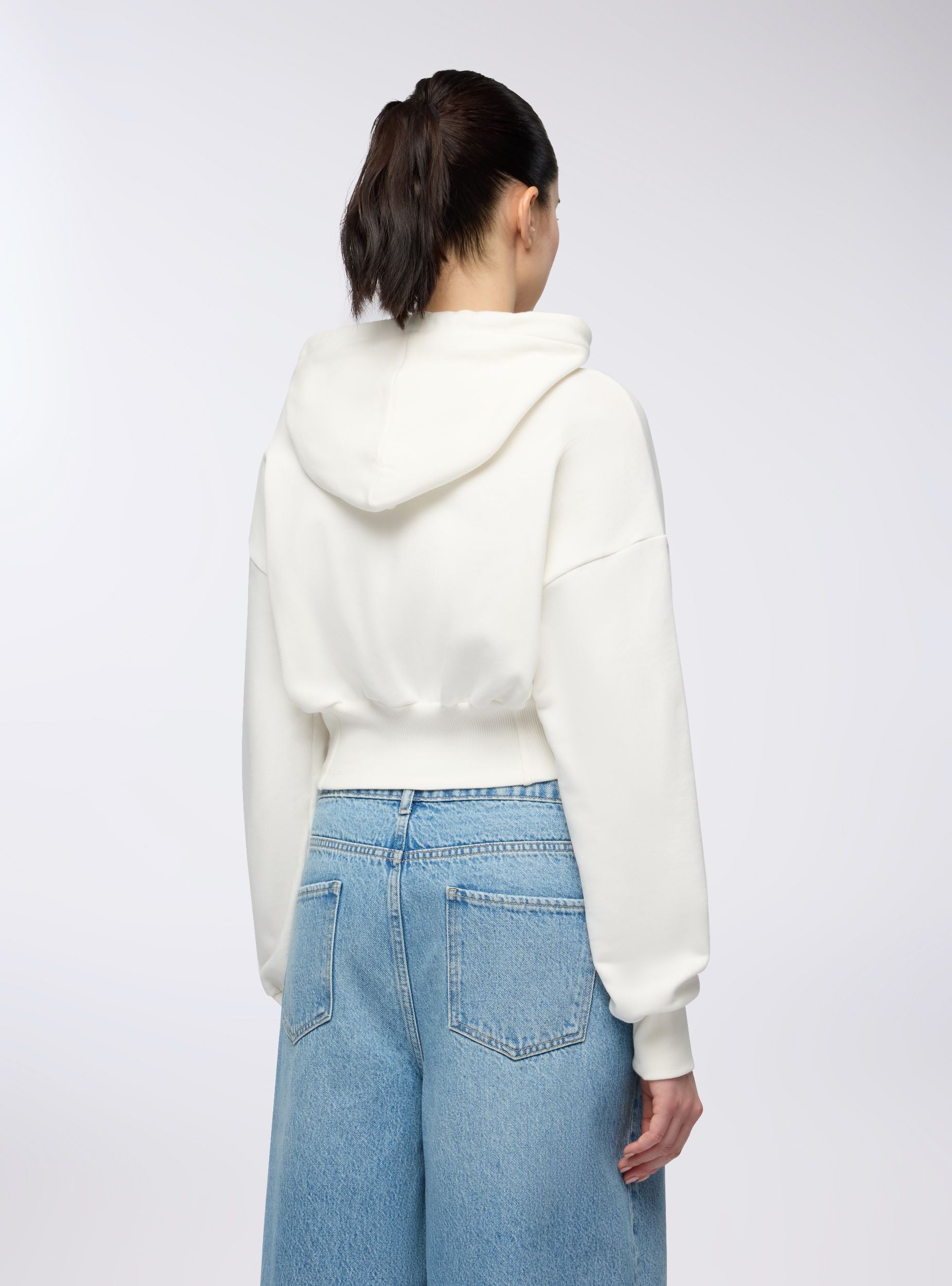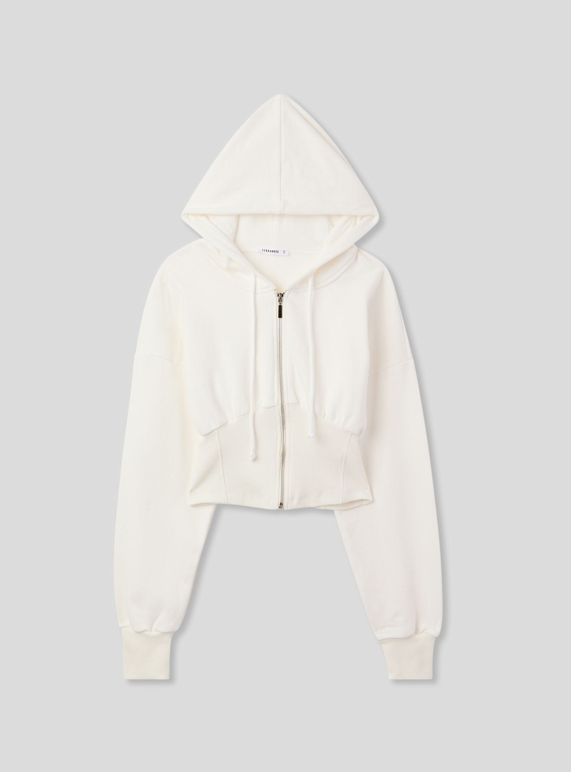 Women's sweatshirt with a cropped cut and corset effect detail, perfect for accentuating the waist with a sporty yet feminine style. The design featuring a hood and front zip adds an urban touch, ideal for pairing with high-waisted jeans or joggers for a comfortable and edgy look. The long sleeves with cuffs and the tailored structure provide a snug and comfortable fit.Details