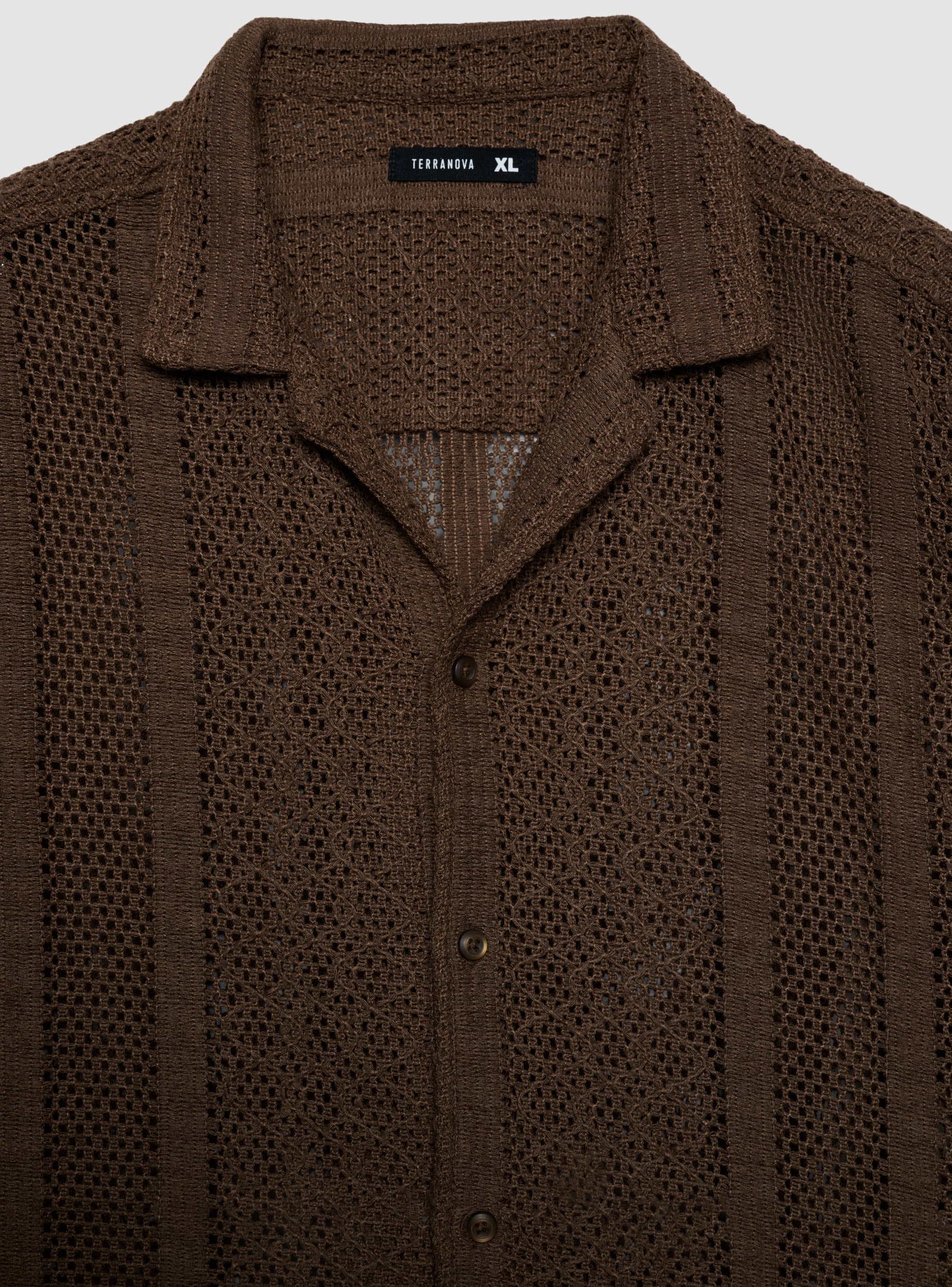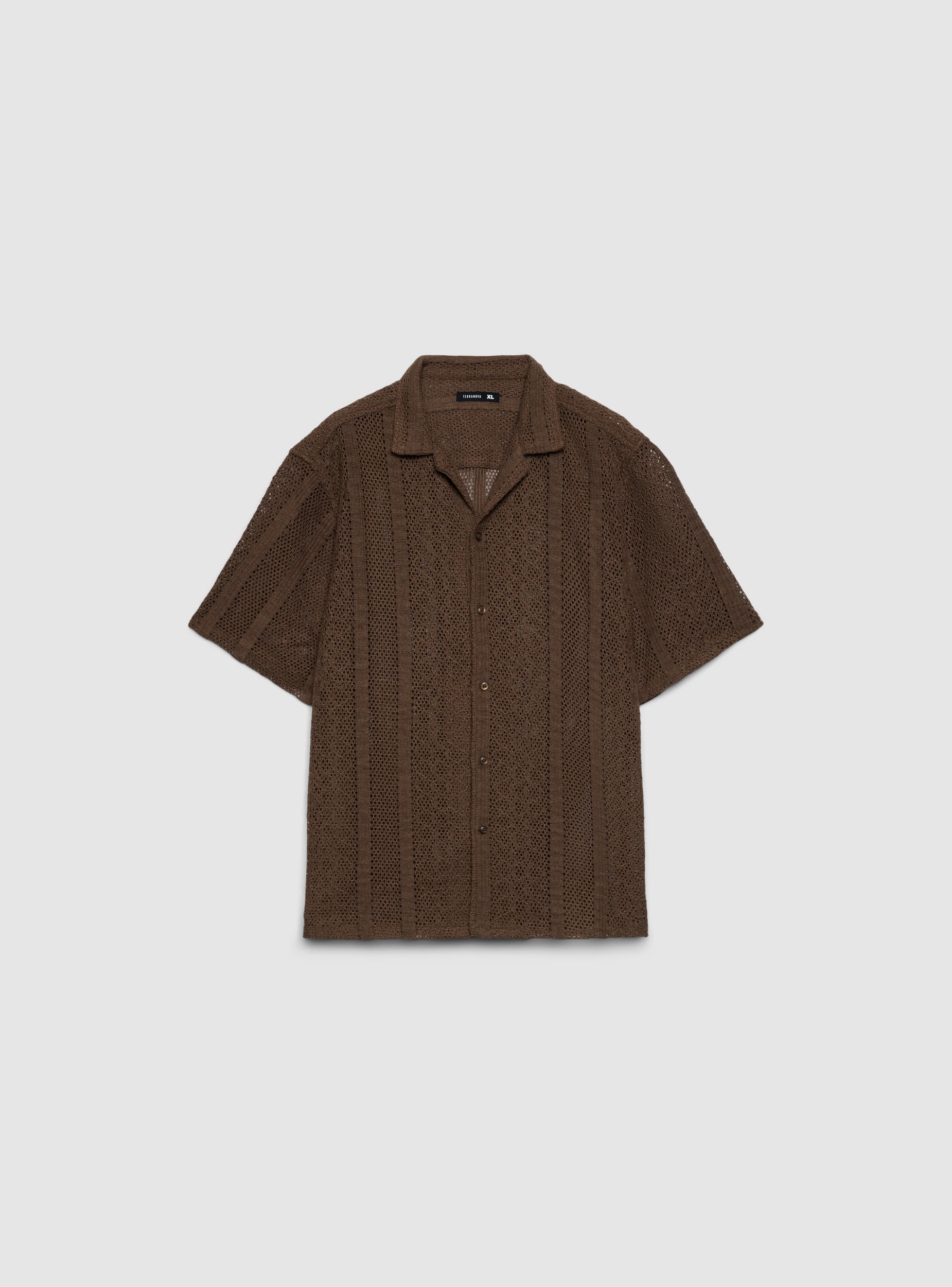 Men's plain shirt with a summer vibe, featuring openwork crochet detailing and a bowling collar. Front button closure and short sleeves, ideal to wear open over a vest or t-shirt and pair with bermuda shorts or jeans for holiday and leisure looks. Comfortable fit and lightweight design, also perfect for the evening.Details