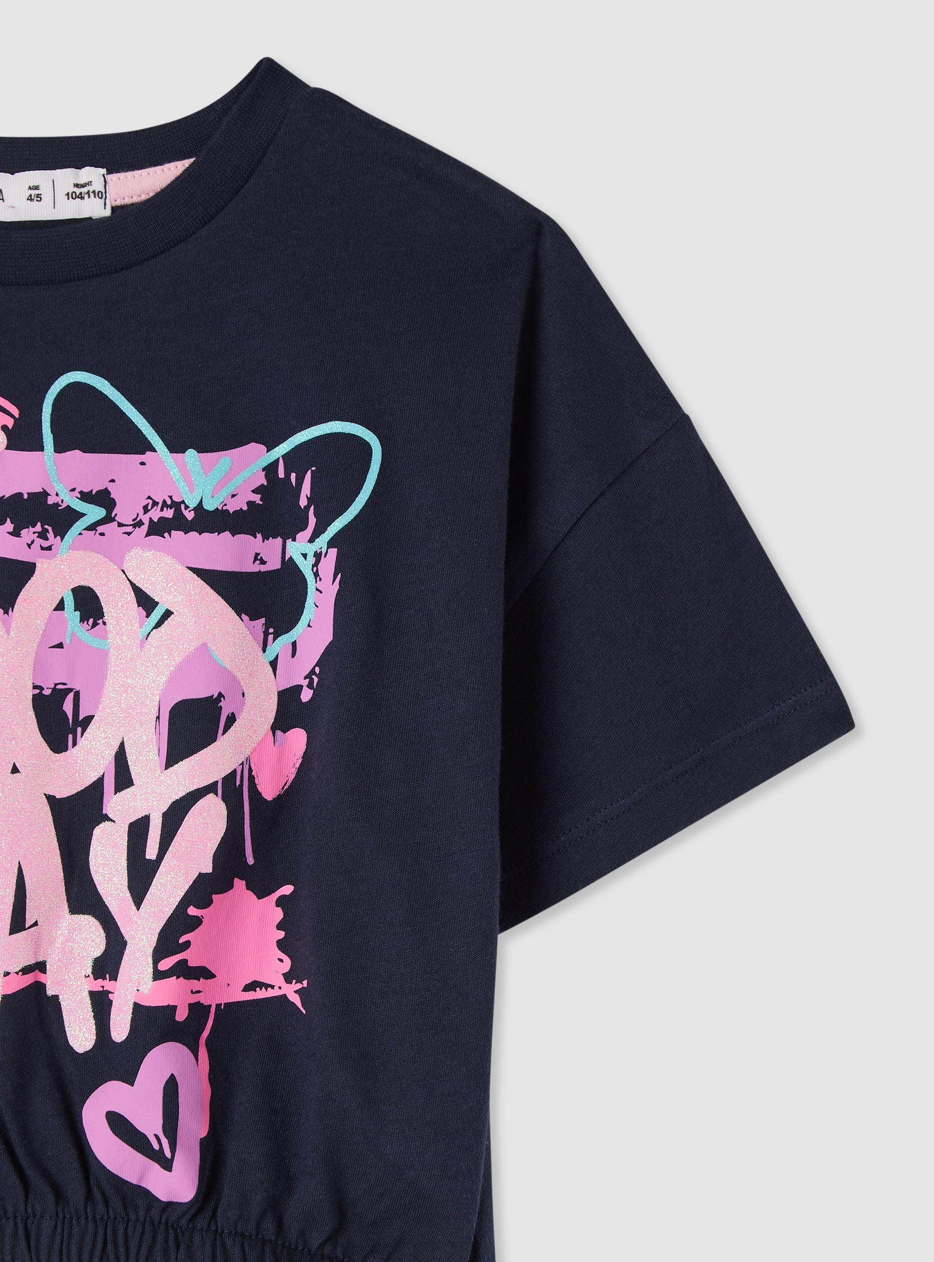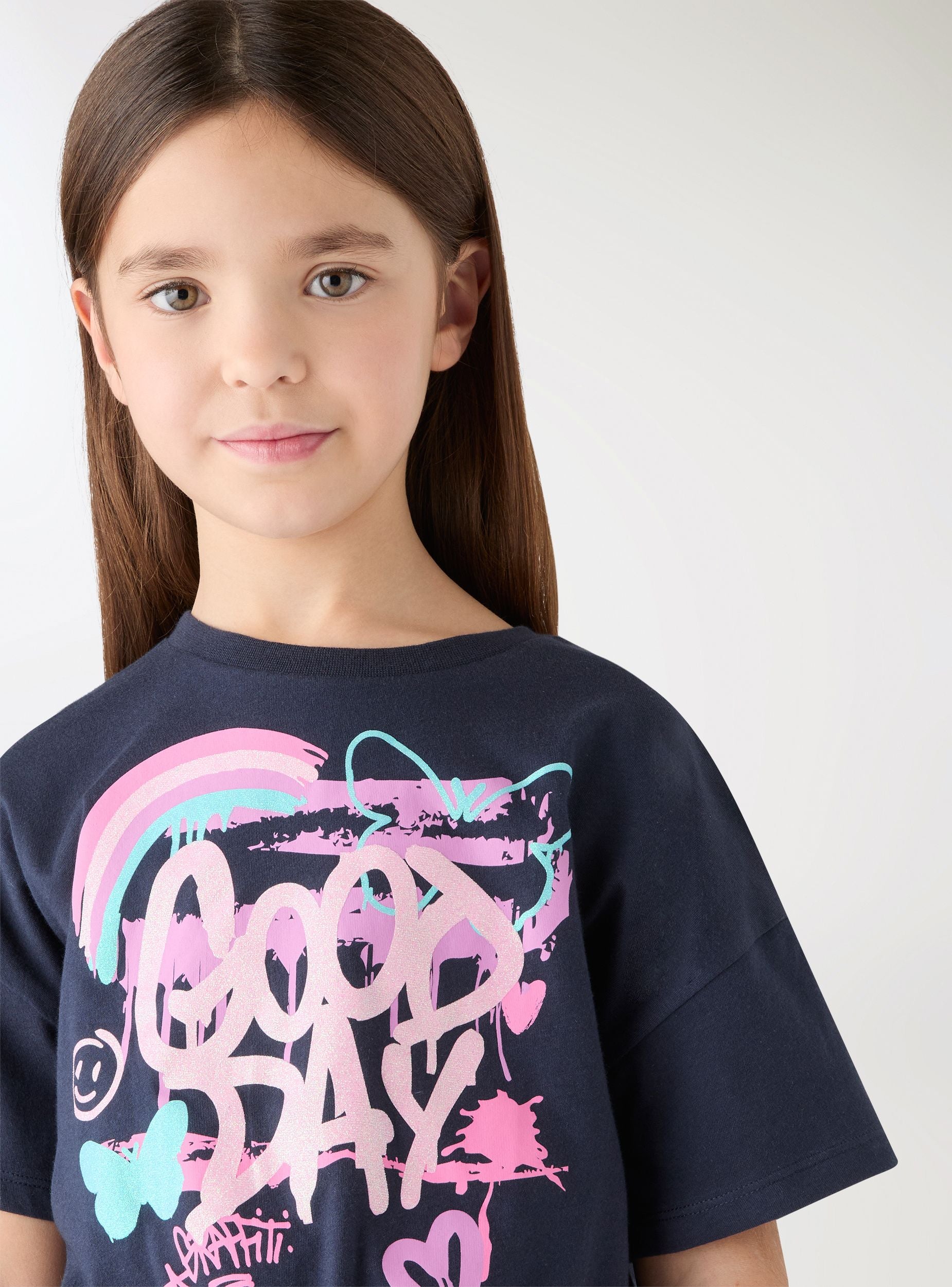 Girls' cropped t-shirt with graffiti print on the front. Round neck, short sleeves, and a hem with adjustable ruching on the sides via drawstrings to customise the fit. Perfect for leisure time and an urban look with jeans or shorts, it adds a playful touch thanks to the lettering and hearts. Comfortable fit, easy to wear every day.Details