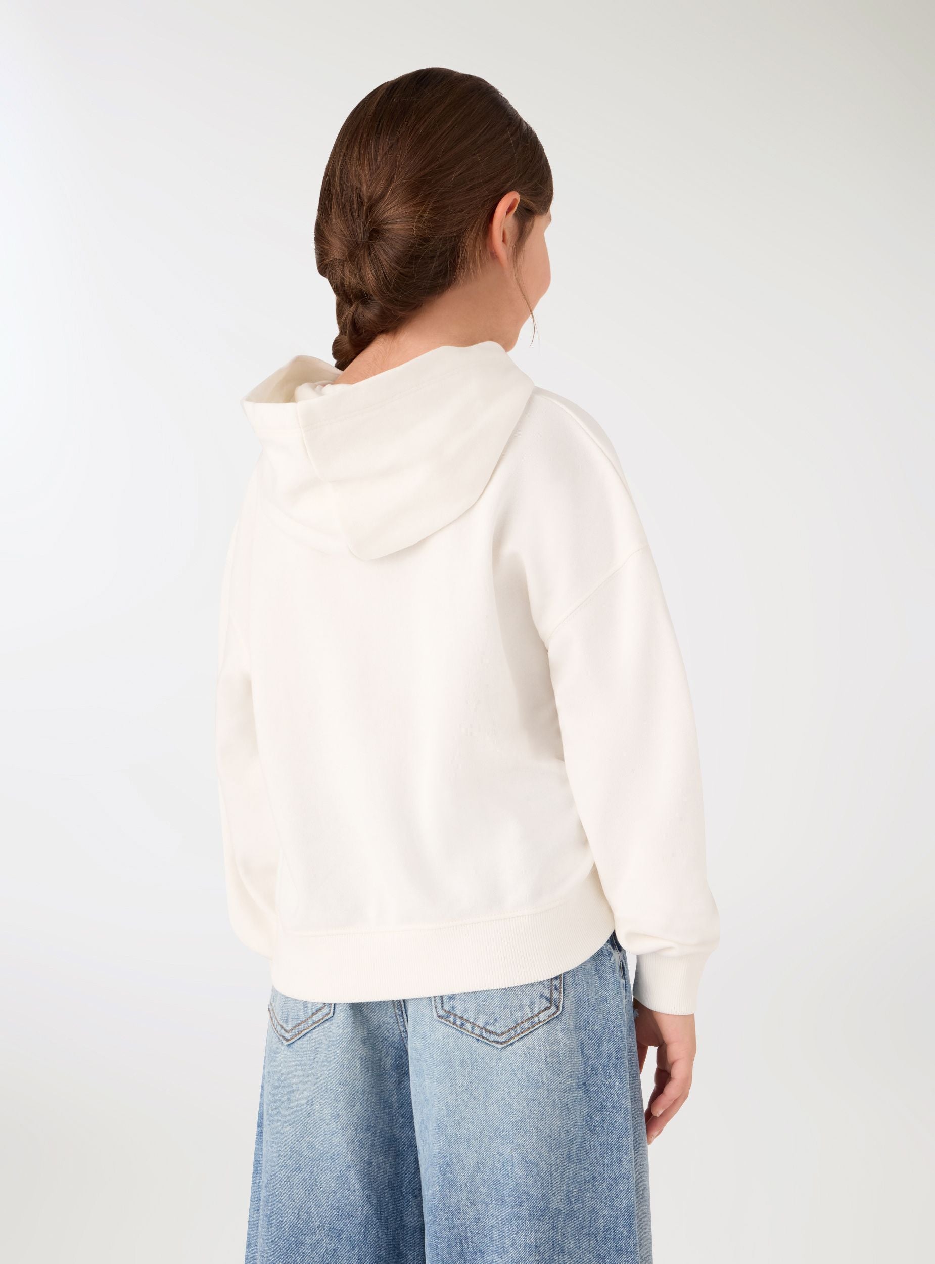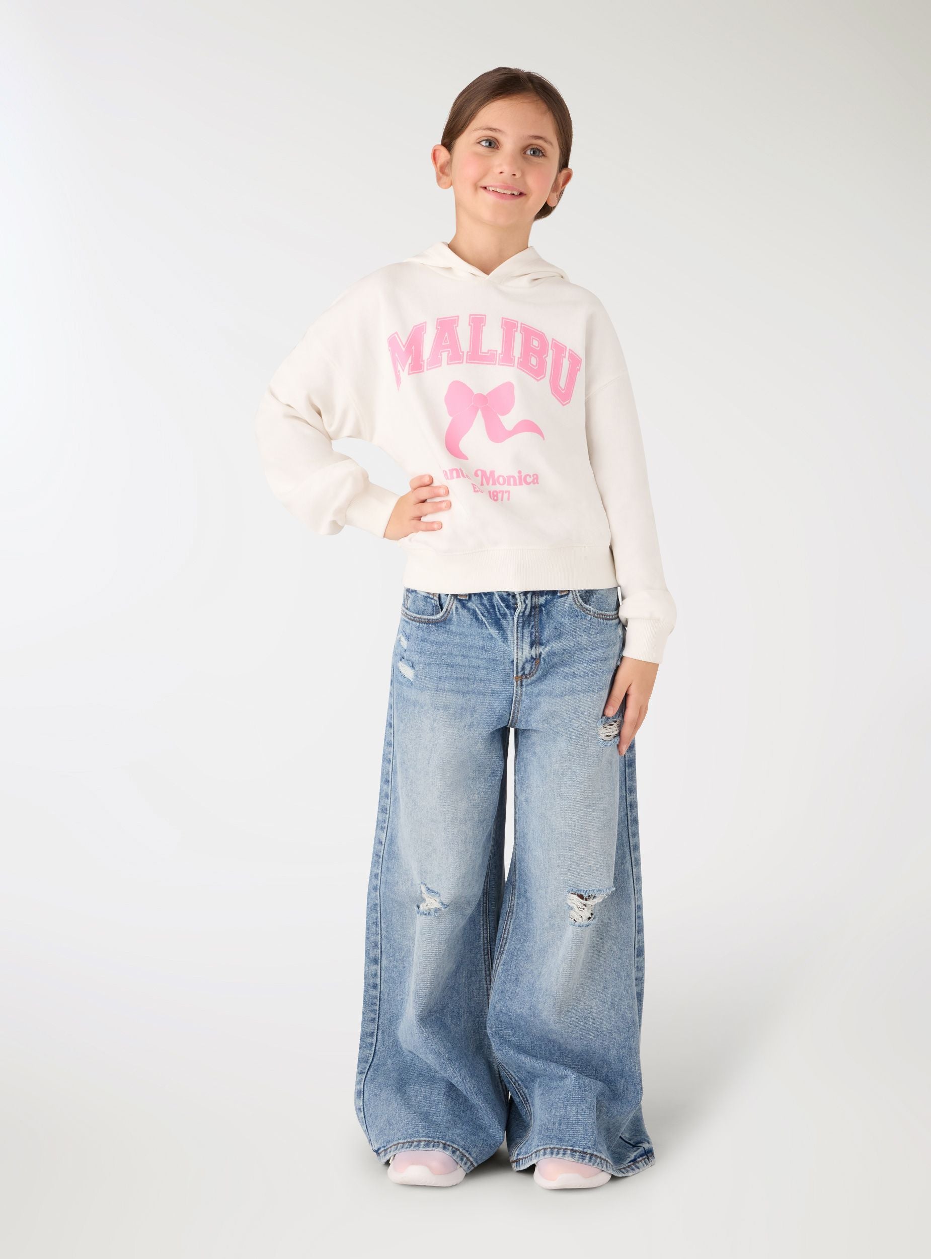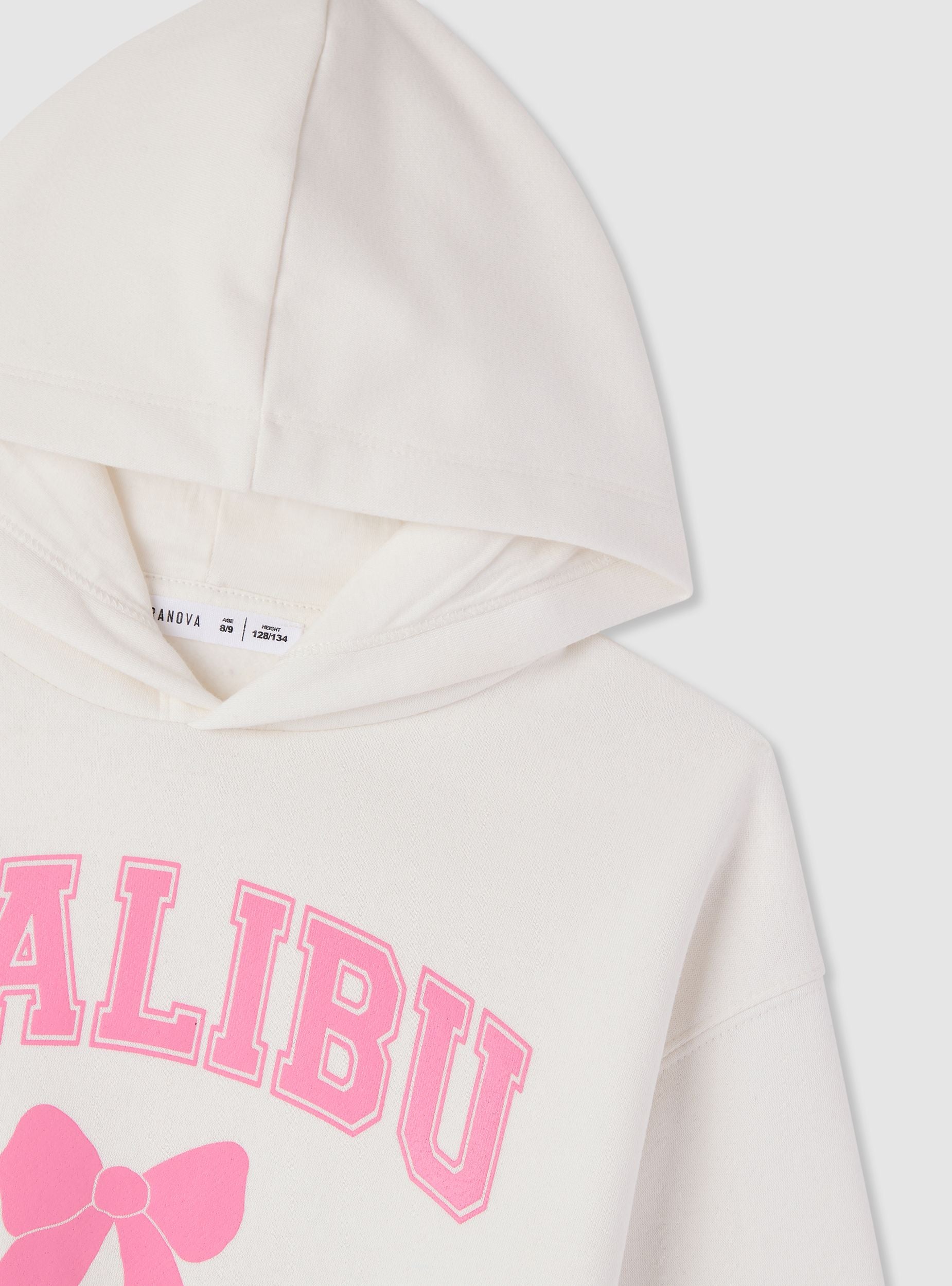 Lightweight girls' hoodie without a zip, featuring a "Malibu" college print design on the front. Crop style with long sleeves, ribbed cuffs, and hem for a comfortable fit. Ideal for leisure and school, pairs well with jeans or shorts for a casual look.