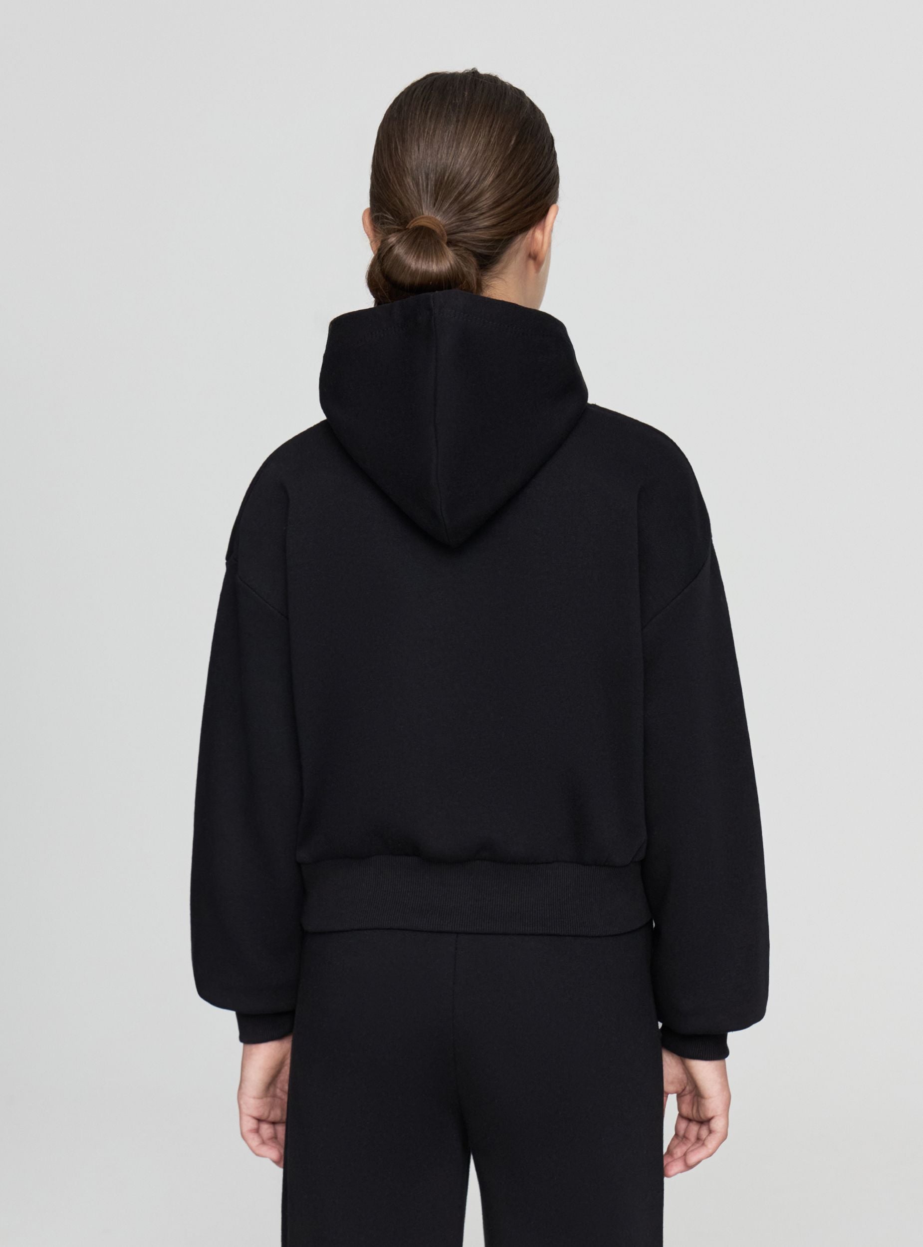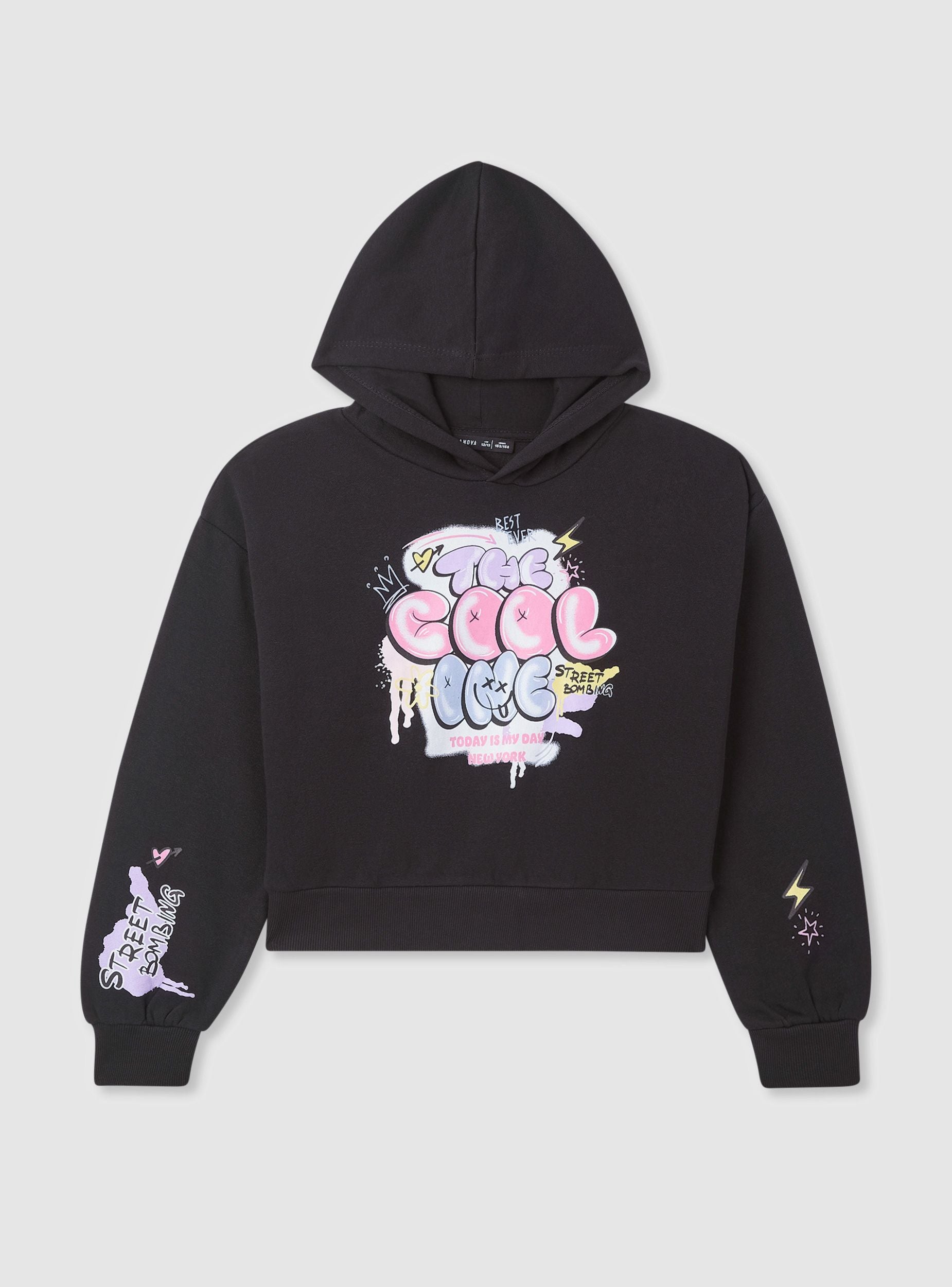 Heavyweight girls' hoodie, ideal for a casual and fashionable look. It features an eye-catching graffiti-style print on the front and graphic details on the sleeves. The cropped fit makes it perfect for pairing with jeans or high-waisted trousers. A versatile and comfortable garment, suitable for leisure time and informal days.Details