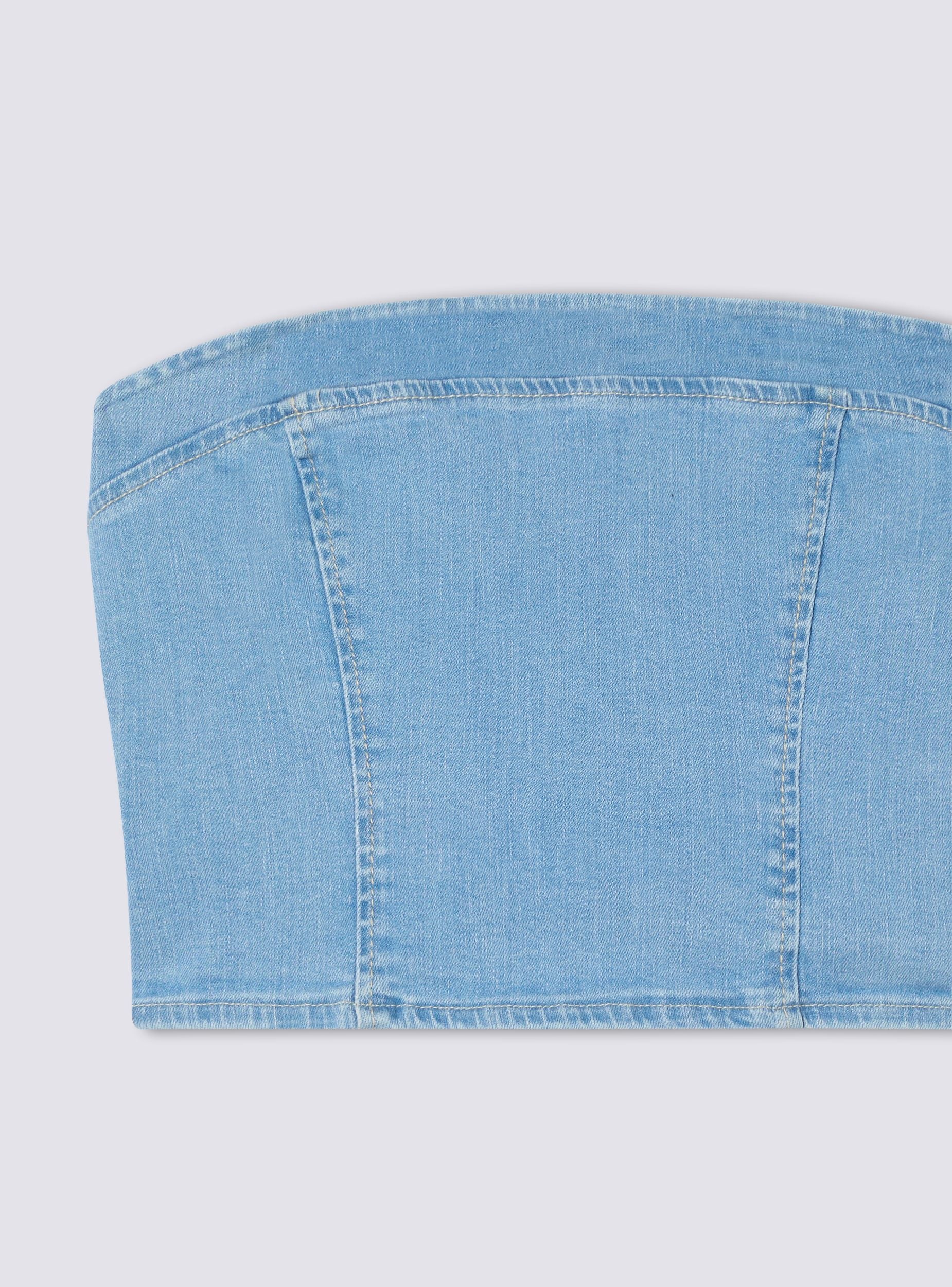 Women's denim bandeau top, ideal for a modern and fashionable look. It features a zip closure at the back that adds a touch of practicality and style. Perfect for pairing with high-waisted trousers or skirts, this top stands out for its fitted silhouette and minimalist design. Ideal for casual occasions or summer evenings.Details