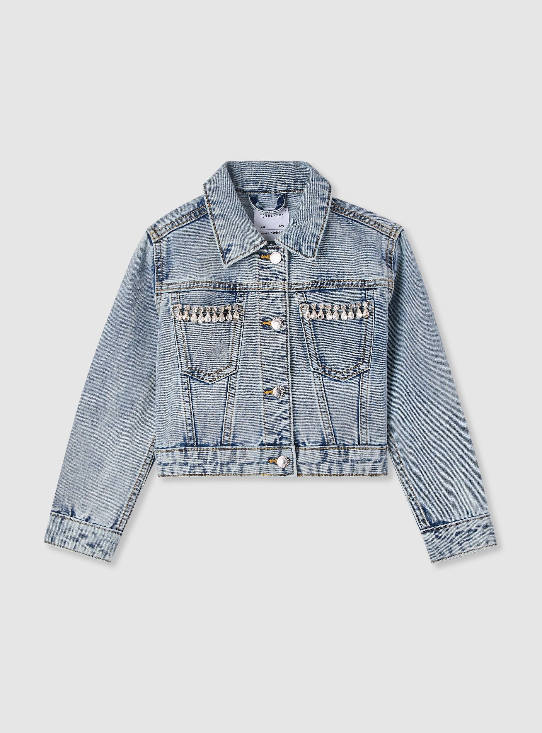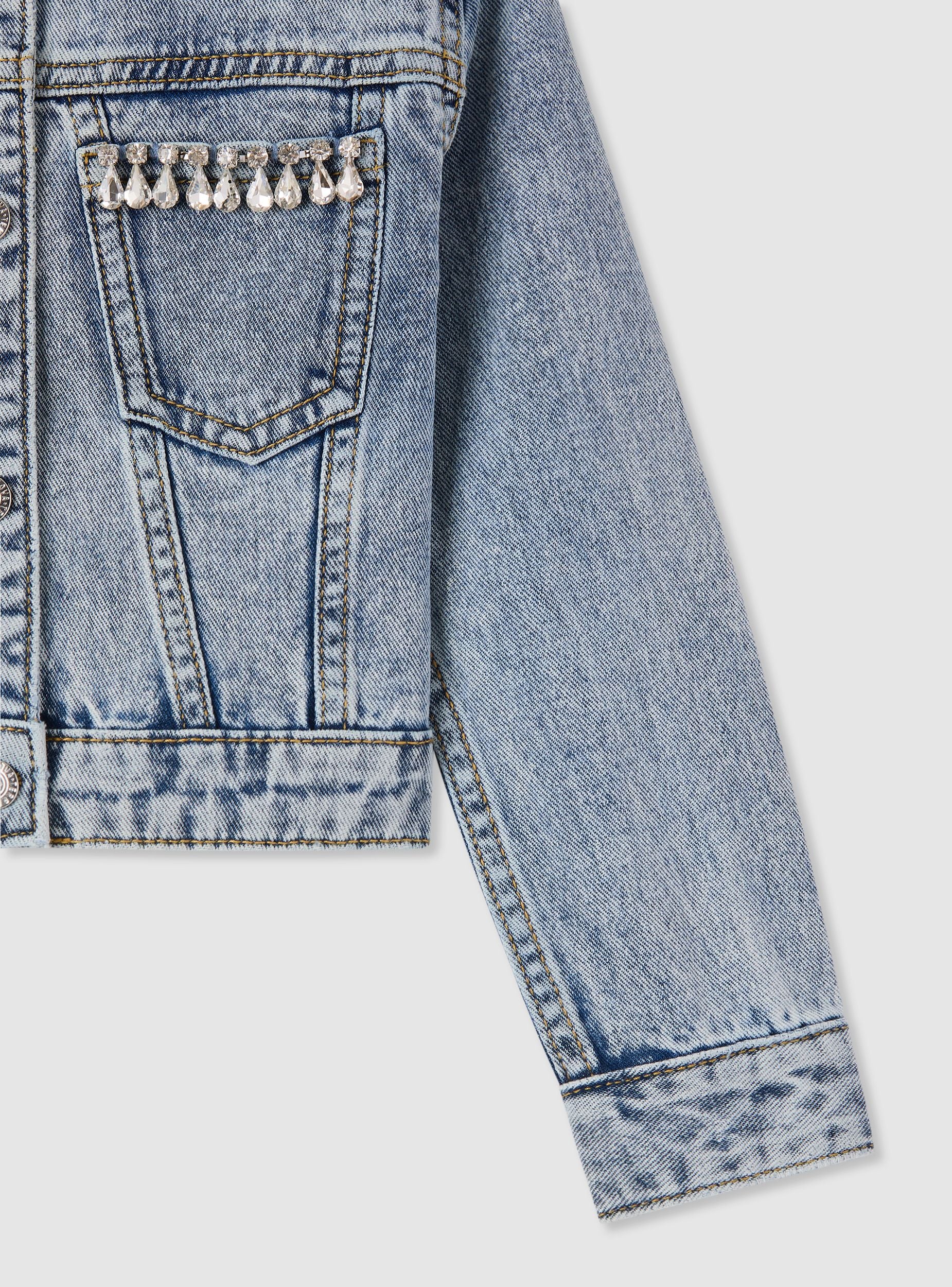 Girls' denim jacket with a shirt collar, long sleeves, and front snap button closure. Two chest pockets with flaps decorated with glitter-effect appliqués, plus decorative stitching that defines the silhouette. Perfect for casual wear and urban looks, to be paired with a T-shirt and jeans or a dress for a sparkling touch. Regular fit.Details