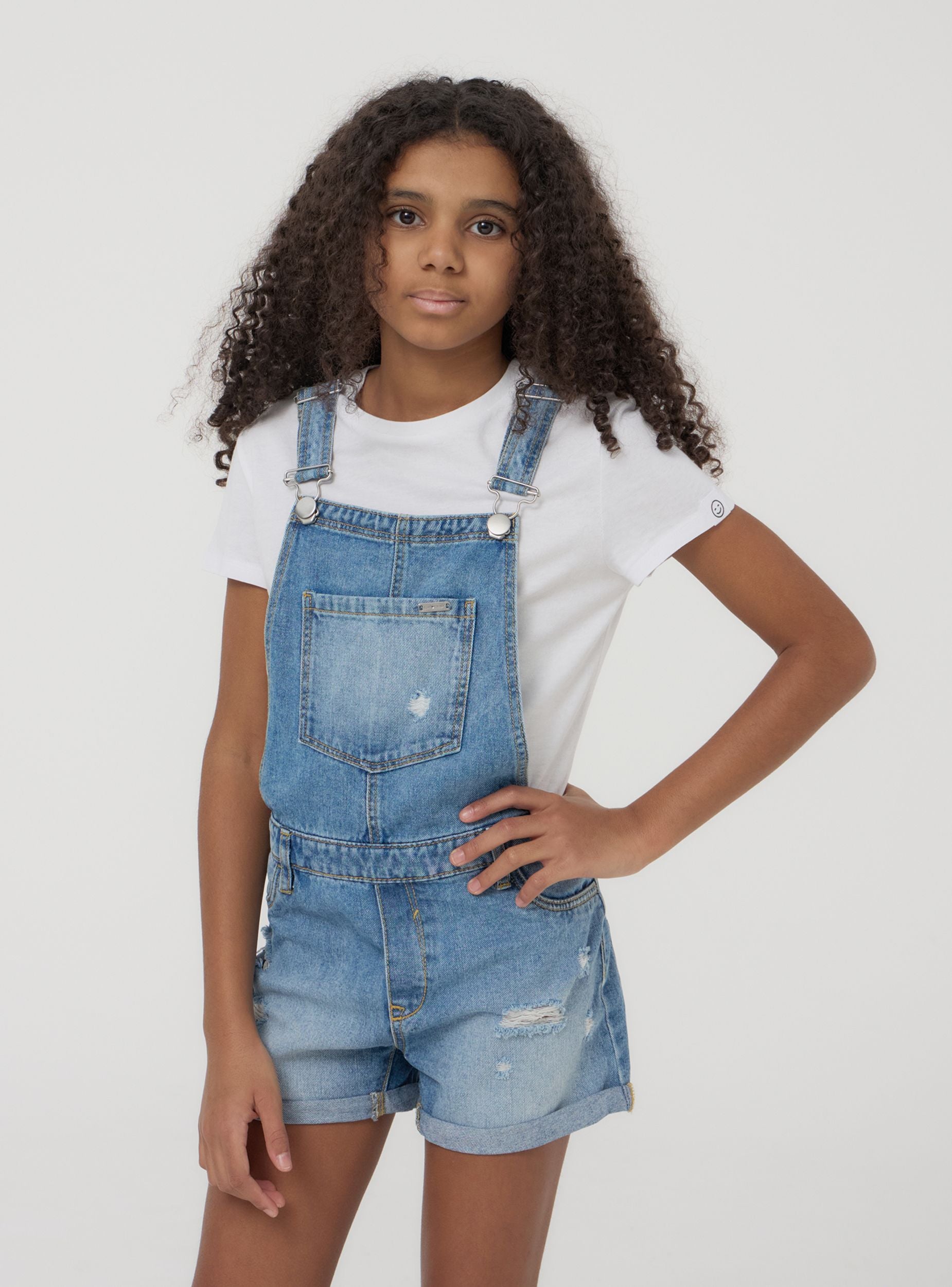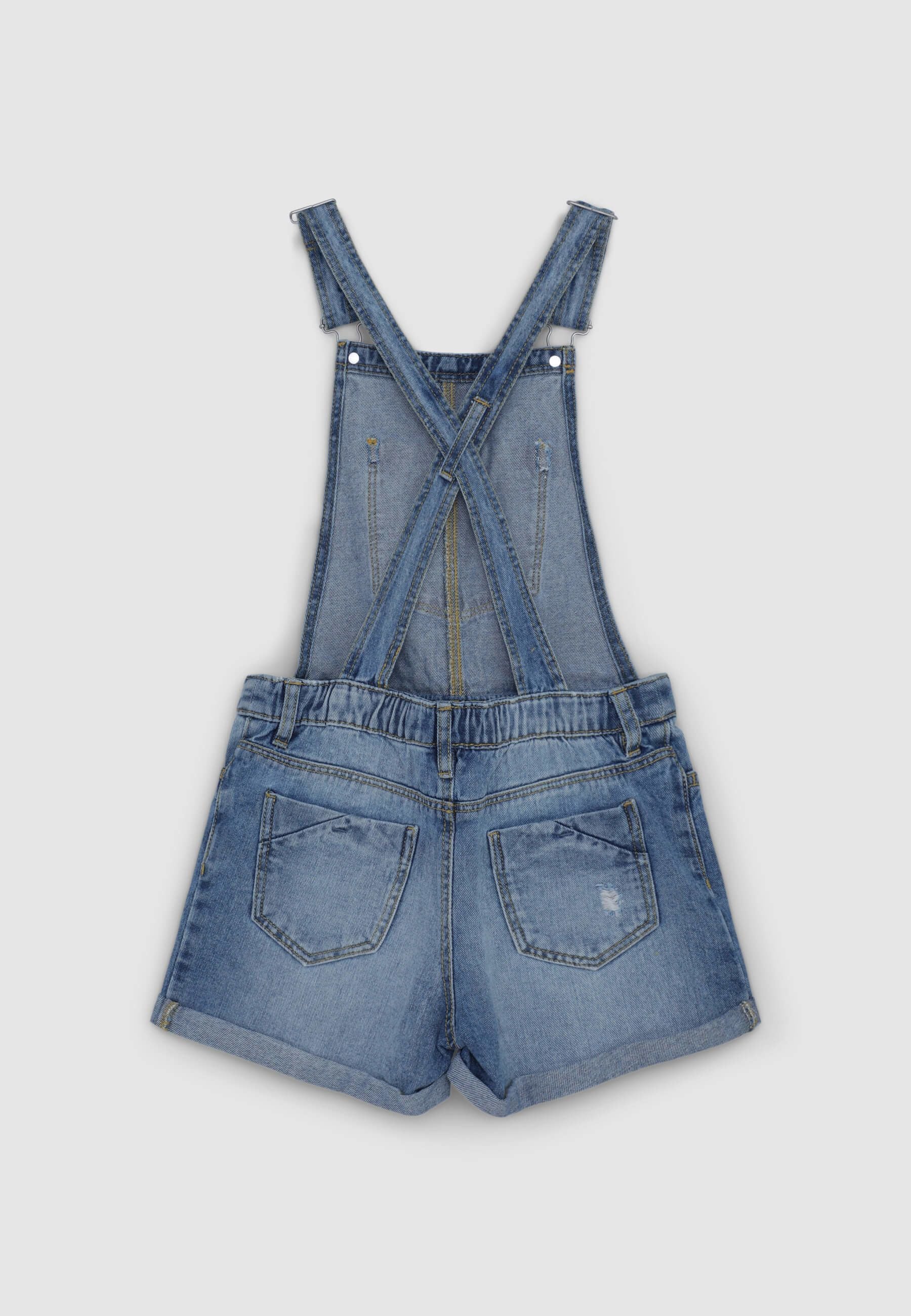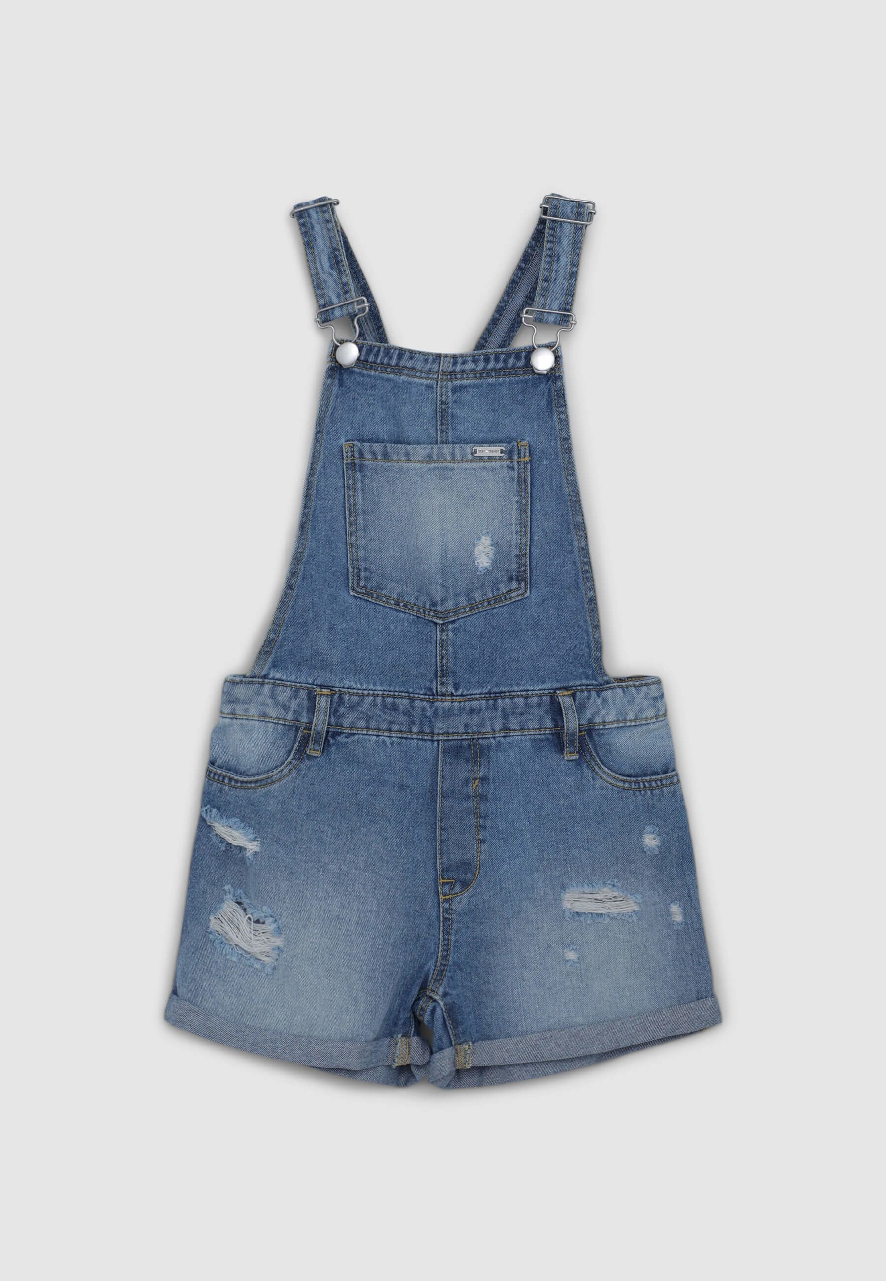 Girls' dungarees featuring adjustable straps that cross at the back, ensuring a comfortable fit. At the front, it has a central chest pocket, along with additional pockets both at the front and back, perfect for a casual and practical look. The design is enhanced by decorative distressed details that give it a modern and trendy touch. The lower part consists of shorts with a turned-up hem, adding a stylish detail. Ideal for summer and spring days, it can be paired with lightweight t-shirts and sneakers for a relaxed and fashionable look. Perfect for playing outdoors or for a casual day with the family.Details