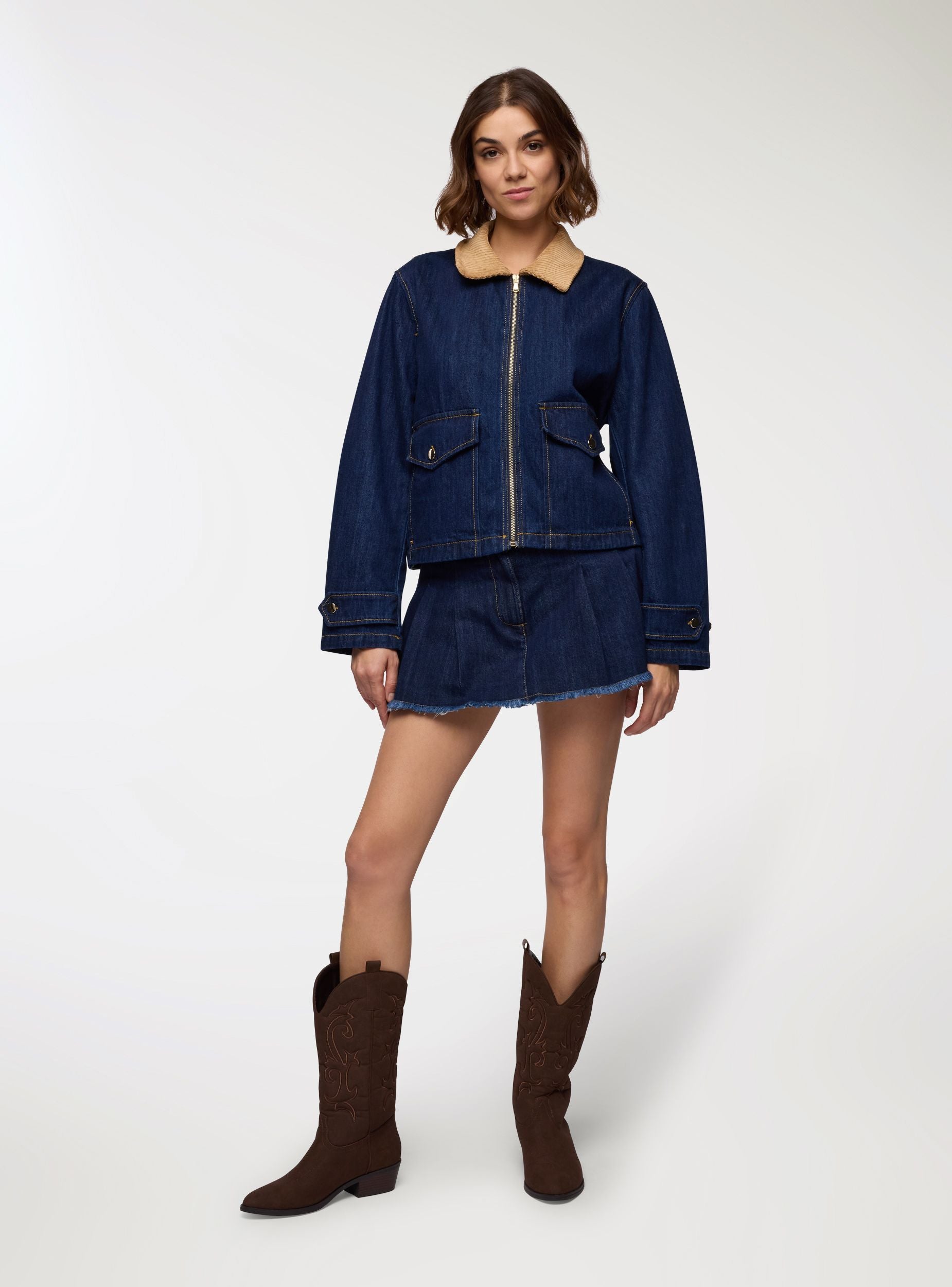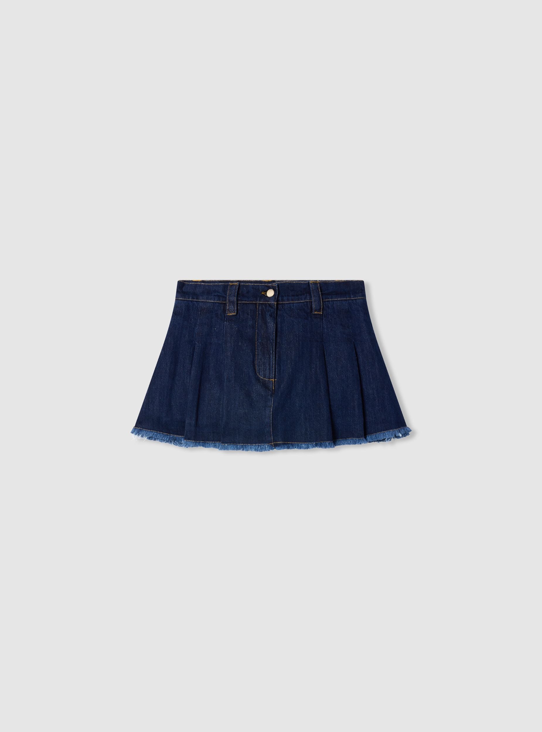 Women's solid-colour denim mini skirt with sharp pleats for a pleated effect. Waist with belt loops and front closure with button and zip, frayed hem for a bold touch. Ideal for casual or urban looks with a t-shirt and sneakers, it also suits evening combinations with a shirt and ankle boots.
