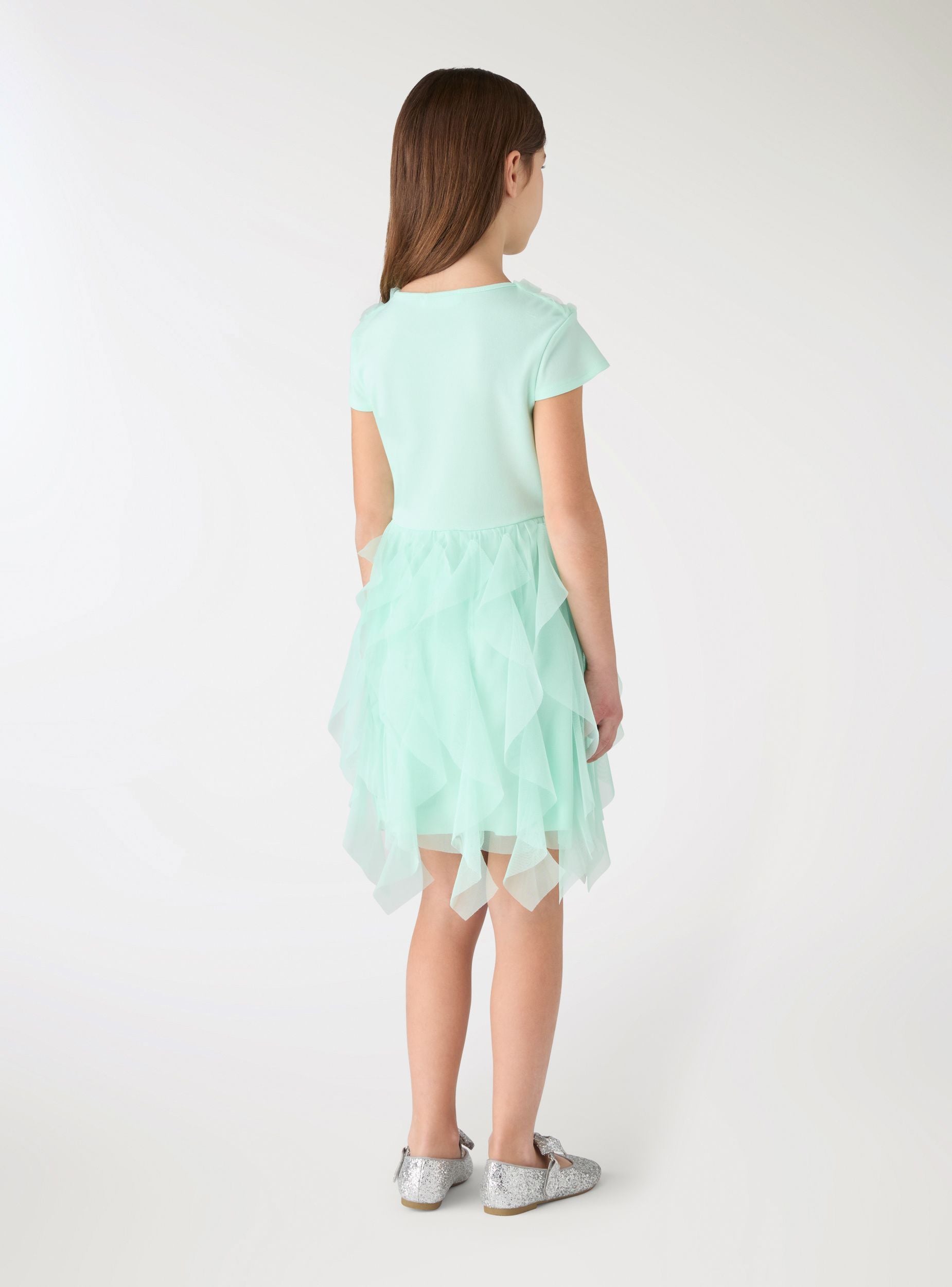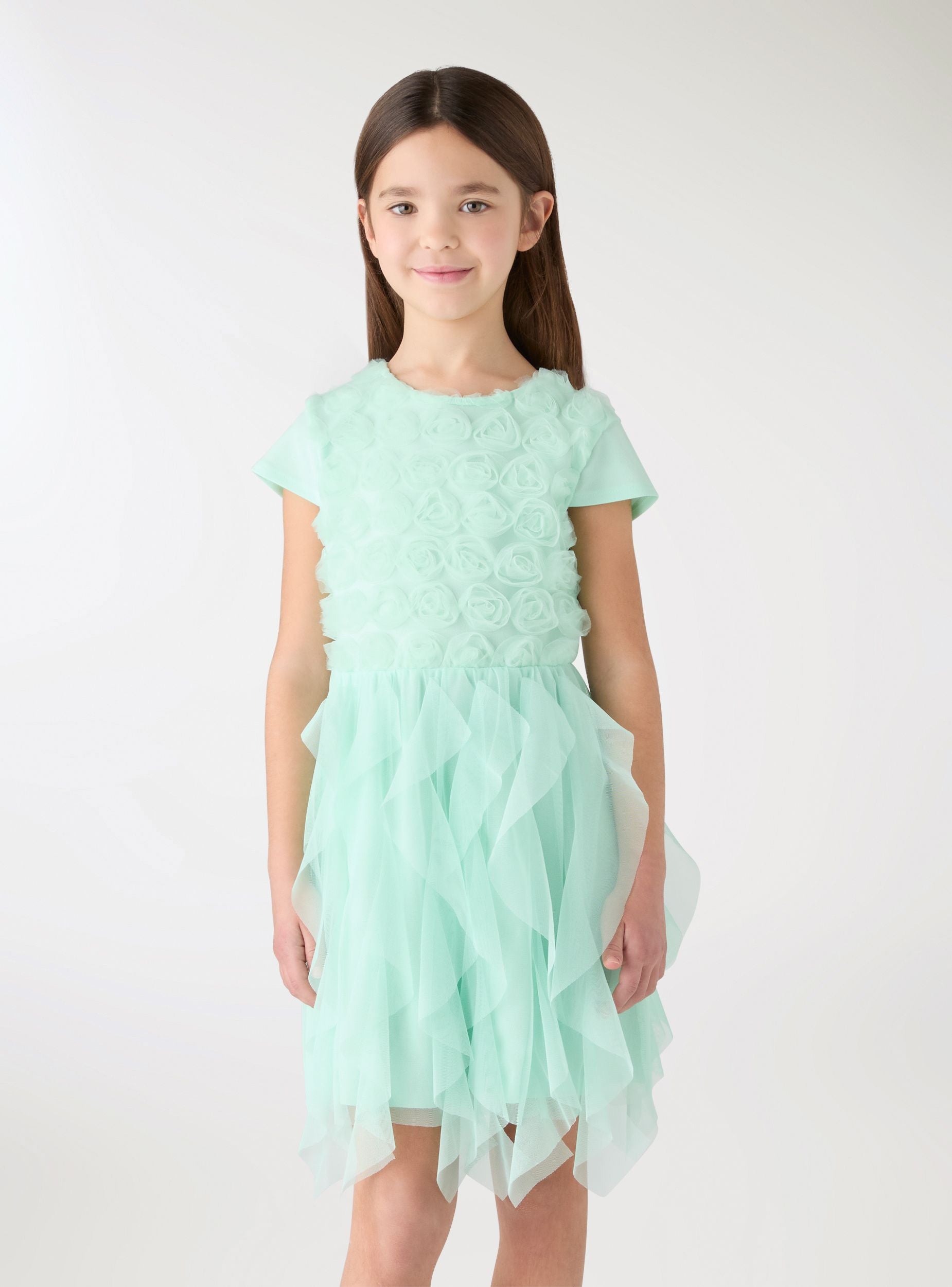 Girl's dress with raised floral appliqués on the bodice and a skirt with airy tiers. Ideal for ceremonies and special occasions. Short sleeves and a round neckline, perfect to pair with ballerina shoes and a small handbag. The pattern is plain, with a rich texture that adds movement and a romantic look.