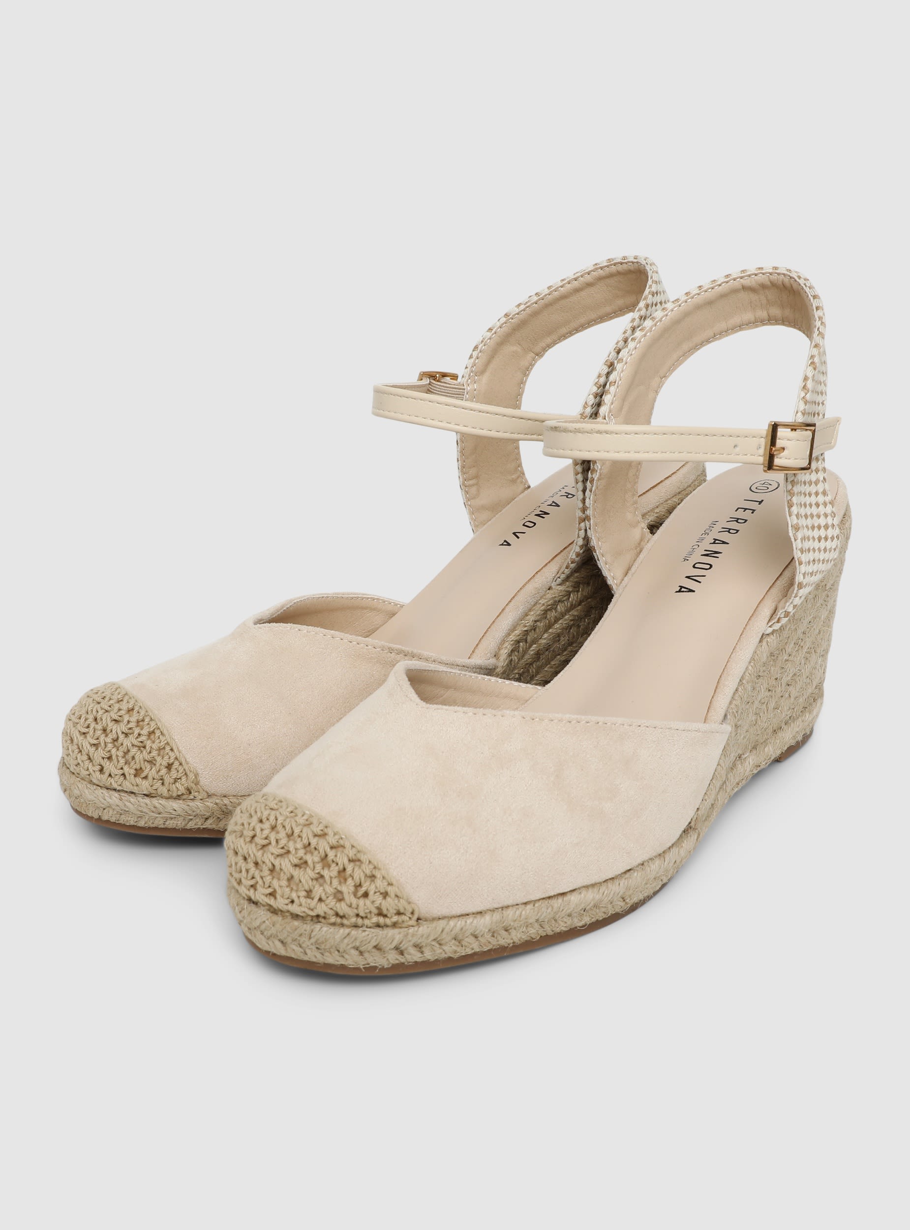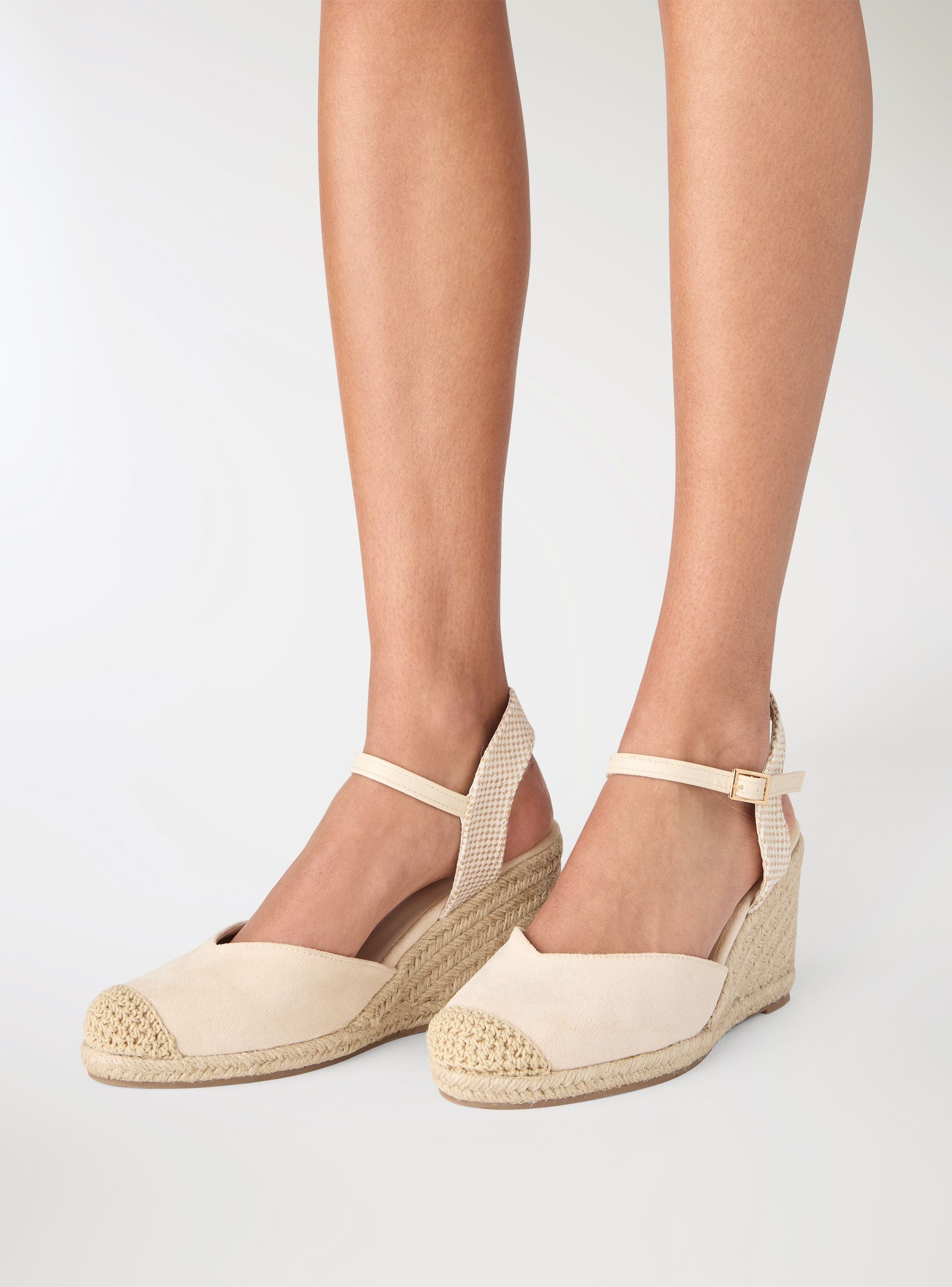 Women's espadrille-style sandal with a high woven wedge, perfect for the summer season. The plain-coloured upper features a rounded toe with crochet detail and an ankle strap with a gold buckle for a secure and adjustable fit. The rear strap has a geometric texture that adds a touch of originality to the design. Ideal paired with light dresses, shorts, or jeans, for a versatile and feminine look suitable for both day and evening.