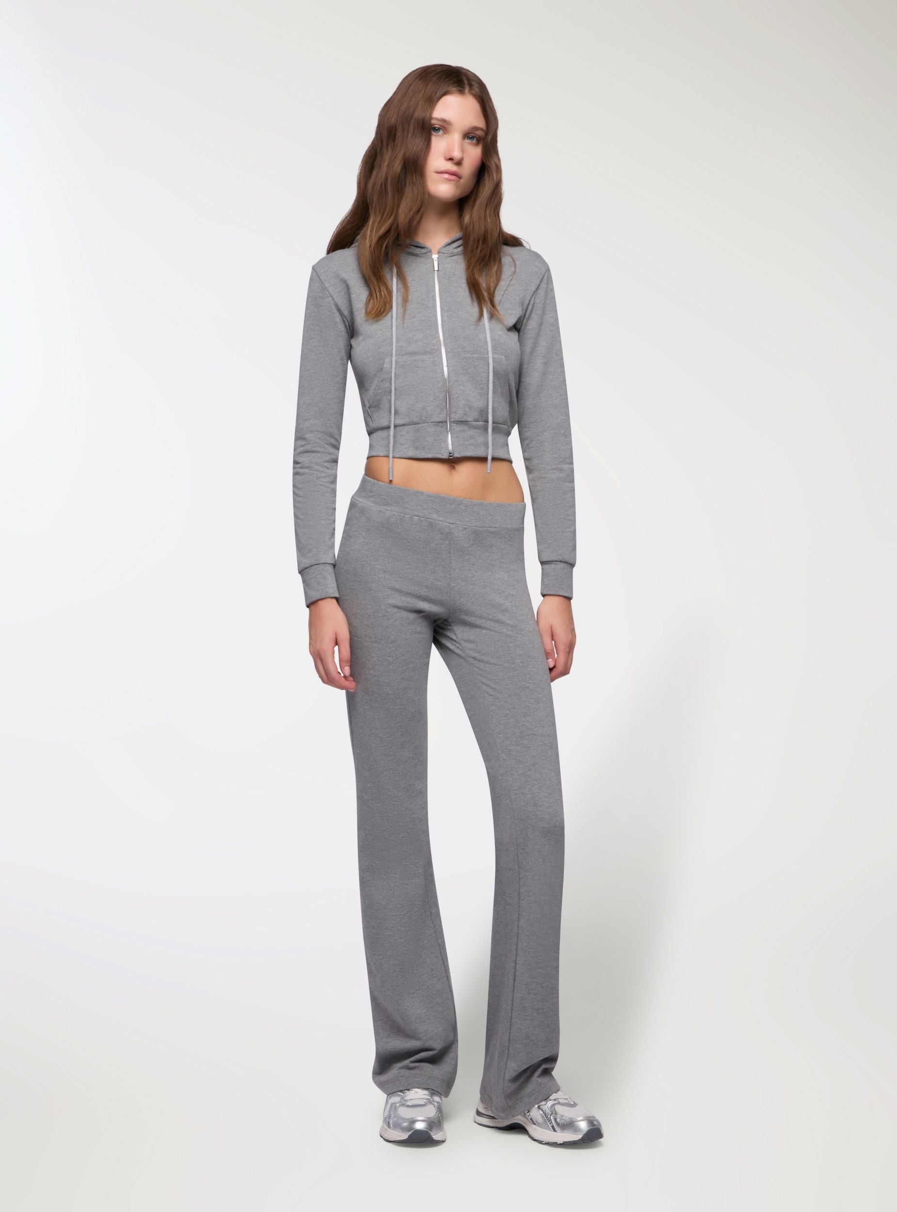 Women's hoodie with front zip. Short style with a cropped fit, long sleeves and ribbed cuffs. Features kangaroo pockets and adjustable drawstrings on the hood. Perfect for leisure time and urban looks with jeans or leggings. Also ideal over tops and vests for a layered effect. Plain design, practical for everyday wear.Details