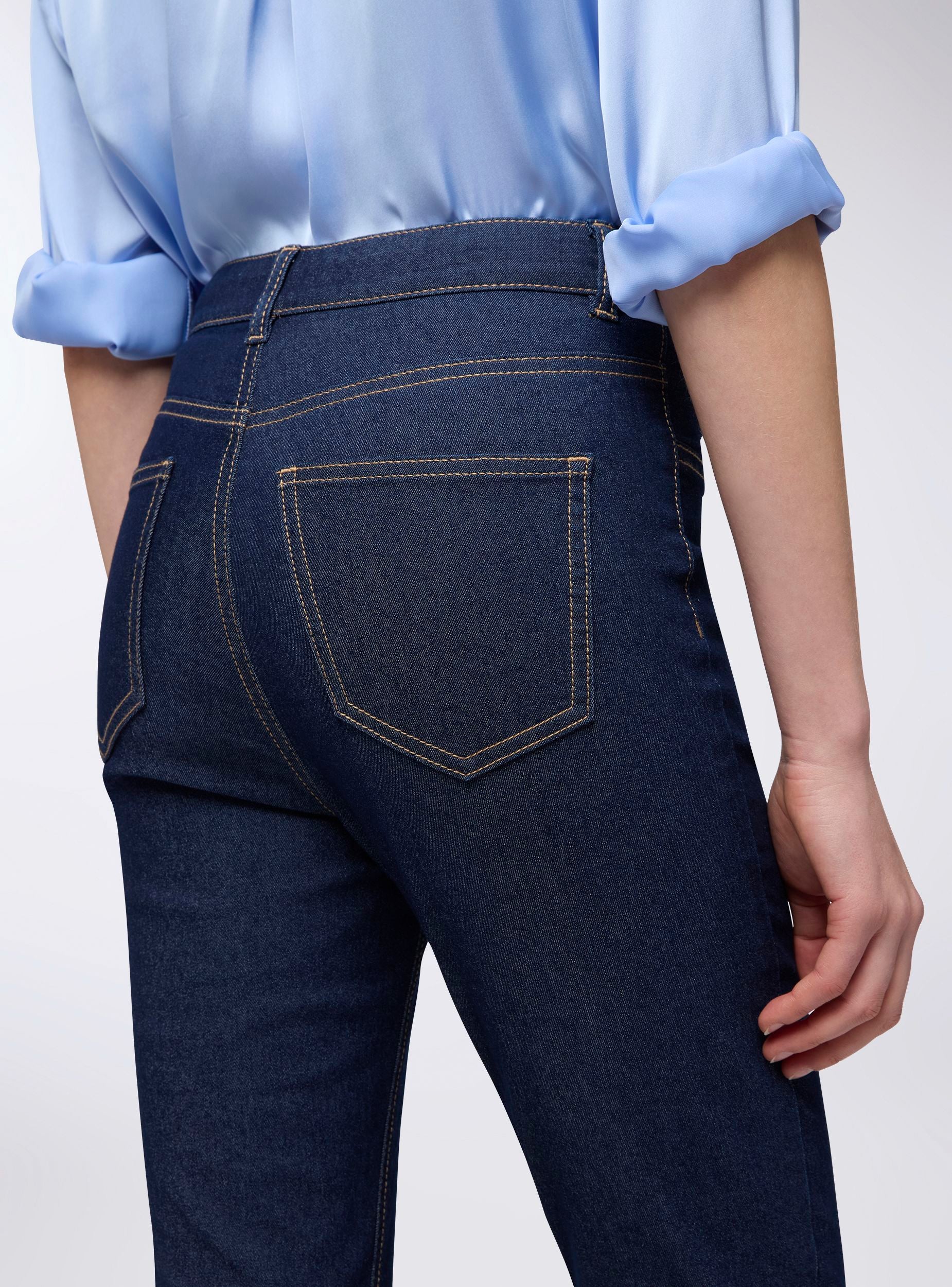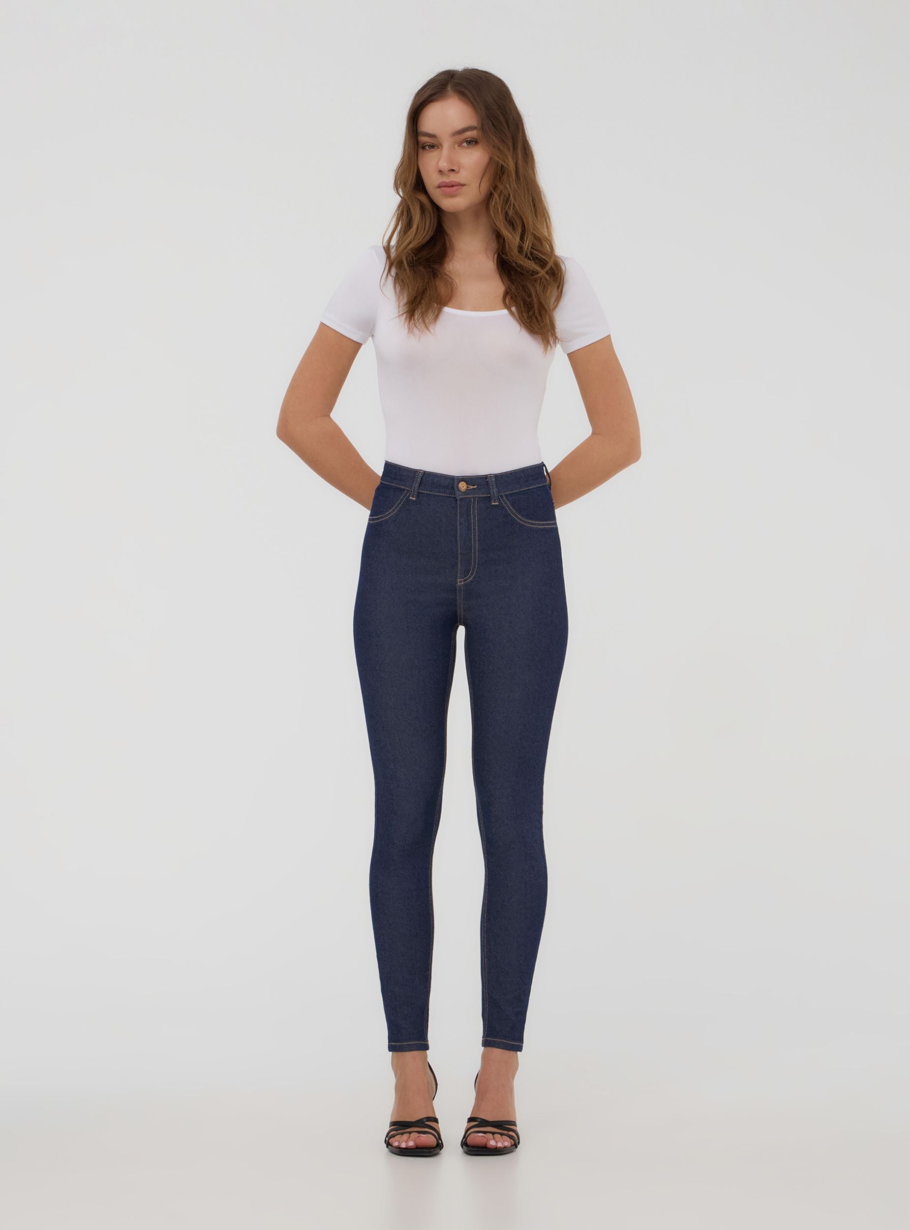 High-waisted women's jeggings, featuring a slim silhouette that follows the line of the leg. The front zip and button closure ensures a secure and comfortable fit, while their stretchiness makes them ideal for a casual yet polished look. Perfect for everyday wear, these jeggings can be paired with a t-shirt and trainers for a laid-back look, or with a soft shirt and ankle boots for a more refined outfit. Thanks to their versatility, they suit both relaxed settings and occasions where a touch of elegance is required.Details