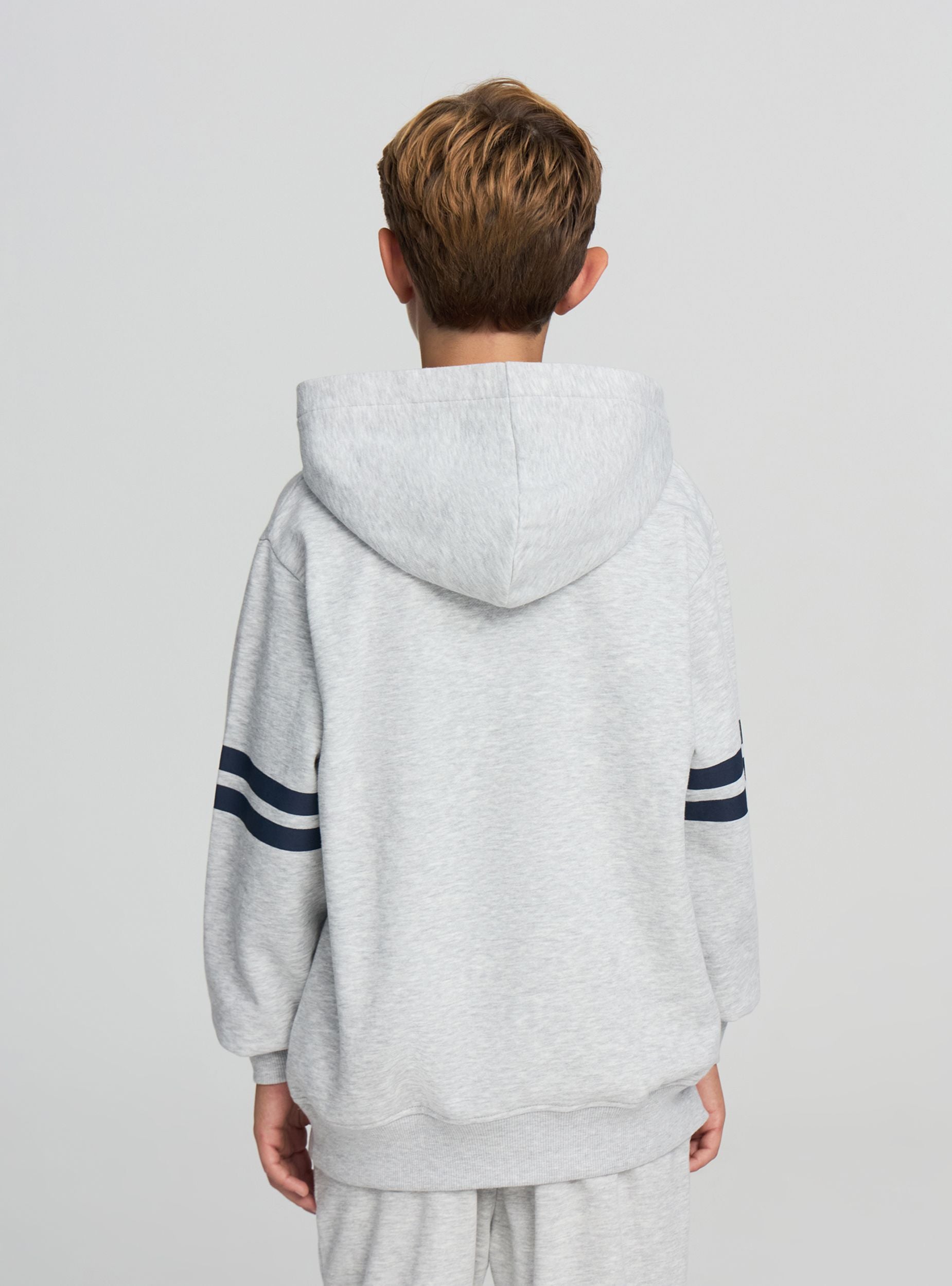 Heavyweight children's hoodie, ideal for a casual and sporty look. It features a college print on the front that adds a touch of style. The long sleeves with stripes and the hooded design make it perfect for cool days. It can be paired with jeans or sports trousers for a comfortable and fashionable outfit.Details