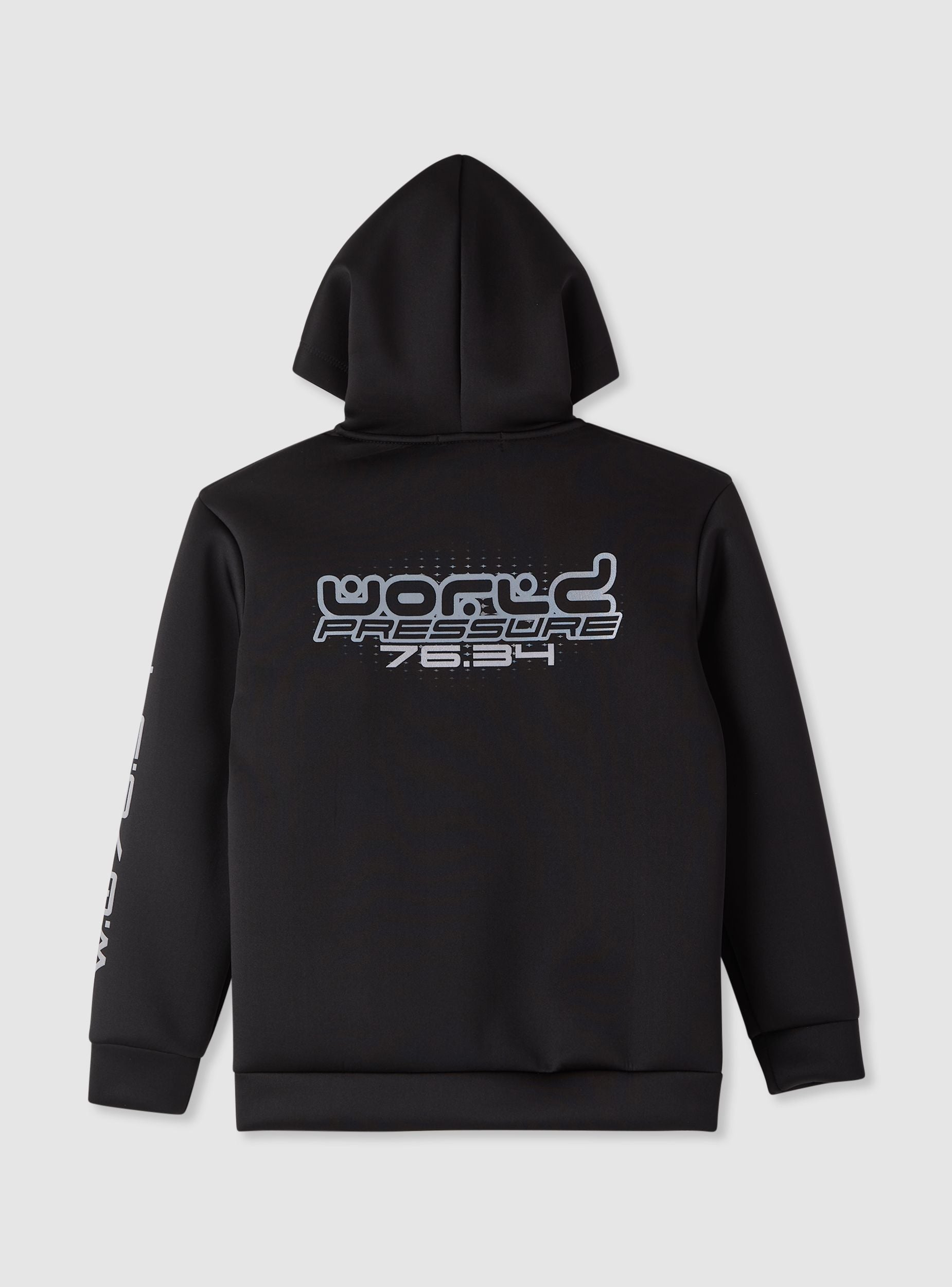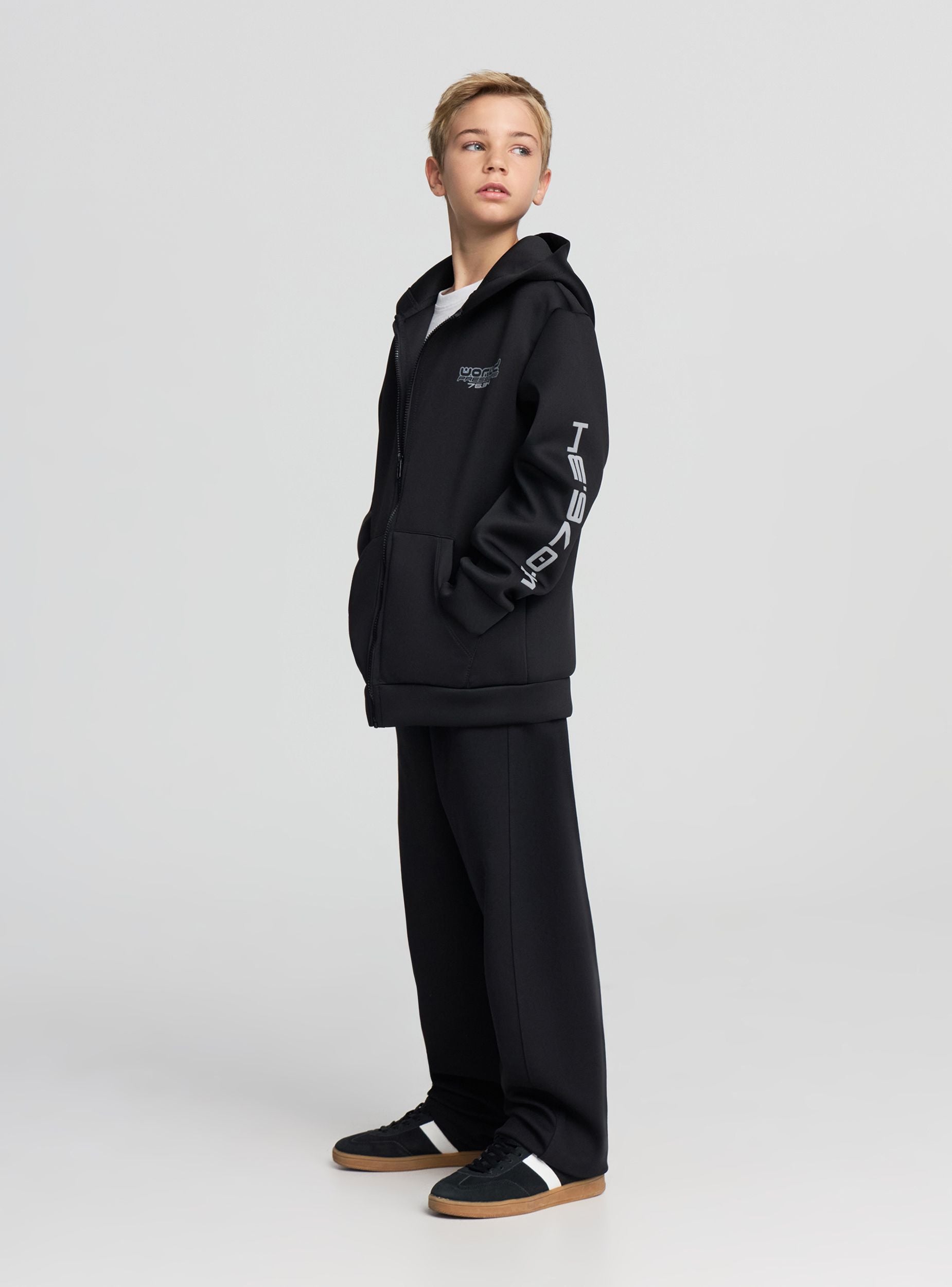 Children's hoodie with front zip. Ideal for leisure time and an urban look, it pairs well with jeans or sweatpants. Kangaroo pockets, ribbed cuffs and hem, front and back print. Regular fit. Heavy fabric.Details