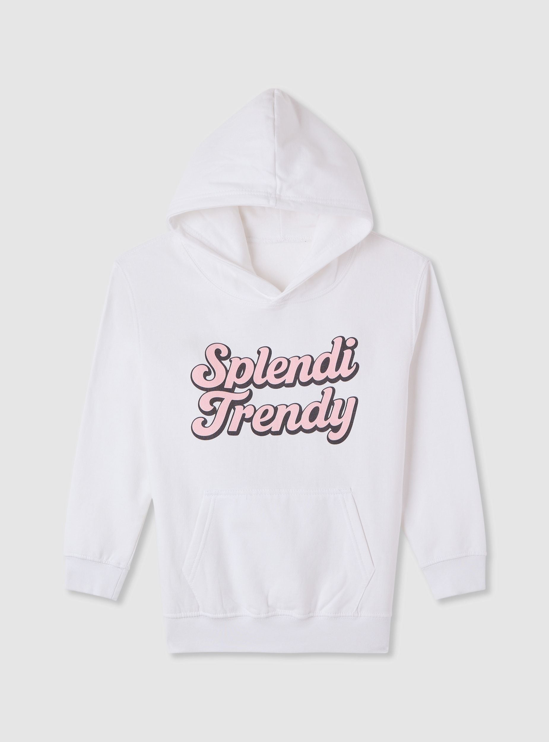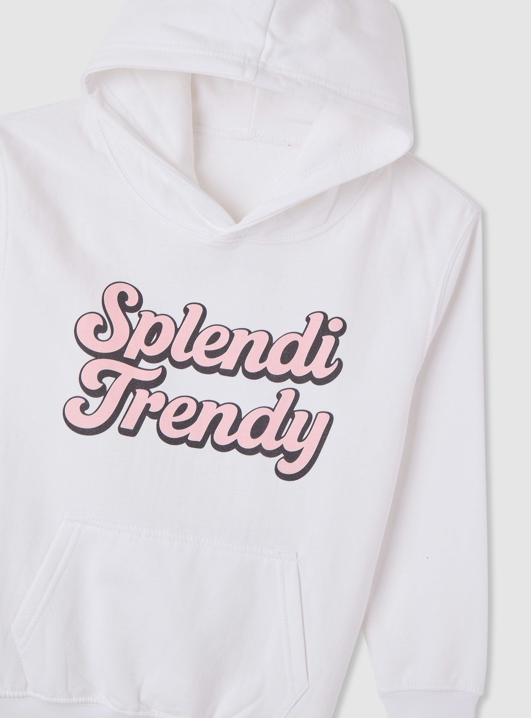 Girls' hooded sweatshirt, without a zip and with a comfortable fit, ideal for school and leisure time. Heavyweight plain model with a front print featuring lettering and a graphic on the back. Complete with a kangaroo pocket, long sleeves, and ribbed cuffs and hem, perfect with jeans or leggings for practical looks.Details