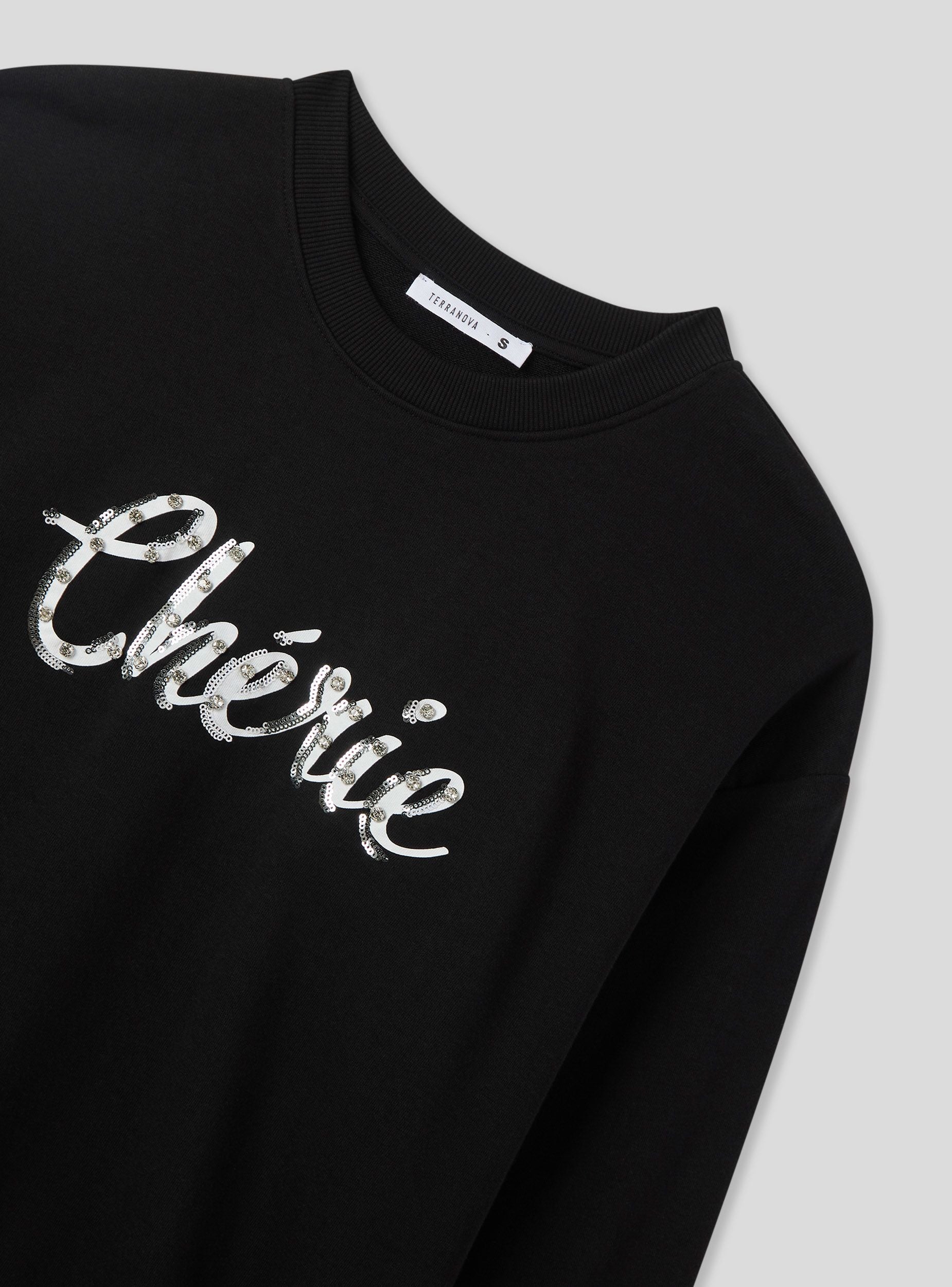 Light women's sweatshirt with a versatile design, perfect for adding a touch of style to your everyday look. The long-sleeved, hoodless, and zipless model stands out for the decorative writing on the front, enhanced by bright appliqués that highlight its character. Ideal for casual pairings with jeans and sneakers or for a more refined outfit with trousers and loafers. A trendy piece to wear in any season.Details