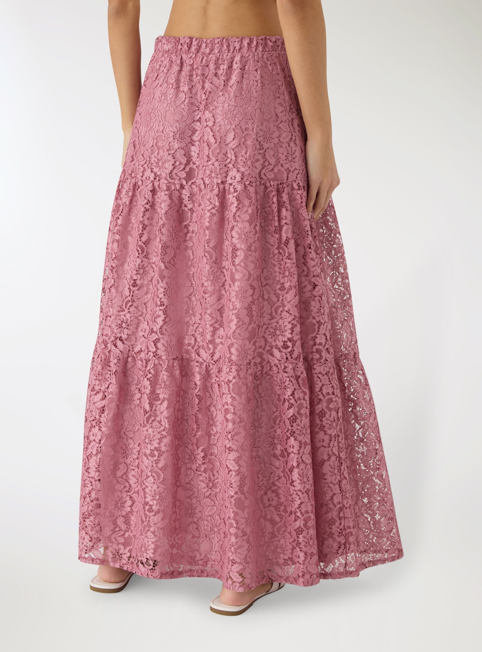 Women's lace skirt, long length with a flared silhouette featuring tiered ruffles. Elasticated waist for a comfortable fit and easy wear. Perfect for ceremonies, evenings, and special occasions, pairs well with soft shirts or fitted tops and sandals. Solid colour design with floral lace detailing that adds movement and femininity.Details