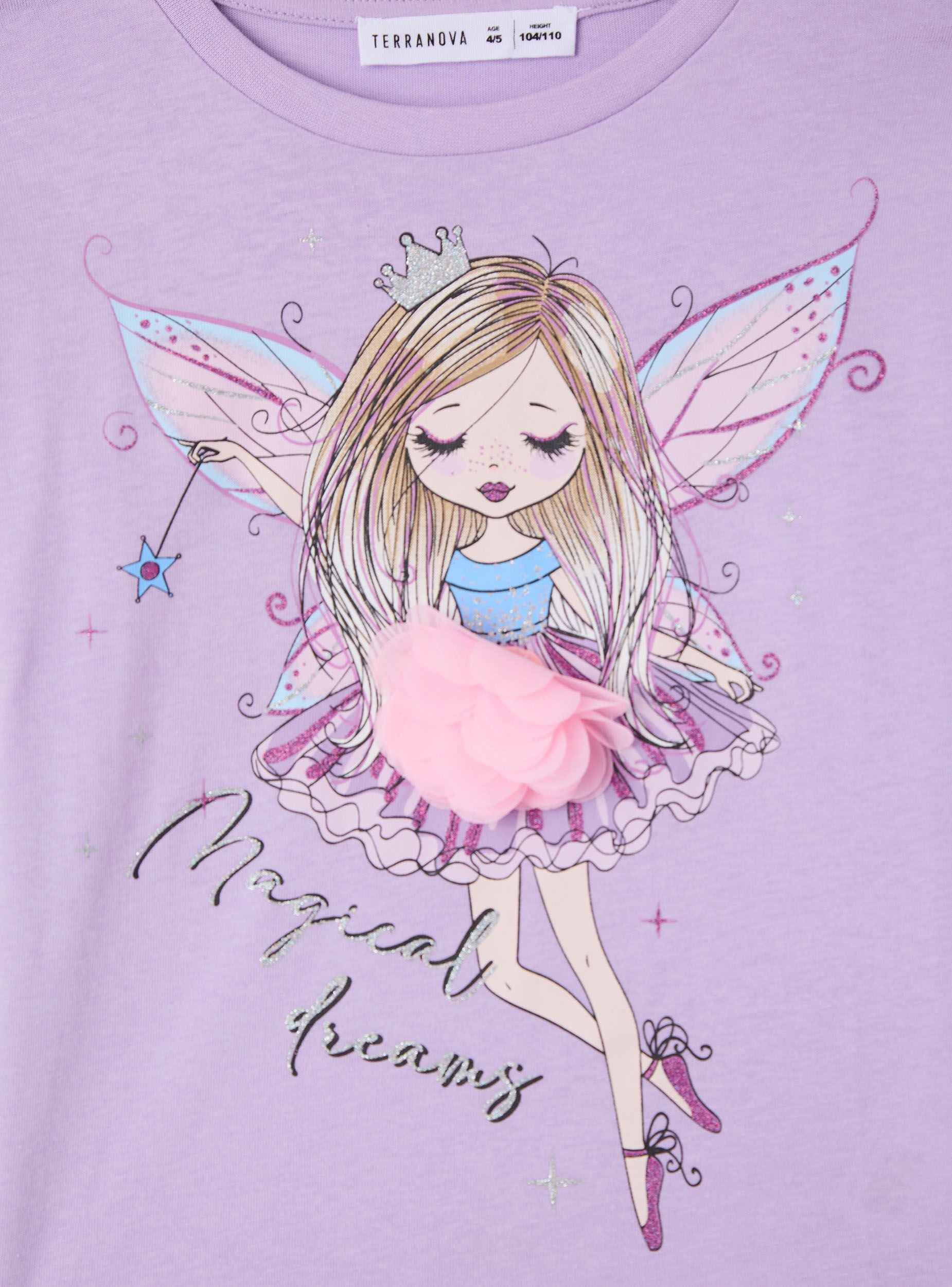 Long-sleeved girl's T-shirt with a round neckline and regular fit. The front features a fairy print with writing and a 3D flower application, ideal for school and leisure time. Gathered shoulders with small ruffles add a romantic touch. Easy to pair with jeans or a skirt with trainers or ballet flats.Details
