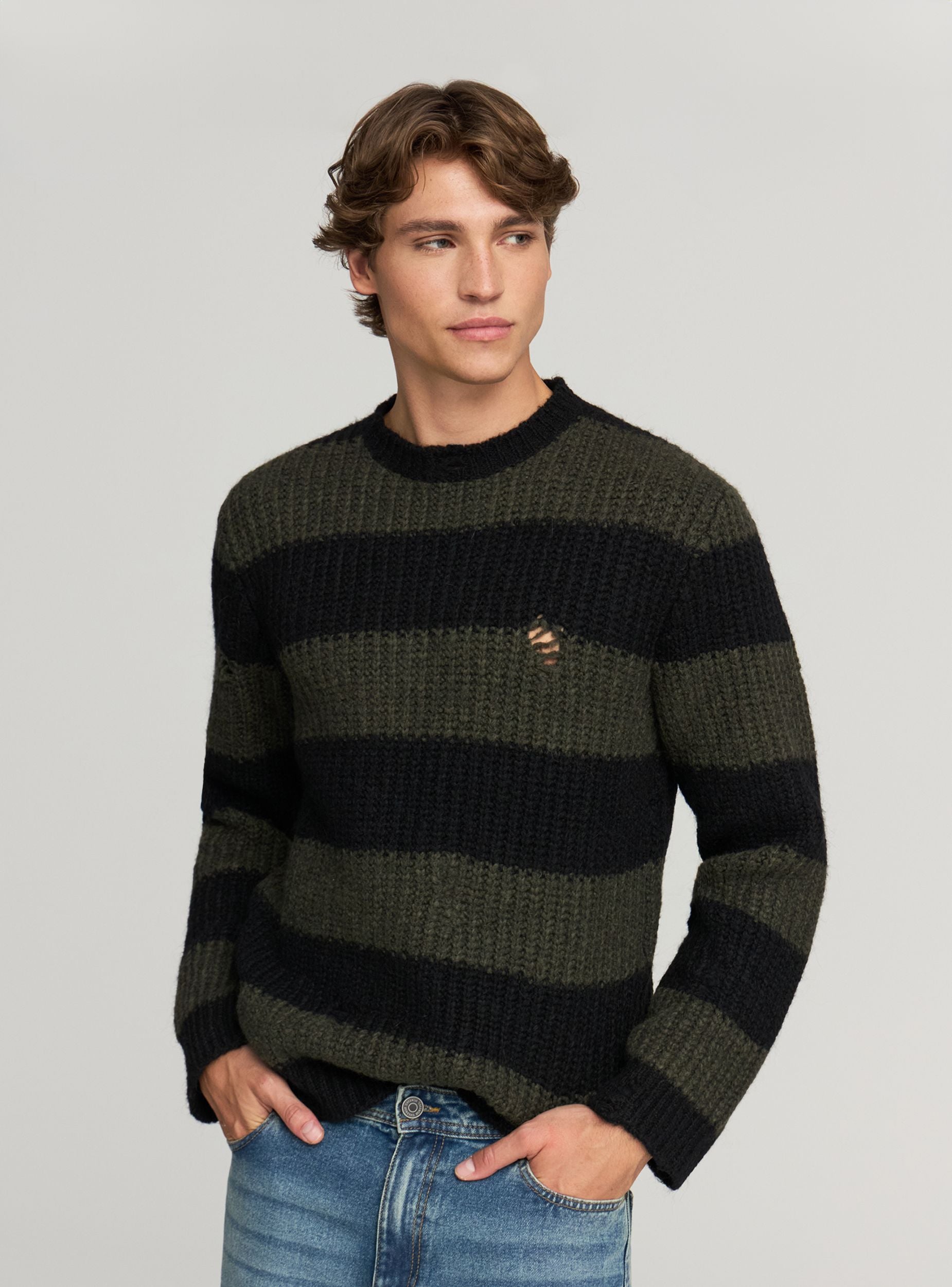Men's striped jumper, knitted with a chunky stitch, featuring a crew neck and long sleeves. The design includes decorative rips that add a rugged touch. Ribbed cuffs and hem for a comfortable fit. Perfect for casual outfits with jeans and trainers, ideal for leisure time and mid-season days.Details