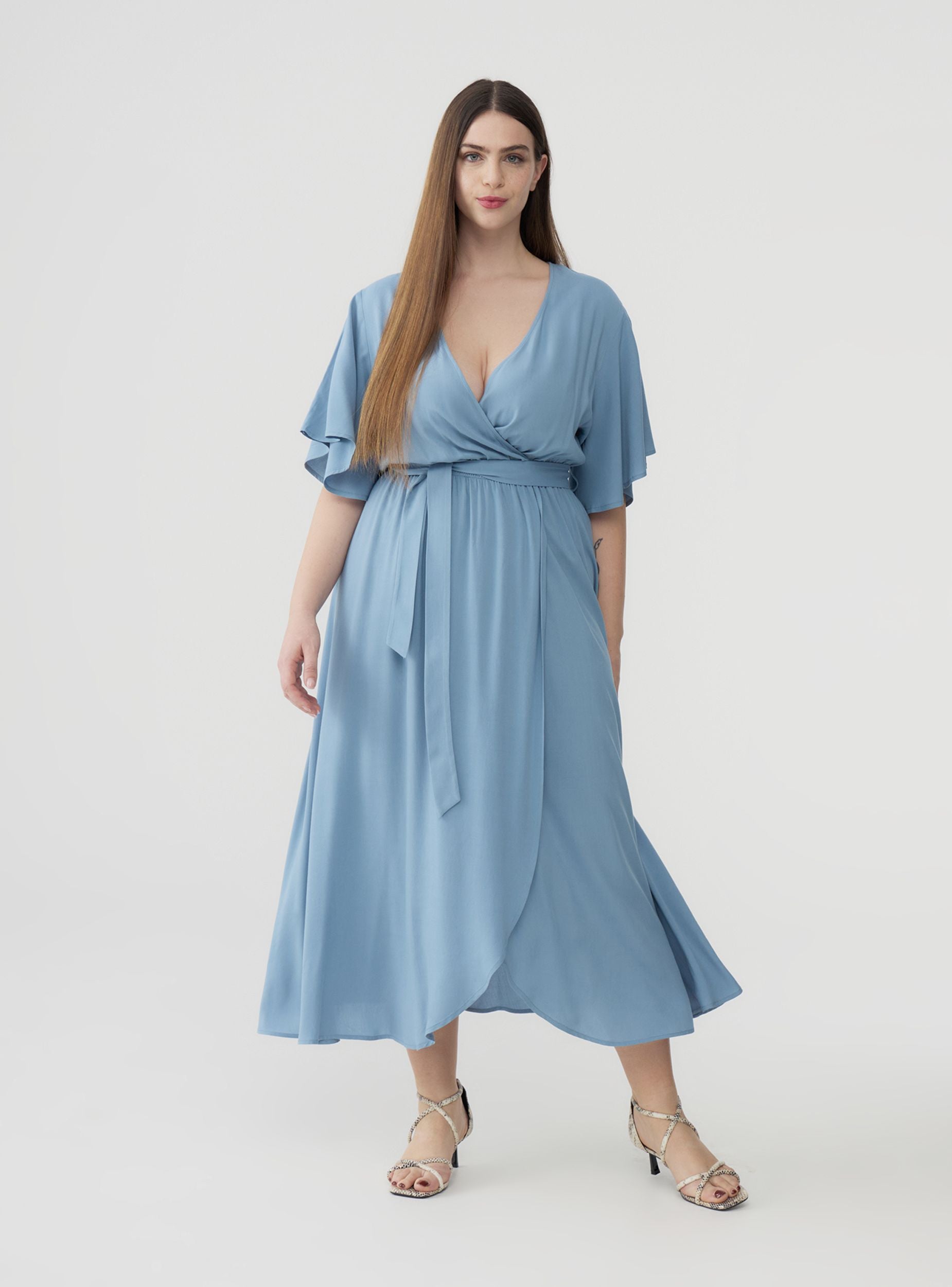 Long plain women's dress, characterised by a fluid and sophisticated line. The crossover design at the front creates a deep V-neckline, adding a touch of elegance to the garment. The wide short sleeves give a light and feminine look, ideal for the warm season. A matching belt at the waist allows for adjustable fit, enhancing the silhouette and adding a note of refinement. Perfect for casual occasions or summer evenings, this dress offers style and comfort in one solution, combining practicality and modern taste.Details