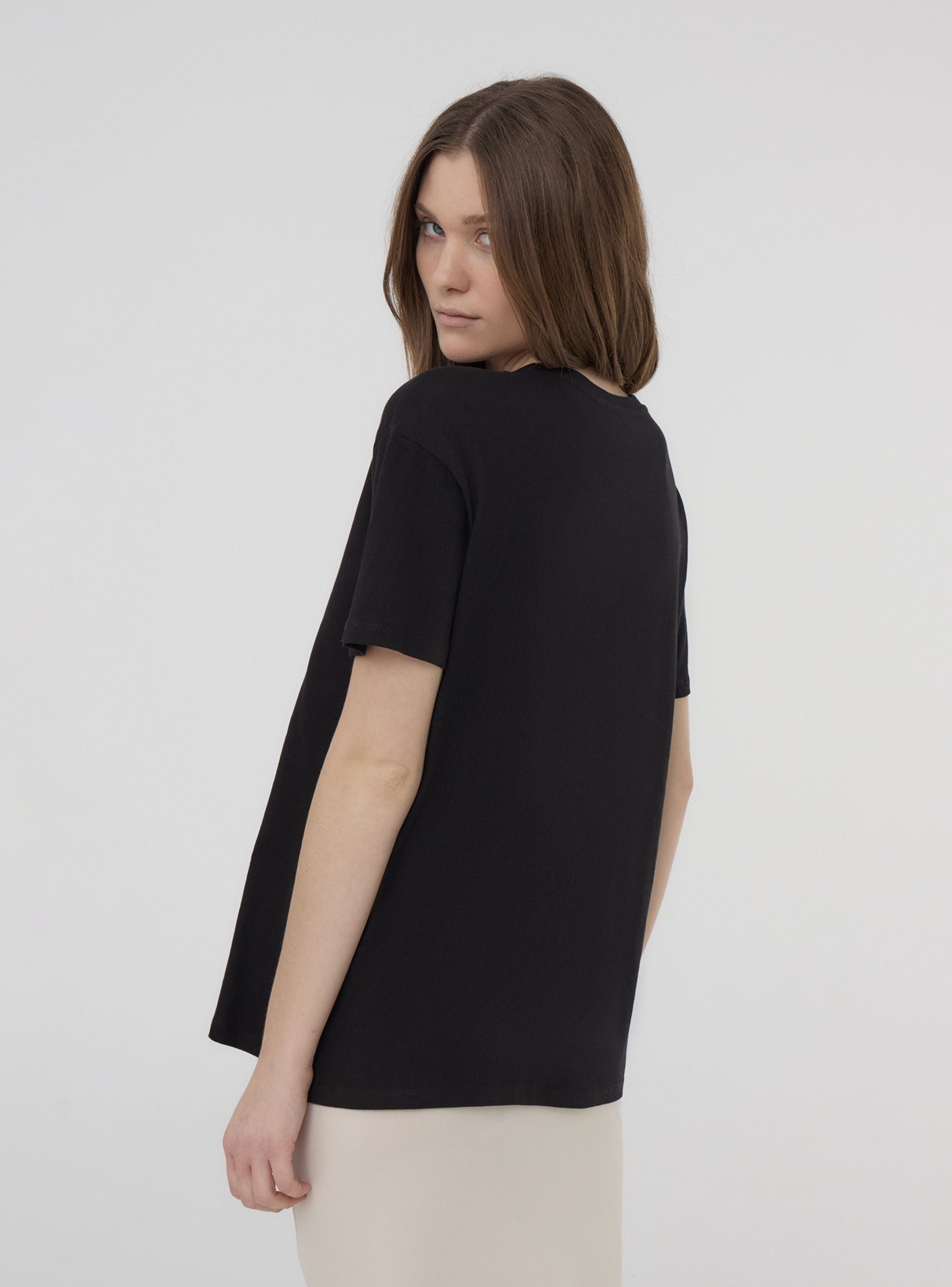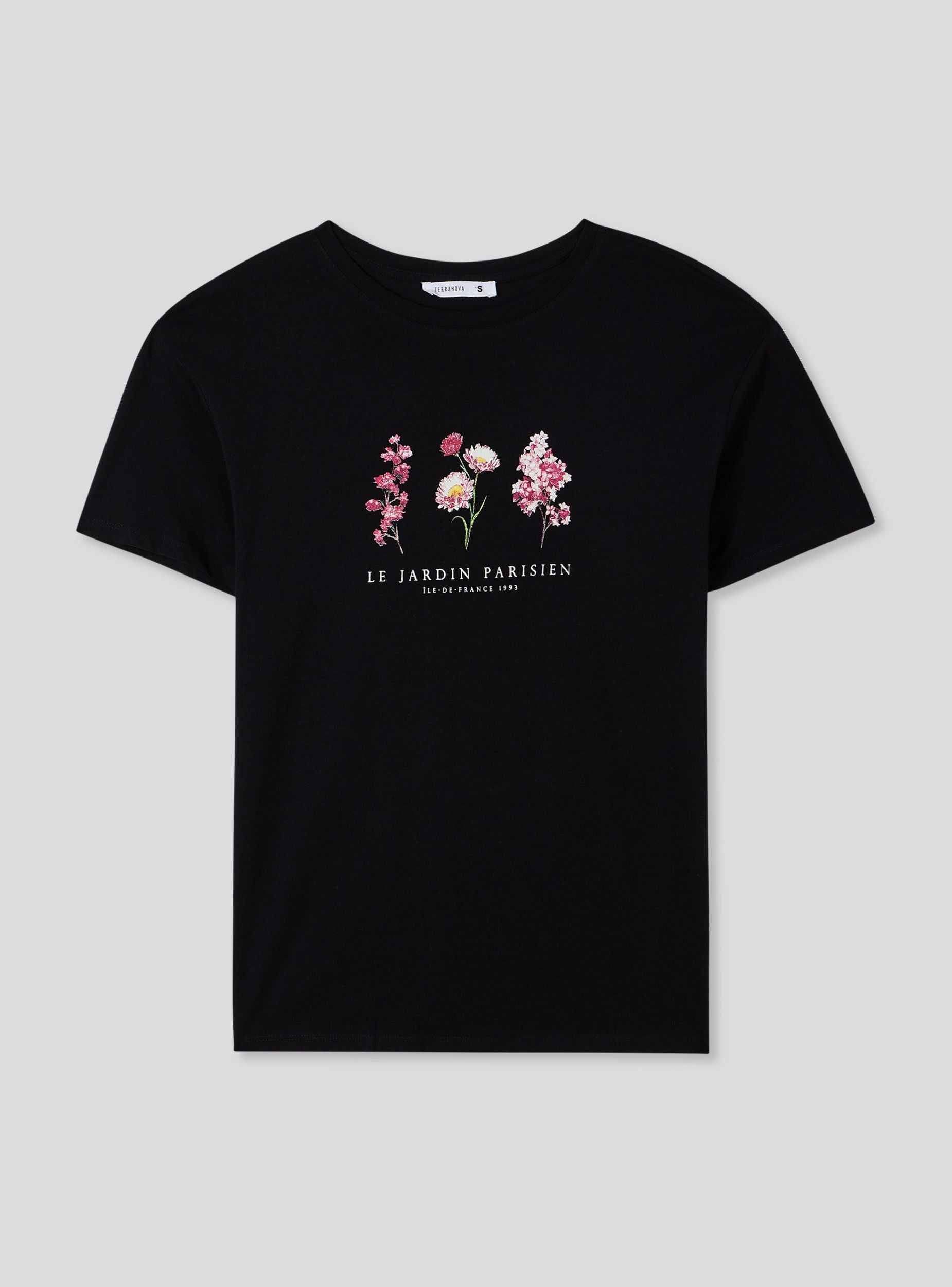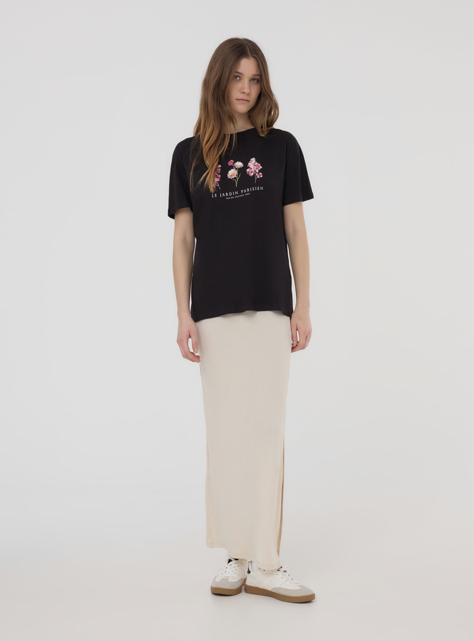 Wide-cut women's t-shirt, ideal for those looking for a comfortable and casual piece. The short sleeves and round neck make this t-shirt perfect for wearing during the warmer days, offering a relaxed fit. A floral print stands out on the front, accompanied by decorative writing, adding a feminine and romantic touch to the design. The print adds personality to the garment, making it suitable for both casual and more polished outfits. A t-shirt that combines comfort and style, perfect for completing a fresh and laid-back look.Details