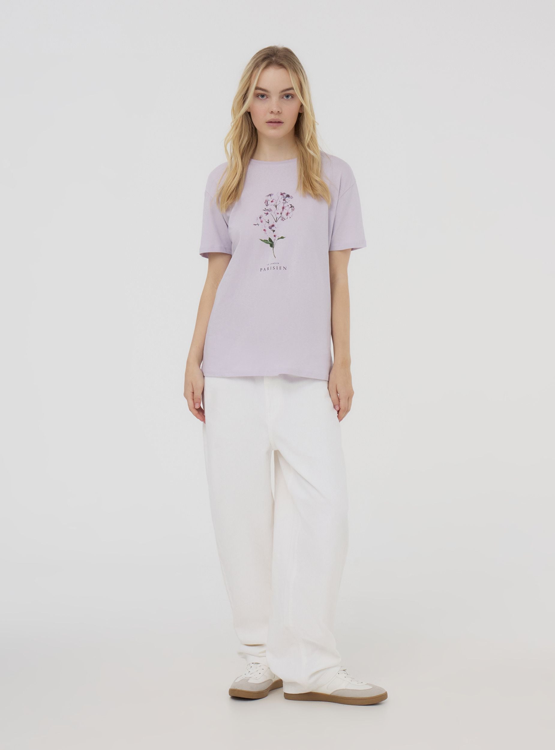 Women's t-shirt with a loose fit, ideal for those looking for a comfortable and casual piece. The short sleeves and crew neck make this t-shirt perfect for wearing on warmer days, offering a relaxed fit. A floral print stands out on the front, accompanied by decorative writing, adding a feminine and romantic touch to the design. The print adds personality to the piece, making it suitable for both casual and more polished outfits. A t-shirt that combines comfort and style, perfect for completing a fresh and effortless look.Details