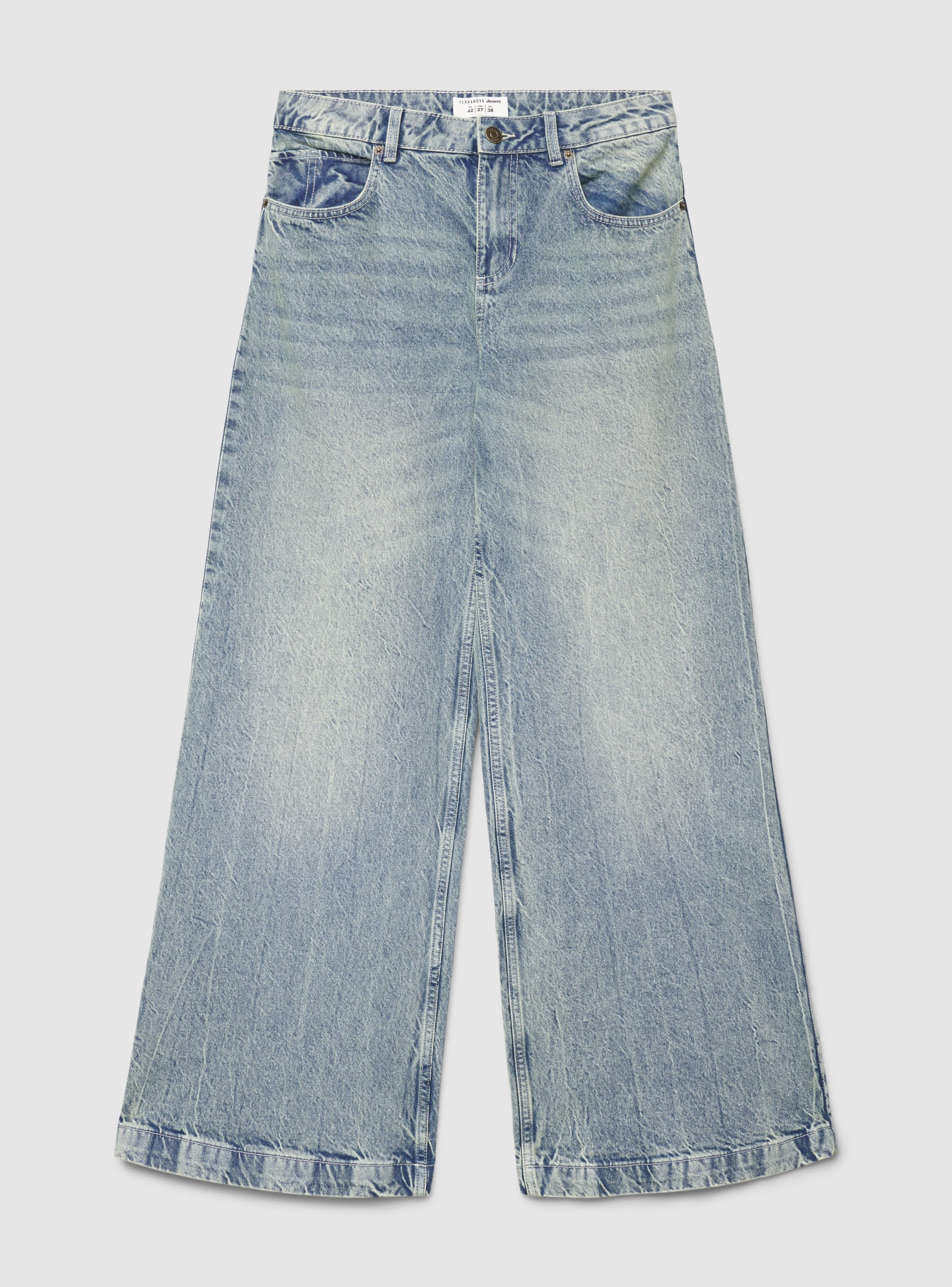 Women's wide-leg jeans with a baggy fit, perfect for casual and urban looks. Long model with a low waist, button and zip closure, and five functional pockets. Solid colour design with a worn wash that enhances the denim. Pair with a fitted t-shirt and sneakers for daytime or with a shirt and sandals for a relaxed yet polished outfit.Details