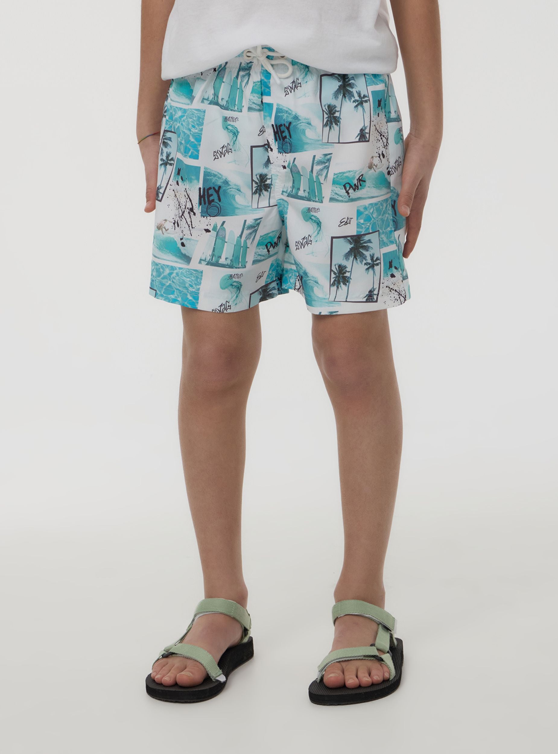 Perfect kids' swim shorts for summer adventures at the beach or pool. The boxer design ensures comfort and freedom of movement, while the adjustable drawstring guarantees an optimal fit. The collage print with surf details creates a dynamic and original look. Ideal to pair with a lightweight t-shirt and flip-flops for a fresh and trendy outfit, perfect for sunny days.Details