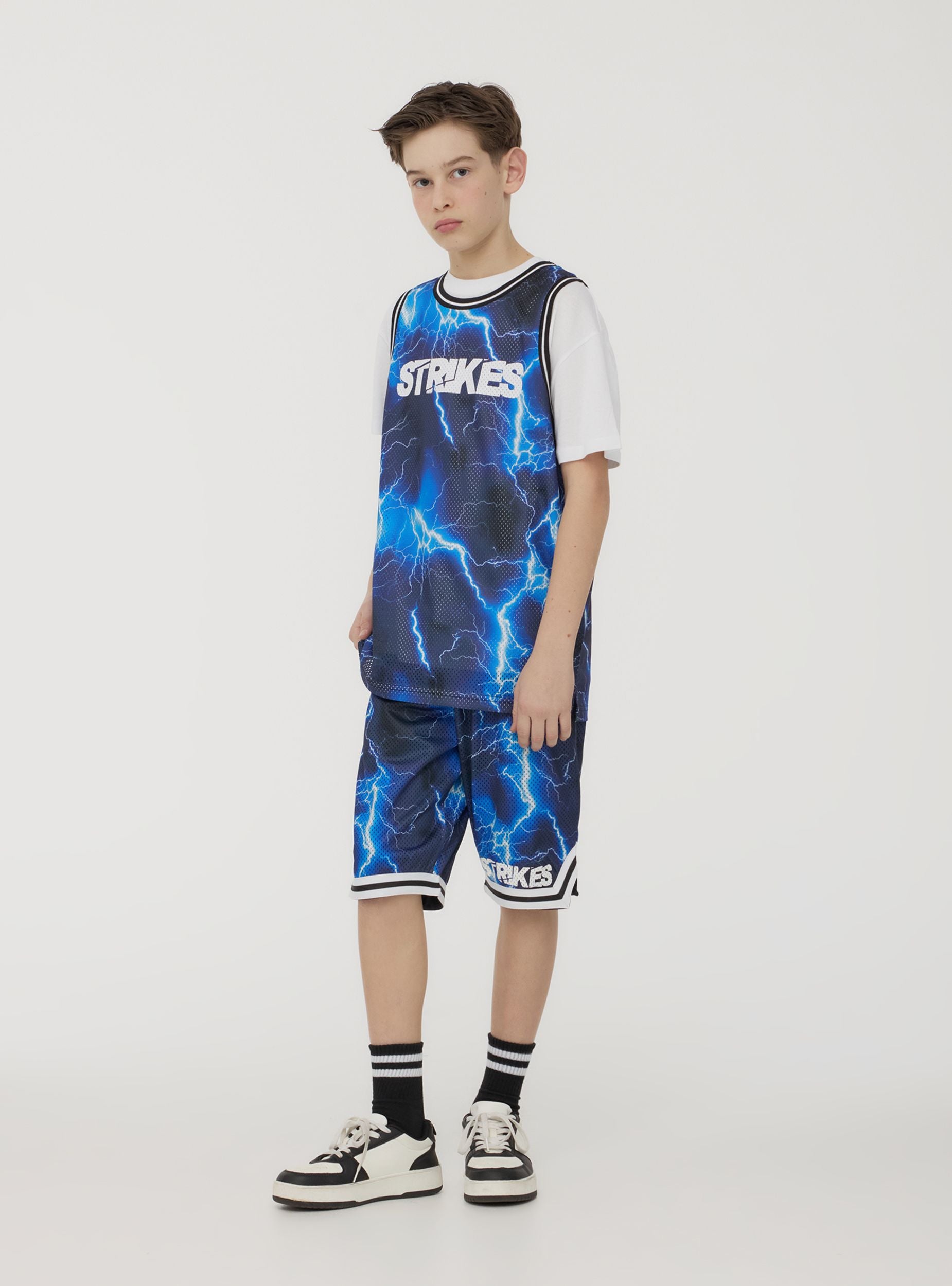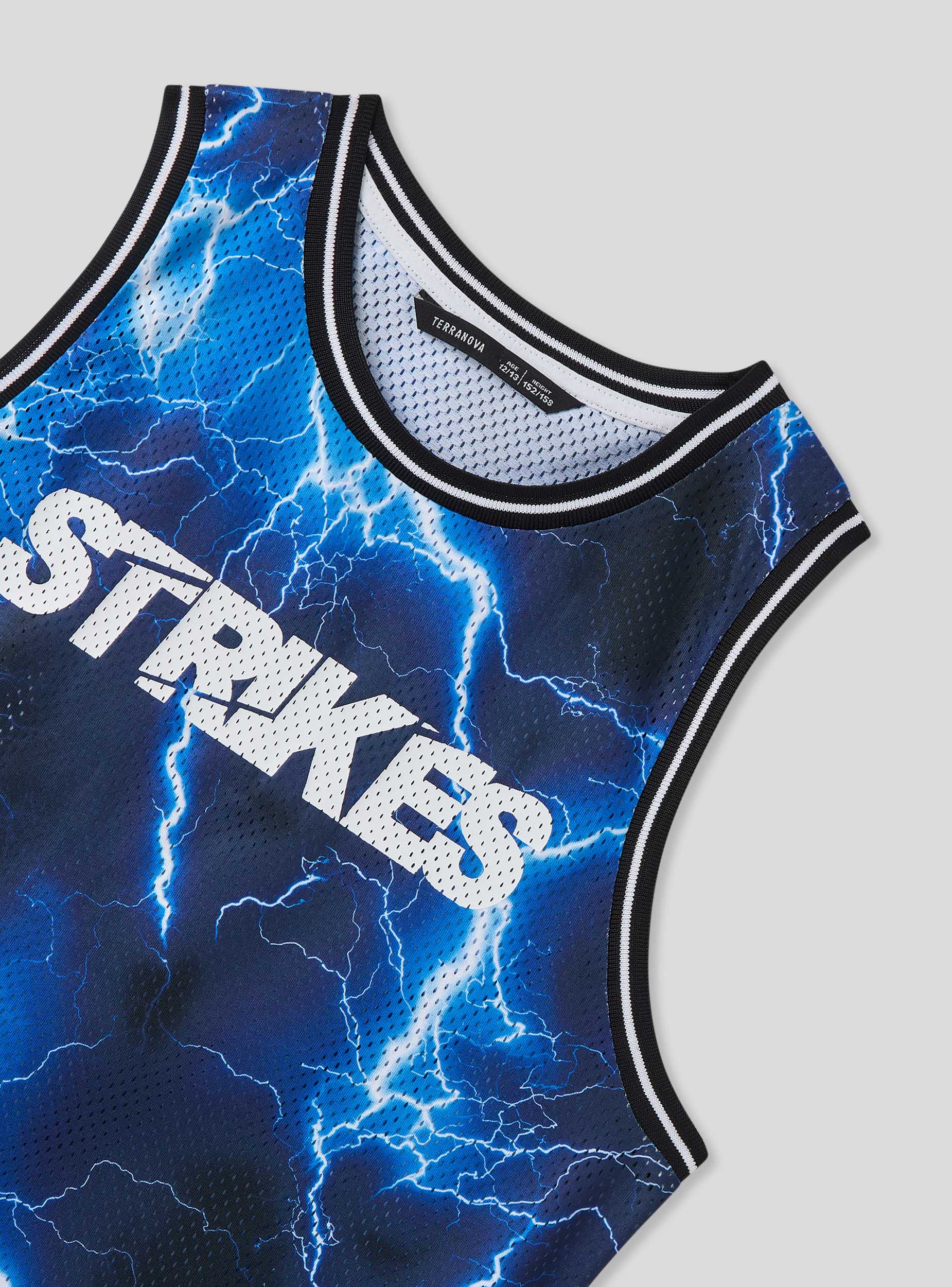 Sleeveless children's vest made from a lightweight mesh fabric that ensures comfort and breathability. The energetic design features a lightning bolt pattern that extends across the entire surface, accompanied by the word "Strikes" on the front. Perfect to pair with sports shorts or jeans for a dynamic look, ideal for outdoor activities or leisure moments.Details