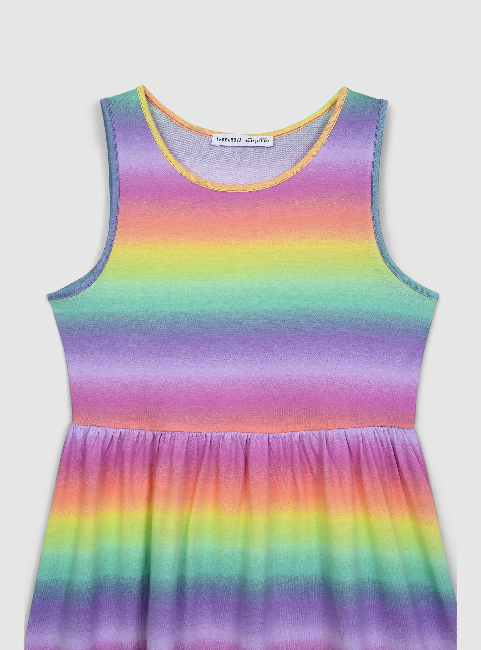 Perfect summer dress for girls, featuring a multicoloured design that adds vibrancy and cheer to every movement. Made from cotton jersey, it is comfortable and lightweight, ideal for accompanying little girls on their daily adventures. The sleeveless cut and full skirt ensure freedom and freshness, making this dress an irresistible choice for those who love to showcase a colourful and fun style.Details