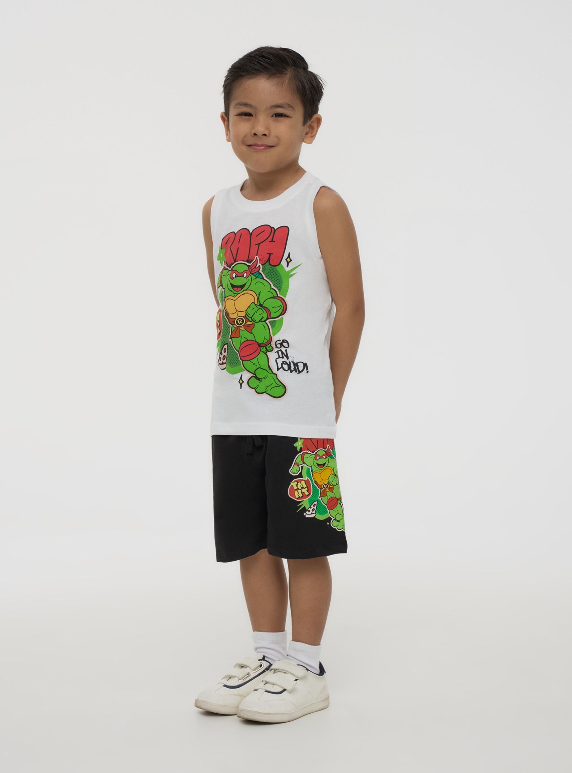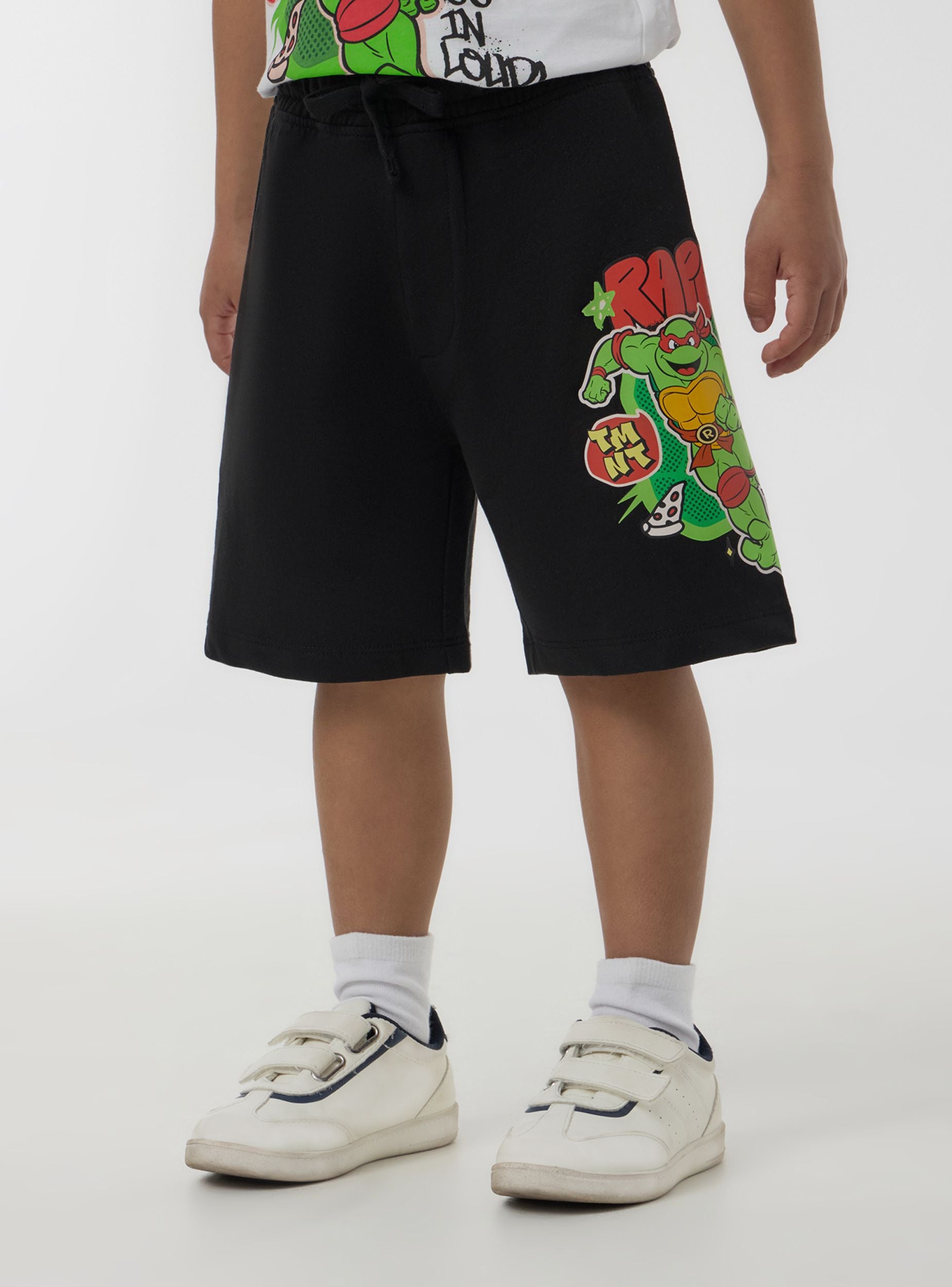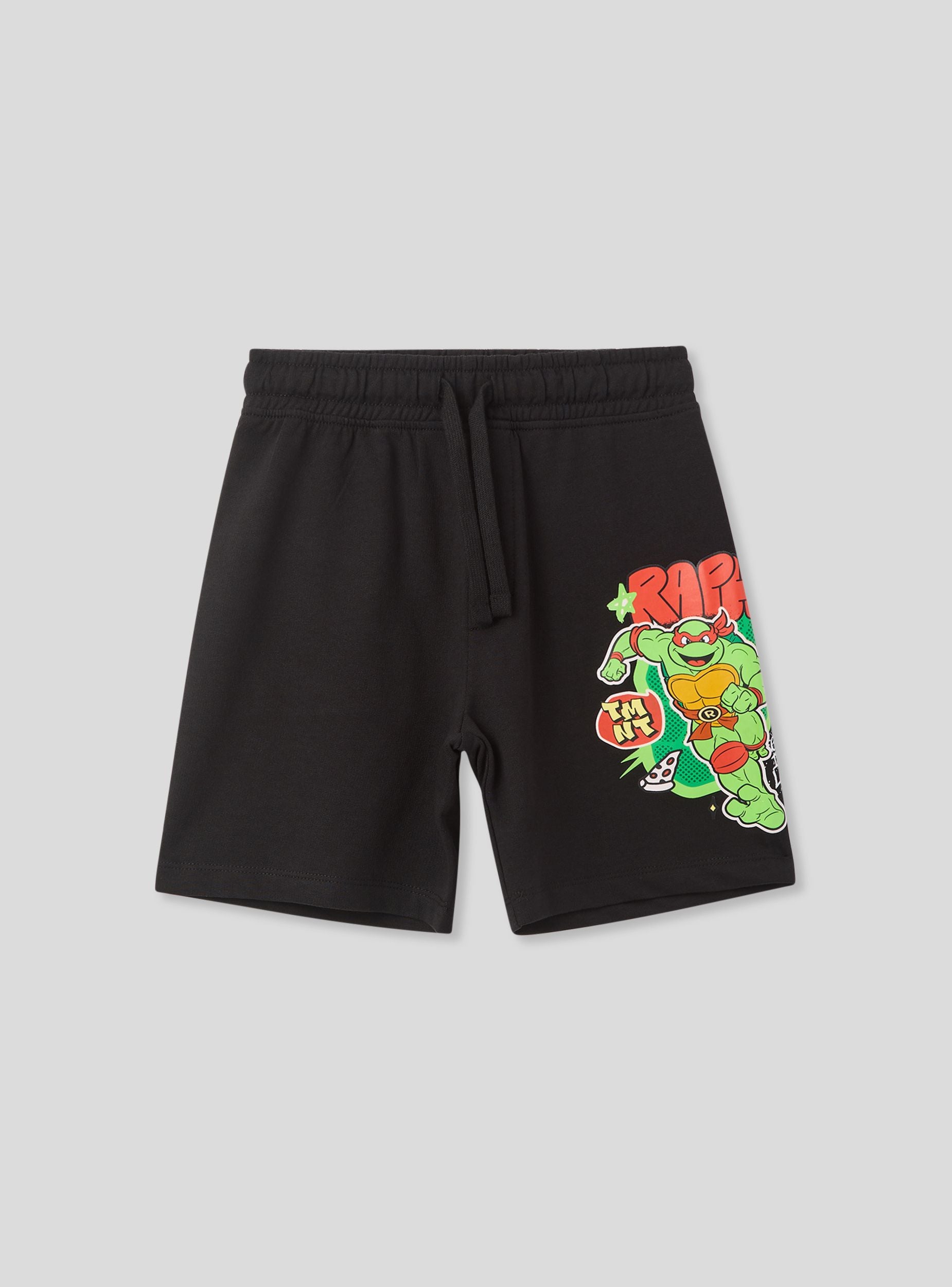 Lightweight children's tracksuit shorts ideal for leisure time and everyday activities, featuring a practical drawstring for an adjustable fit and a functional back pocket. The vibrant Teenage Mutant Ninja Turtles® print adds a dynamic and fun touch, perfect for creating an energetic and comfortable look for any casual occasion.