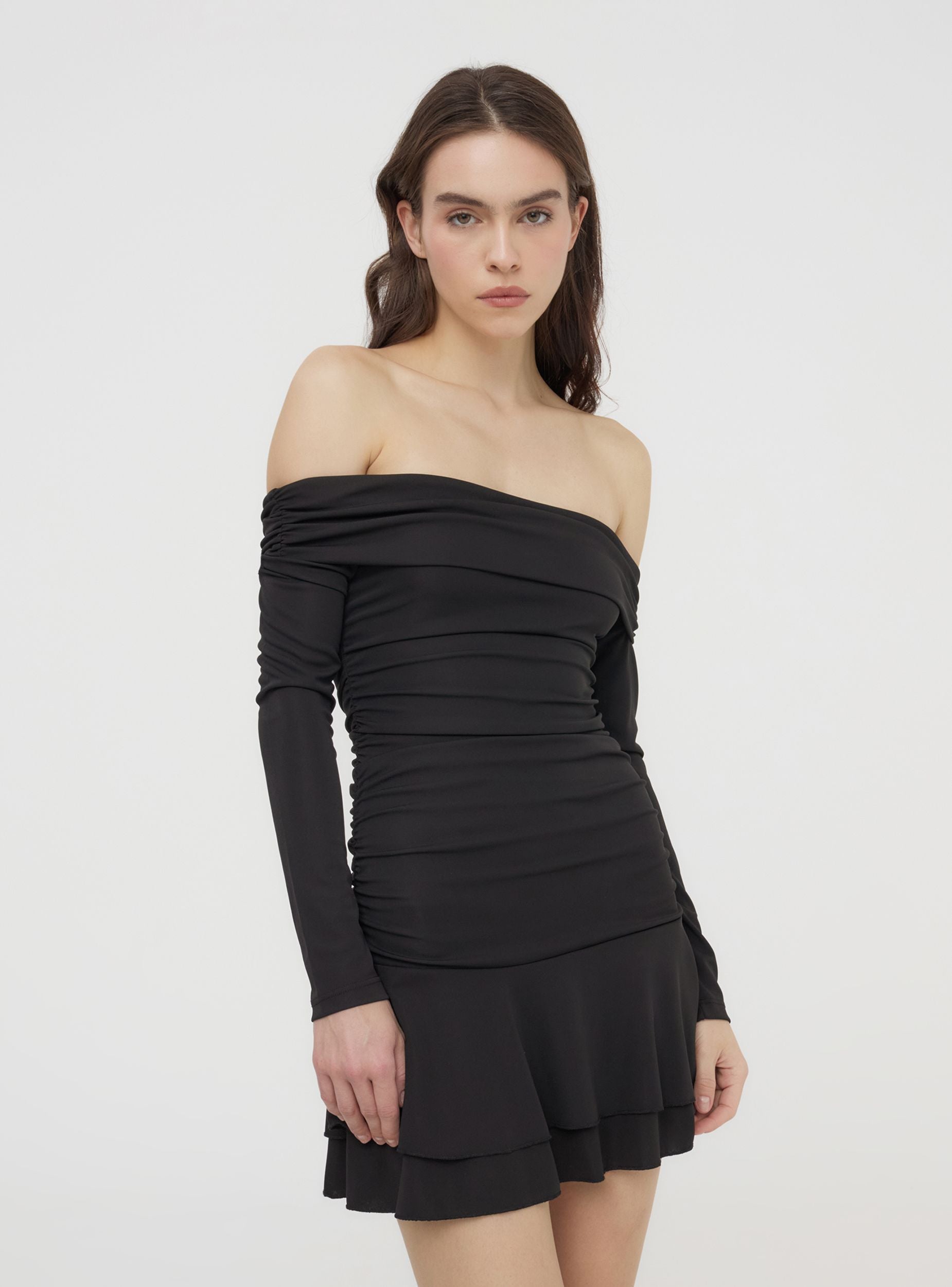 Short women's dress with a seductive line, ideal for special evenings, romantic dinners or glamorous events. The solid colour design enhances the silhouette, while the exposed shoulders add a sophisticated touch. The ruching along the bust accentuates the curves, creating a wrap-around effect. The long sleeves add elegance, while the flounce on the skirt provides movement. Perfect with heels and sparkling accessories.