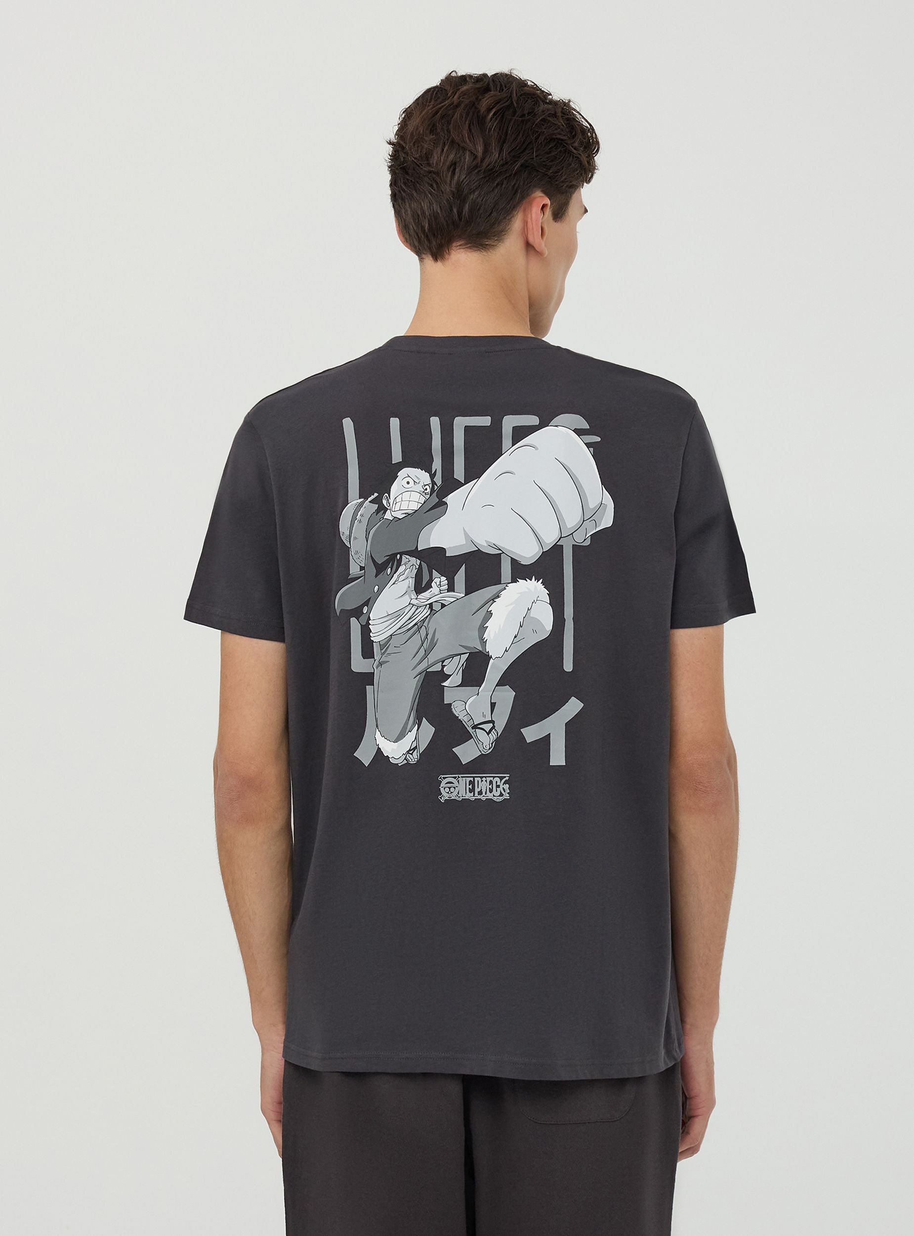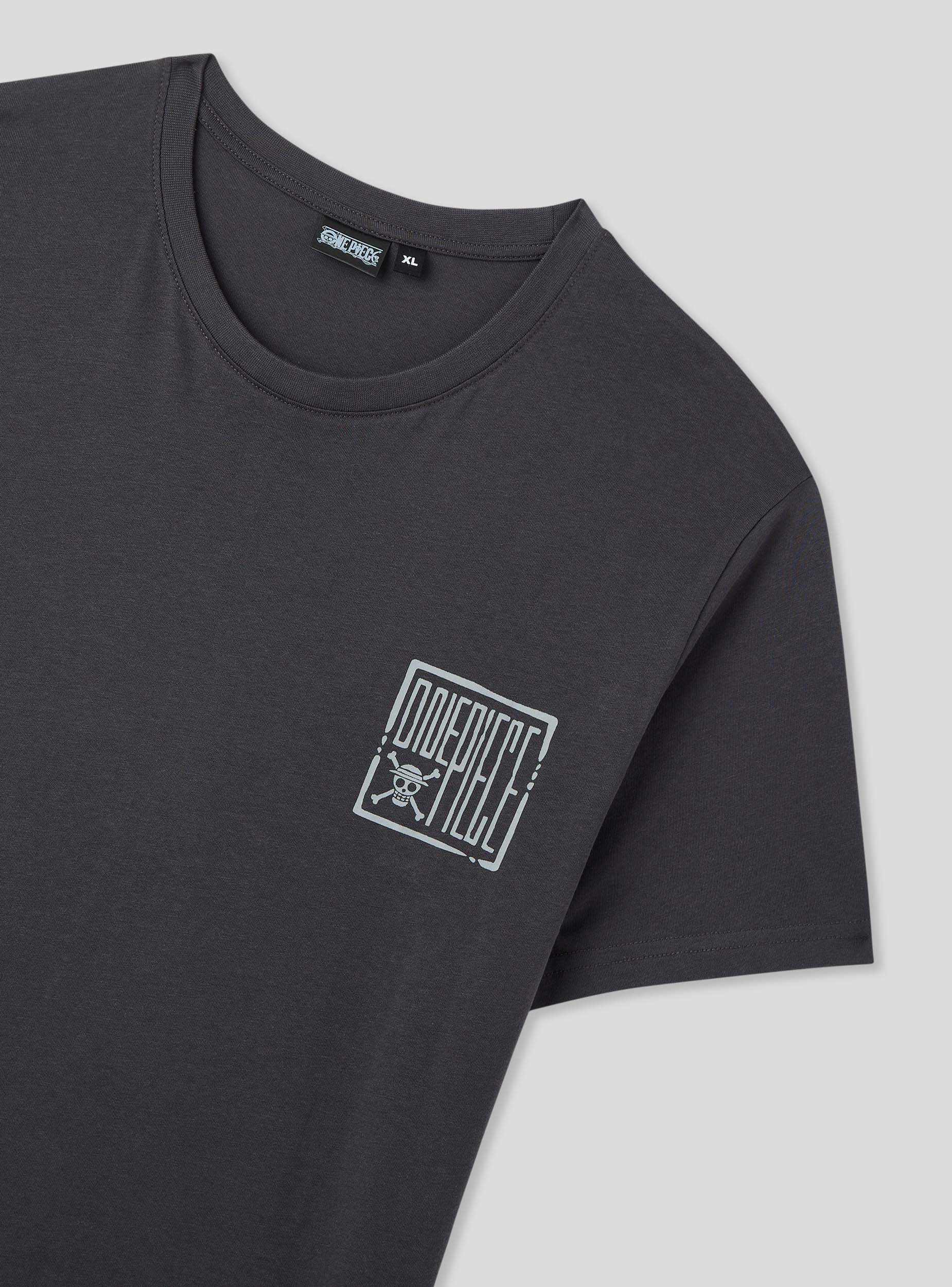 Men's short-sleeved t-shirt with a crew neck and One Piece® print on the front and back, perfect for fans of the saga. The dynamic design makes it ideal for creating casual and streetwear outfits, paired with jeans, cargo pants, or shorts for a bold look. Perfect for leisure time, outings with friends, or days focused on comfort, it adds a distinctive touch thanks to the graphics inspired by the famous anime.Details