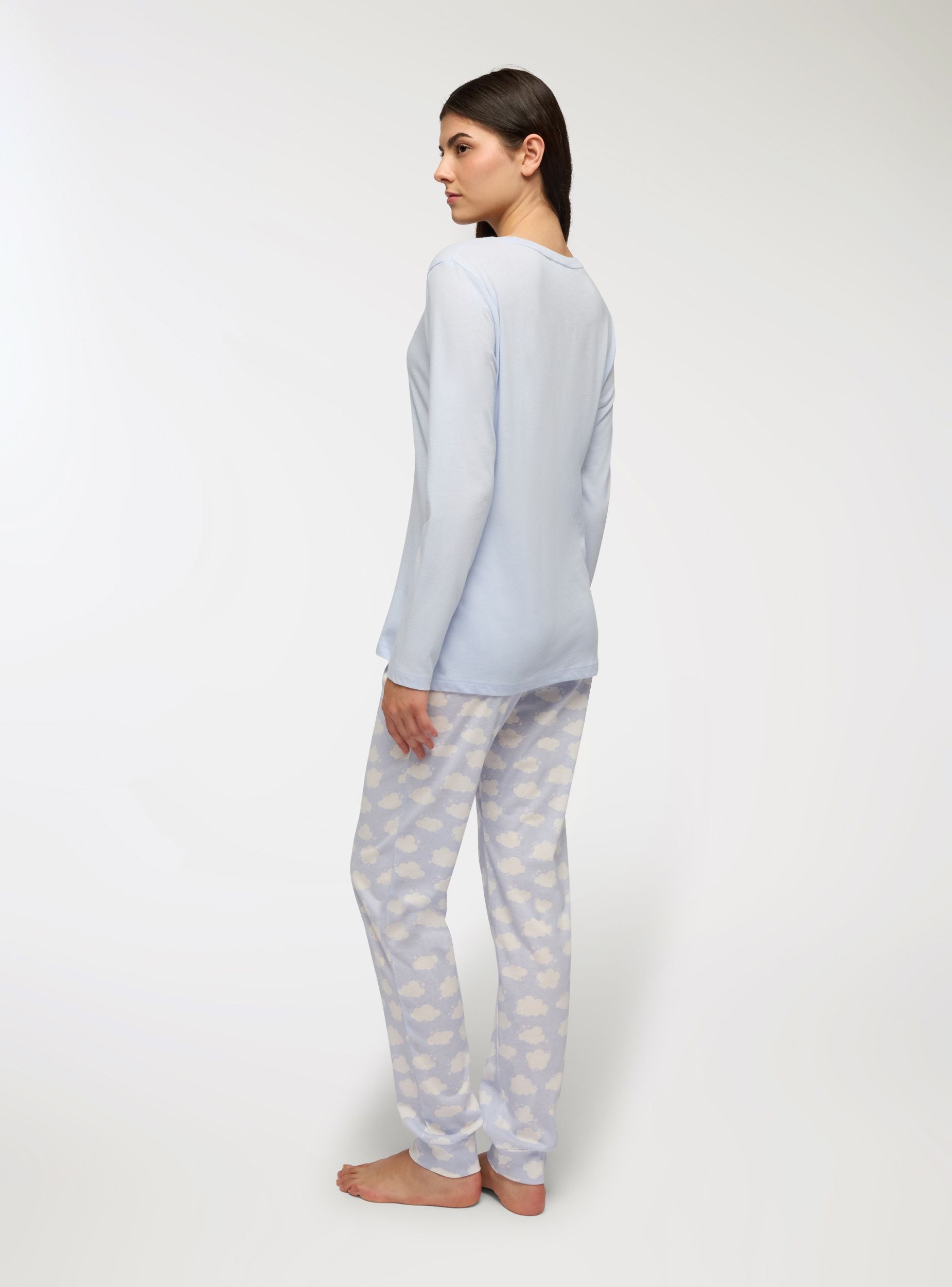 Women's pajama set consisting of a long-sleeved top and long trousers. The top features a print with cute pandas and a decorative inscription, while the trousers are characterised by a cloud pattern. Ideal for moments of relaxation and rest, this pajama offers comfort and style for evenings at home.Details