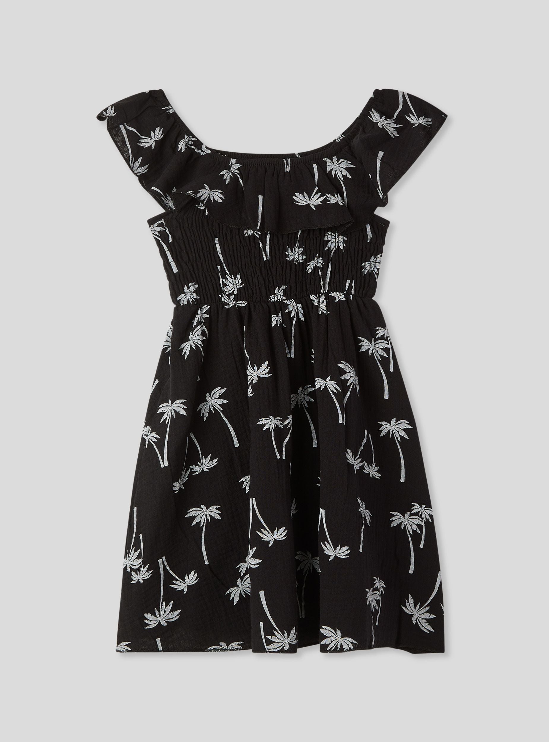 Girls' dress with a crew neck and palm print, ideal for summer days and casual occasions. The comfortable fit and flared design make it perfect for moving freely. The short sleeves add a touch of freshness, while the lively pattern makes it unique and cheerful. Perfect to pair with sandals or trainers for a practical and stylish look.Details