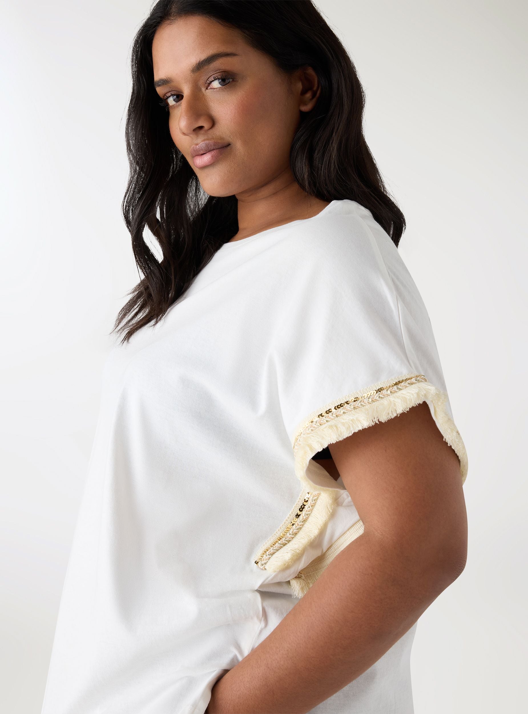 Solid-colour women's T-shirt with a relaxed fit, designed for casual and urban looks. The round neckline and wide kimono-style short sleeves provide comfort and freedom of movement. Sleeve edges with ethnic inserts and fringes add character and enhance outfits with jeans, flowing trousers, or skirts, ideal for everyday wear and leisure time.Details