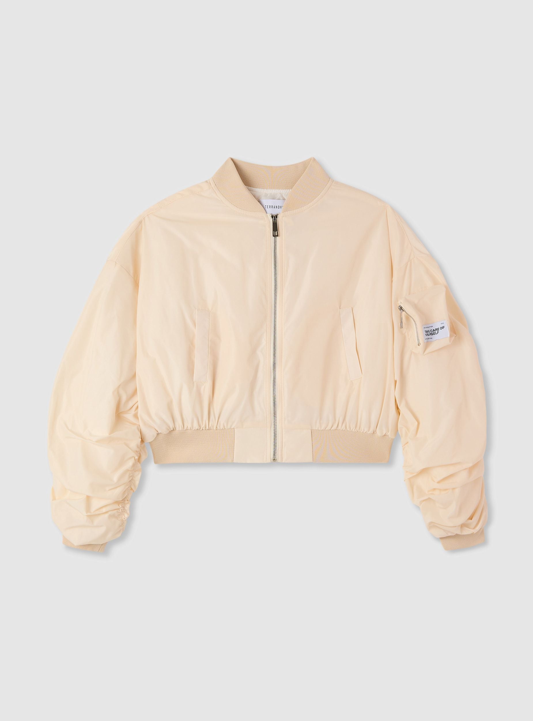 Women's bomber jacket, ideal for an urban and casual look. Long sleeves with text patch. Front zip closure, elasticated hem and cuffs. Two welt side pockets. Cropped fit that enhances a high waist and pairs well with jeans or skirts. Solid colour finish, perfect for seasonal transition.Details