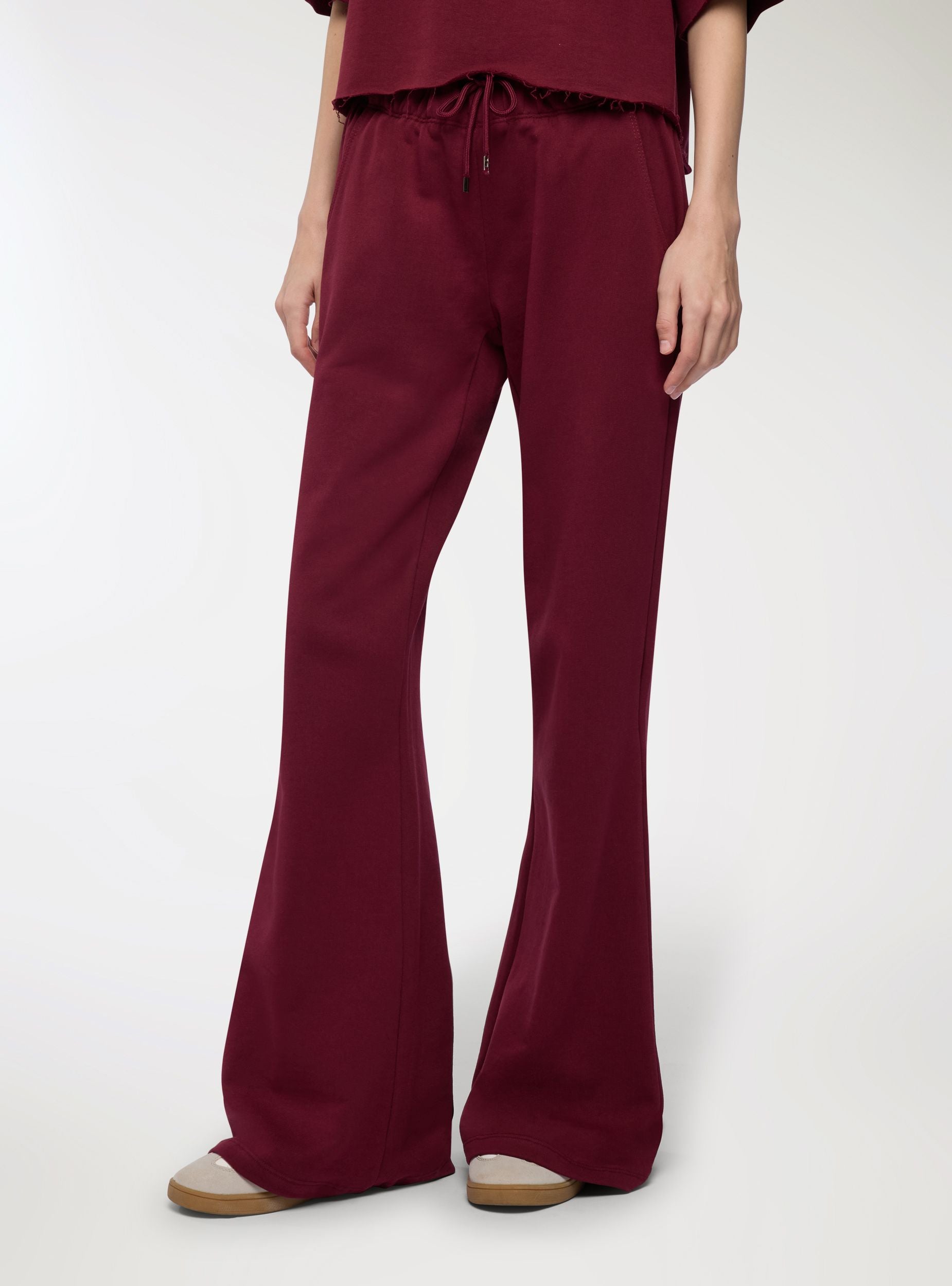 Women's flared sweatpants, ideal for leisure and casual looks. Waist with adjustable drawstring and welt side pockets for practicality. Ankle-length and regular fit that flatters the figure without being restrictive. Perfect with sweatshirts or t-shirts and trainers for comfortable outfits, or with cardigans and tops for a relaxed yet polished touch. Lightweight plain fabric.Details